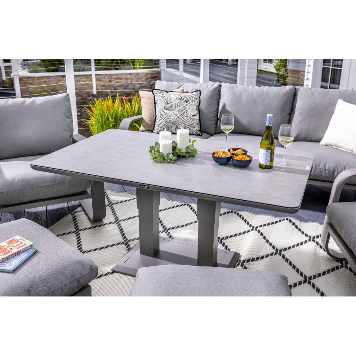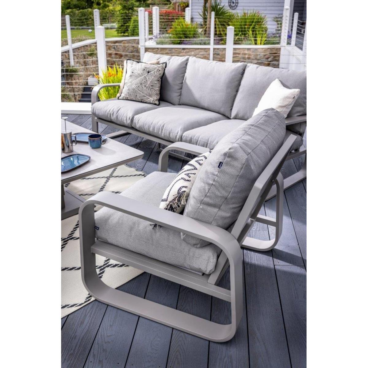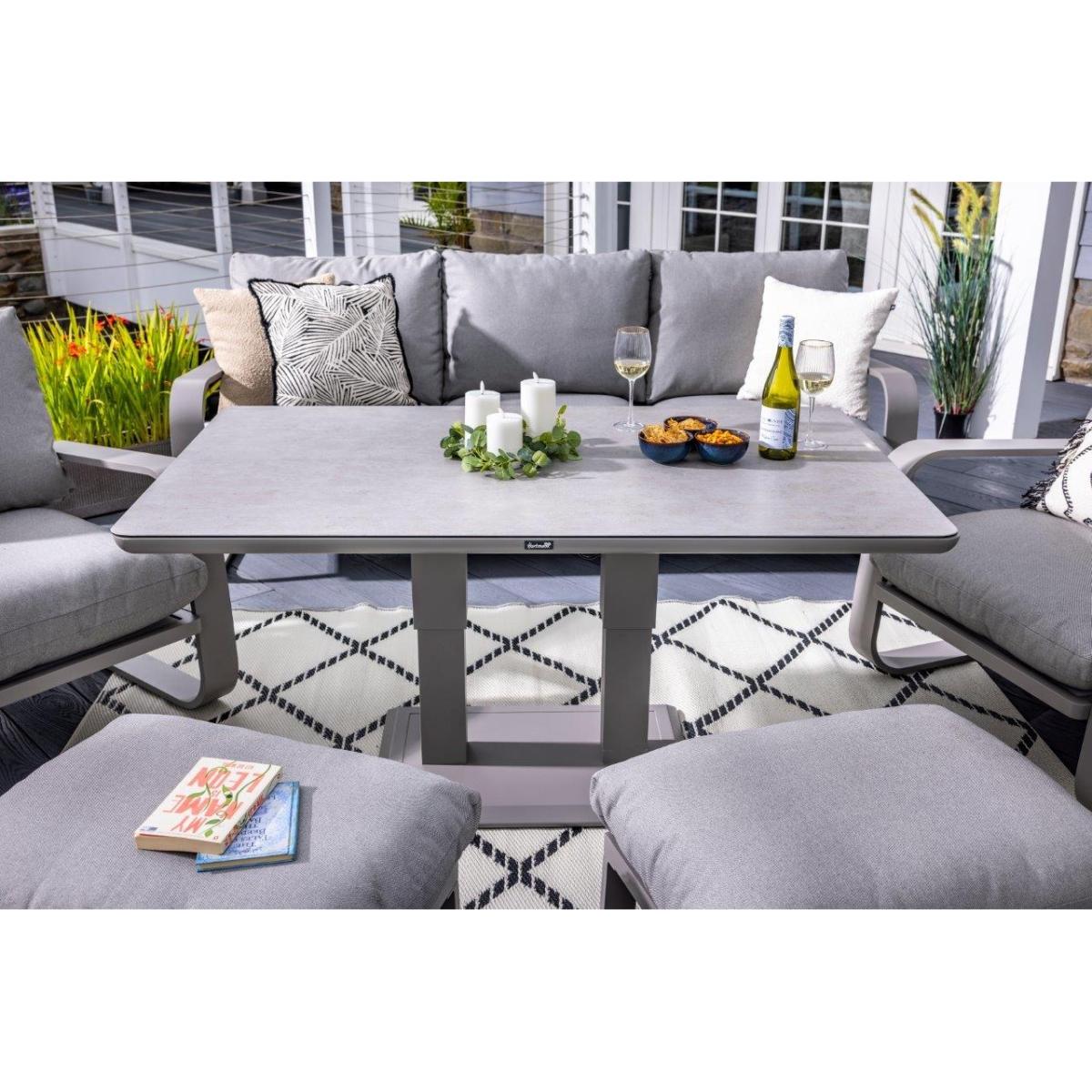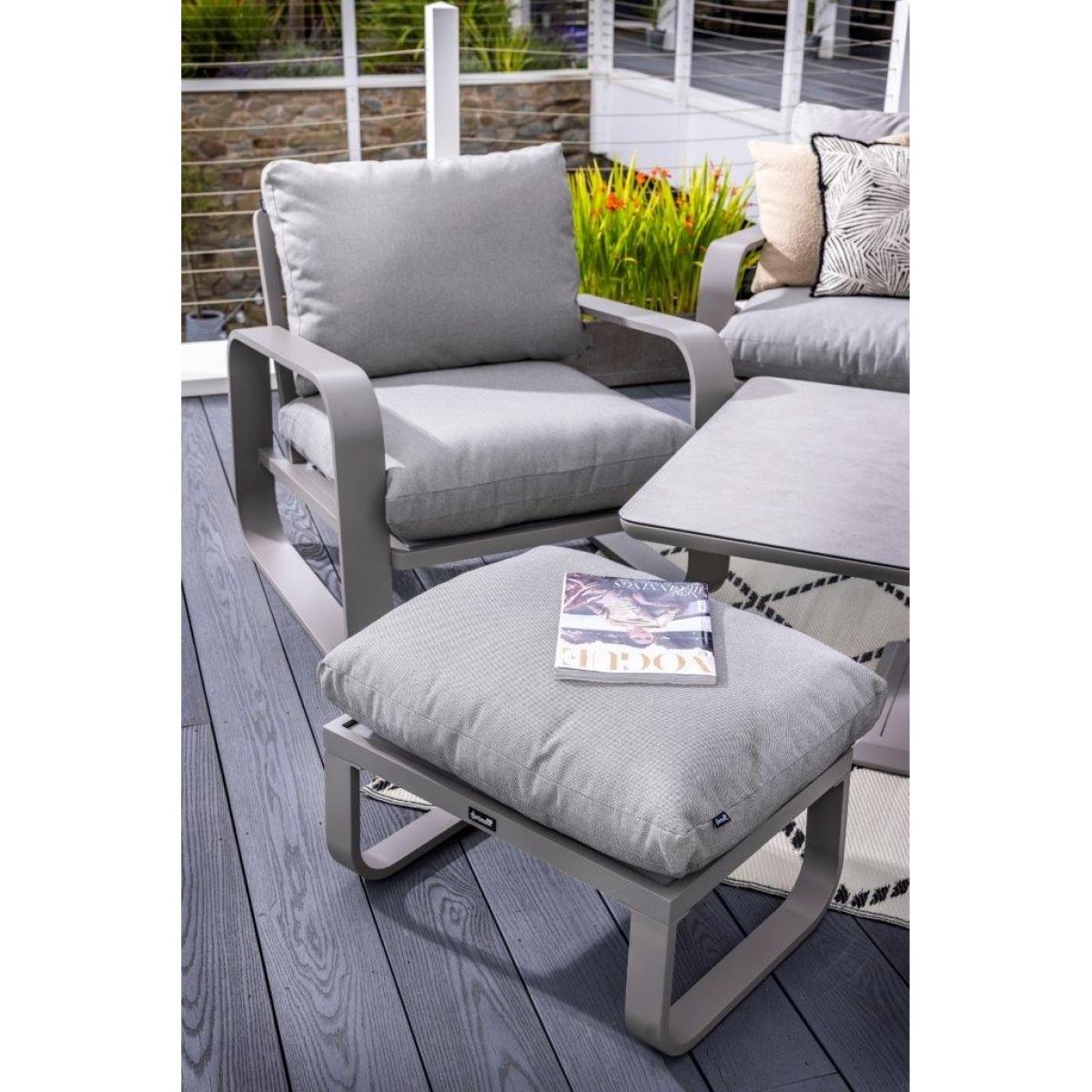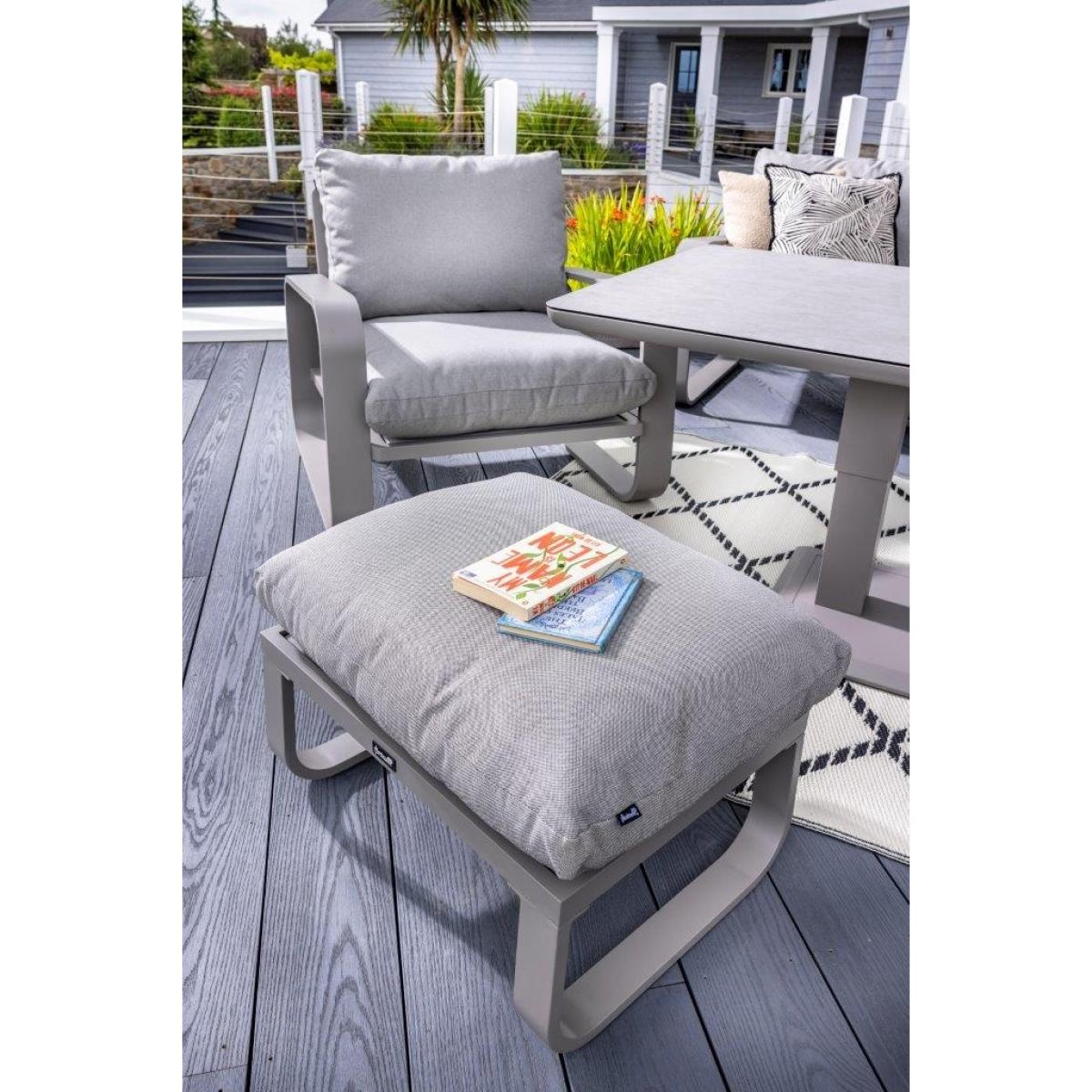 Reimagine your outdoor space as a tranquil and sophisticated haven with the stunning Halo 3 Seat Lounge Set. This stylish set includes a spacious and comfortable three seat sofa, two lounge chairs designed for the ultimate relaxation, and two versatile stools that can be used for additional seating or used as footrests, all featuring pewter ultra-comfy Weatherready® Cloud. Cushions® for maximum relaxation and durability in all weather conditions. The cushions are designed to be water resistant and quick drying, making them perfect for outdoor use. The sets curved taupe frame adds a sophisticated touch that seamlessly blends with any decor, enhancing the aesthetic appeal of your outdoor space. Additionally, the set includes an adjustable table with a taupe powder coated aluminium frame and patina Tuscan ceramic glass tabletop. This combination ensures the table is both lightweight and durable, making it easy to move and weather resistant for the unpredictable British weather. Assembly is required: This set requires self-assembly, all fittings are supplied. KEY FEATURES: Set includes: 1x 3 Seat Sofa, 1 x Rectangular Adjustable Table, 2 x Lounge Chairs, 2x Stools Tuscan Ceramic Glass is both practical and beautiful, tempered for safety, easy to clean, heat and scratch resistant Weatherready® Cloud. Cushions® are hardwearing & easy to clean, store away in Autumn & Winter Adjustable table feet to ensure perfect positioning on uneven surfaces Crafted from aluminium; rust free, lightweight, strong, durable & low maintenance Requires simple self-assembly - all fittings supplied The furniture can be left outside all year round - except cushions Protect and extend the life of your furniture by using a cover - remove cushions if being covered for prolonged periods (to prevent mould and mildew build-up) 3 years limited manufacturer warranty - register your warranty to extend to a 5 year warranty Frame Finish: Taupe Cushion Colour: Pewter Table Top Colour: Patina DIMENSIONS: Overall Footprint: 2.8m x 4m Adjustable Table: Height: 51cm or 74cm Width: 90cm Depth: 150cm 3 Seat Lounge Sofa: Height: 83cm Width: 93cm Depth: 230cm Lounge Chair: Height: 83m Width: 93cm Depth: 90cm Stool: Height: 30.5m Width: 48cm Depth: 65cm Please note, all screens vary in colour reproduction and whilst every effort has been made to display the colour as accurately as possible it is for guidance only. Scatter cushions and accessories pictured are for demonstration purposes only and are not included.