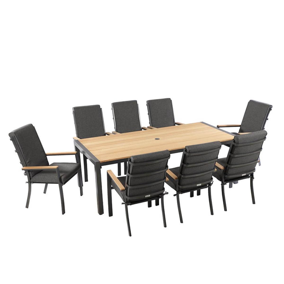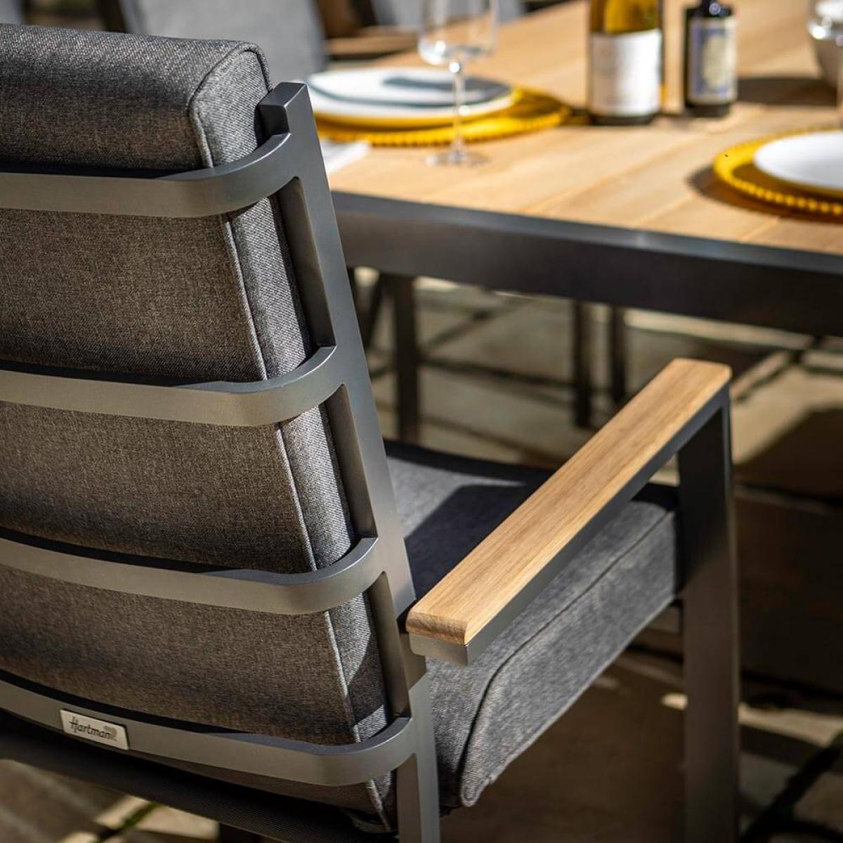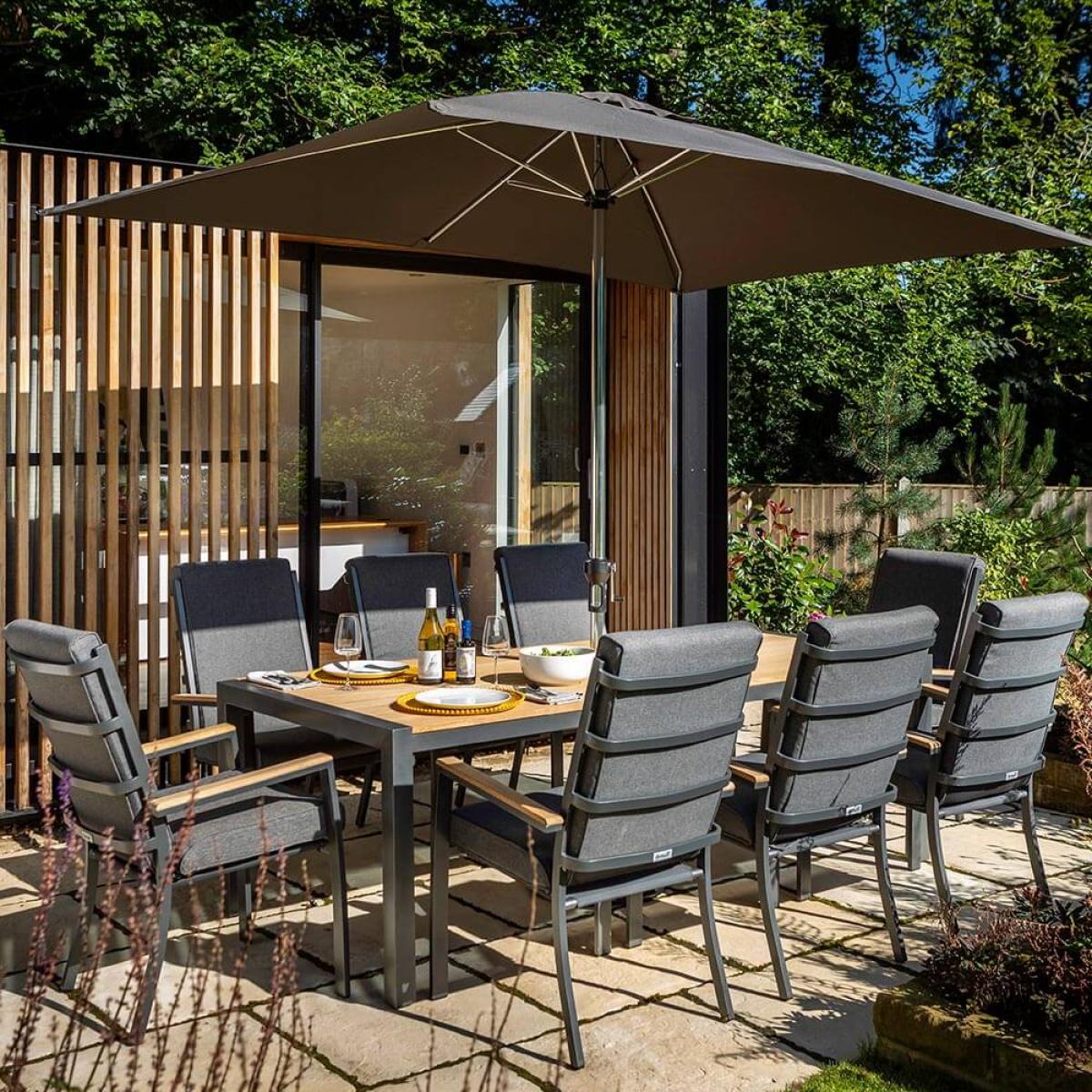Set consists of:. About:. Minimalistic yet superbly filling of space and with a high capacity of 8 people, the Hartman Singapore 8 Seat Rectangular Garden Dining Set offers a beautifully refined setting to enjoy alfresco moments outdoors this year. With a fabulous composition of teak hardwood combined with aluminium this mixed material set features modern touches aplenty and practicality inbuilt. Find 8 high back Hartman Singapore dining chairs, these come with a supportive ribbed back design that hold high back cushions and boast teak wood armrests for comfort and style. Comfort is a certainty, perfect for hours of socialising. The fantastically thick filled Weatherready® cushions accompany the dining chairs, with a seat cushion that is held by a taut sling design. These cushions are light rain shower and flash downpour resistant, whereas anything heavier or more consistent will eventually permeate and drain through the cushions layers,drying naturally over timedepending on local weather conditions. Store these in the winter months for best care. This aluminium constructed Hartman outdoor furniture boasts a teak hardwood tabletop which is not only supremely attractive but also durable and easy to clean. It is inlaid tastefully within the frame of the aluminium so that it runs to the longer side edges and is bordered at its shorter edges. To keep your garden lunches or afternoon socialising nice and cool there’s a 3 metre diameter parasol, this is easily retracted and unwound with the crank handle located on its shaft. This Hartman outdoor furniture will become a new hub for any garden and owing to its undeniable sleek contemporary style will suit many stylish outdoor spaces from decking to patios and verandas. Key features:. Although aluminium furniture is by nature resistant and ready for the outdoors to best shield your furniture from tree debris, bird droppings or simply to keep it tidied away we recommend the use of a protective cover, below is a link to the specific fitting Hartman protective cover to be purchased separately:.
