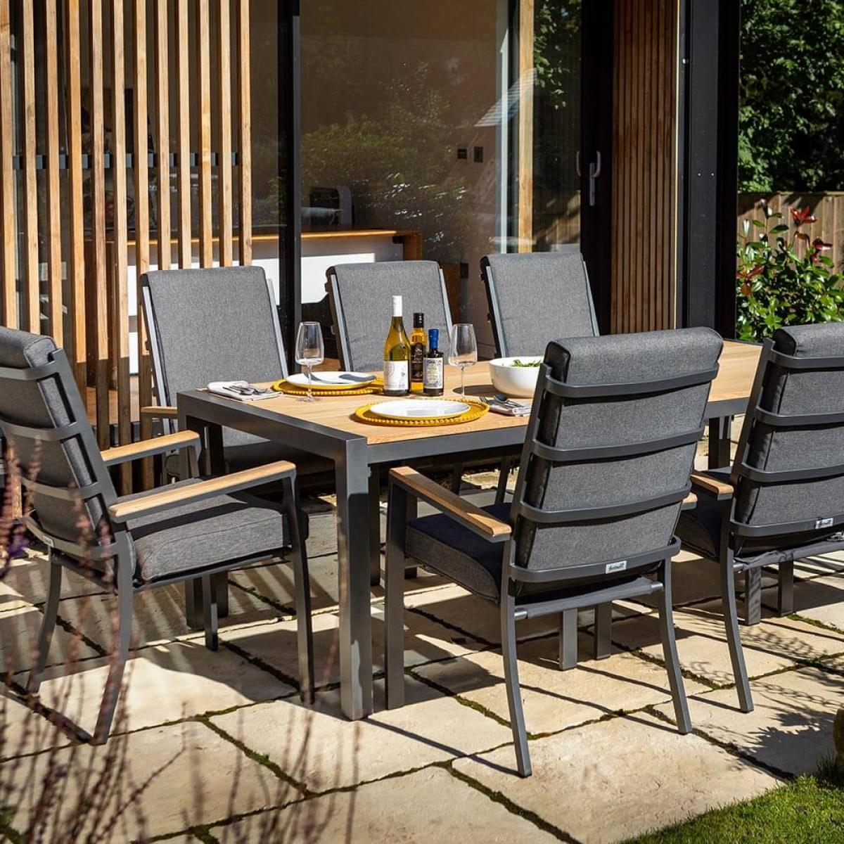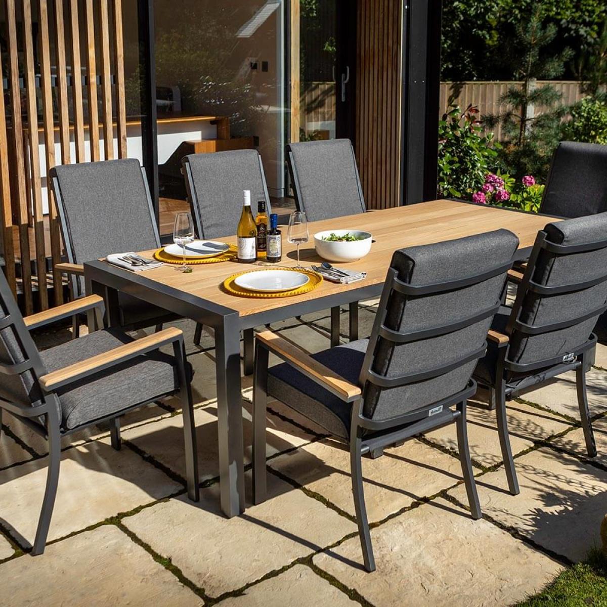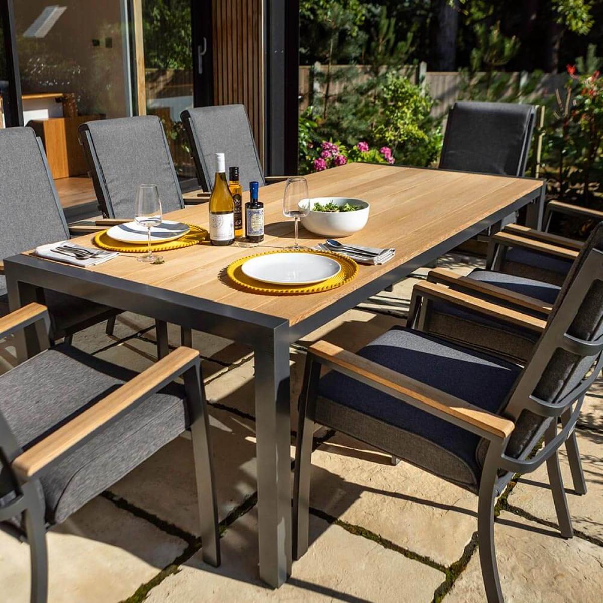 Set consists of:. About:. Minimalistic yet superbly filling of space and with a high capacity of 8 people, the Hartman Singapore 8 Seat Rectangular Garden Dining Set offers a beautifully refined setting to enjoy alfresco moments outdoors this year. With a fabulous composition of teak hardwood combined with aluminium this mixed material set features modern touches aplenty and practicality inbuilt. Find 8 high back Hartman Singapore dining chairs, these come with a supportive ribbed back design that hold high back cushions and boast teak wood armrests for comfort and style. Comfort is a certainty, perfect for hours of socialising. The fantastically thick filled Weatherready® cushions accompany the dining chairs, with a seat cushion that is held by a taut sling design. These cushions are light rain shower and flash downpour resistant, whereas anything heavier or more consistent will eventually permeate and drain through the cushions layers,drying naturally over timedepending on local weather conditions. Store these in the winter months for best care. This aluminium constructed Hartman outdoor furniture boasts a teak hardwood tabletop which is not only supremely attractive but also durable and easy to clean. It is inlaid tastefully within the frame of the aluminium so that it runs to the longer side edges and is bordered at its shorter edges. To keep your garden lunches or afternoon socialising nice and cool there’s a 3 metre diameter parasol, this is easily retracted and unwound with the crank handle located on its shaft. This Hartman outdoor furniture will become a new hub for any garden and owing to its undeniable sleek contemporary style will suit many stylish outdoor spaces from decking to patios and verandas. Key features:. Although aluminium furniture is by nature resistant and ready for the outdoors to best shield your furniture from tree debris, bird droppings or simply to keep it tidied away we recommend the use of a protective cover, below is a link to the specific fitting Hartman protective cover to be purchased separately:.