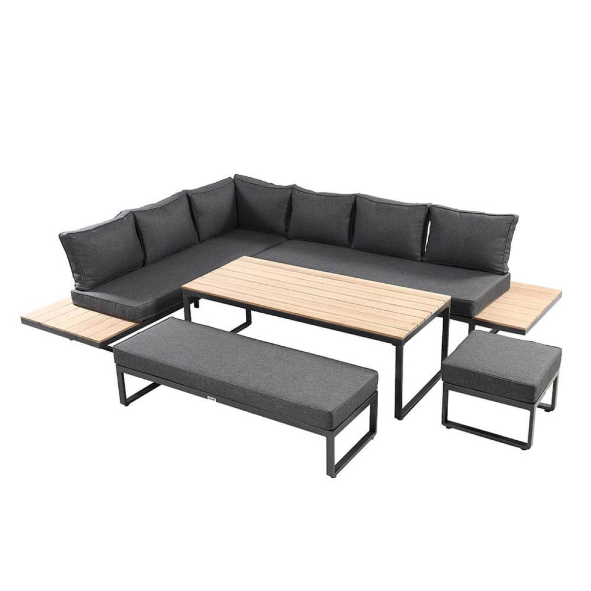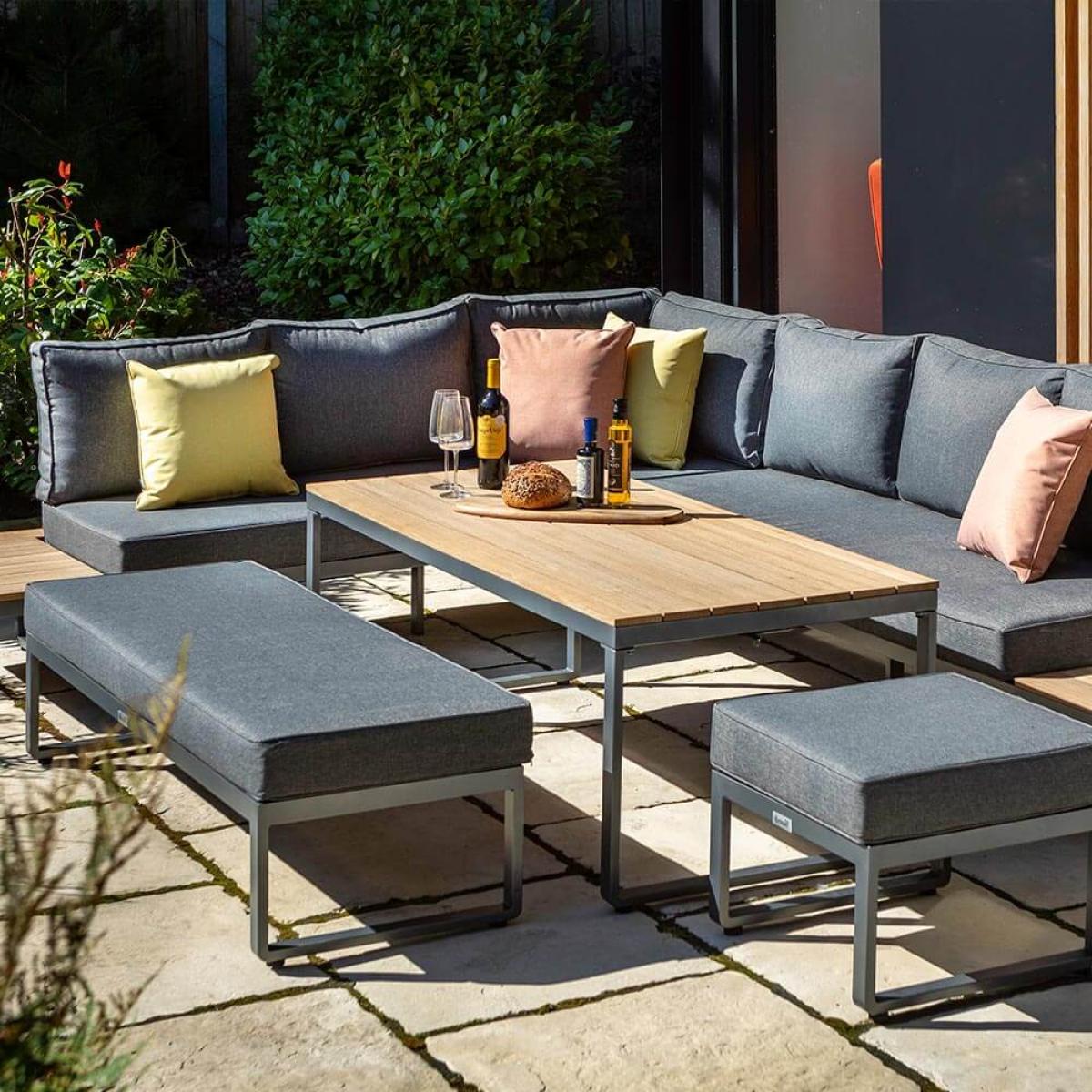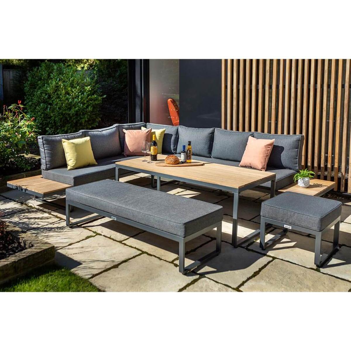 Set consists of:. About:. Relish the finer weather with company on this spacious and stylish Hartman Singapore Rectangular Corner Platform Casual Dining Set. This aluminium constructed Hartman outdoor garden furniture is actually a wonderful combination of the loved garden metal with hardwood teak tabletops, and to wonderful effect! The teak is proudly inlaid to the long rectangular dining table whilst is also fitted to the two ingenious platform side tables to be found at the corner sofa’s ends, respectively. Surfaces for dining and casual drinks are therefore not in short supply. This sociable design is not only fabulous for these reasons but the contemporary sleek and slimline frame being made from powder coated aluminium means it will integrally hold out against the elements, never rusting. The long left comfortable corner unit sofa will become the setting for hours of lounging, splayed out reading and alfresco casual dining with company. This Hartman furniture offers a capacity of 8 able to sit comfortably. A befitting dark shade of grey used on the metal, combined with the slate design of the cushions and teak wood, make for a lovely neutral Hartman outdoor furniture set that will slot into many gardens with the least of fuss. The deep fill cushions across the corner sofa, stools and bench respectively provide a supremely comfortable sitting experience. These cushion covers are made from a Weatherready® material, so can withstand light rain showers and flash downpours. Anything heavier or more consistent will simply pass through the purposely permeable layers and air-dry when the weather brightens and the conditions lend themselves to it. Just be sure to store these cushions for the winter months. We foresse this handsome Hartman aluminium garden furniture becoming the setting to many social days and evenings filled with good food, drink and company. Key Features:. Although aluminium furniture is by nature resistant and ready for the outdoors to best shield your furniture from tree debris, bird droppings or simply to keep it tidied away we recommend the use of a protective cover, below is a link to the specific fitting Hartman protective cover to be purchased separately:.