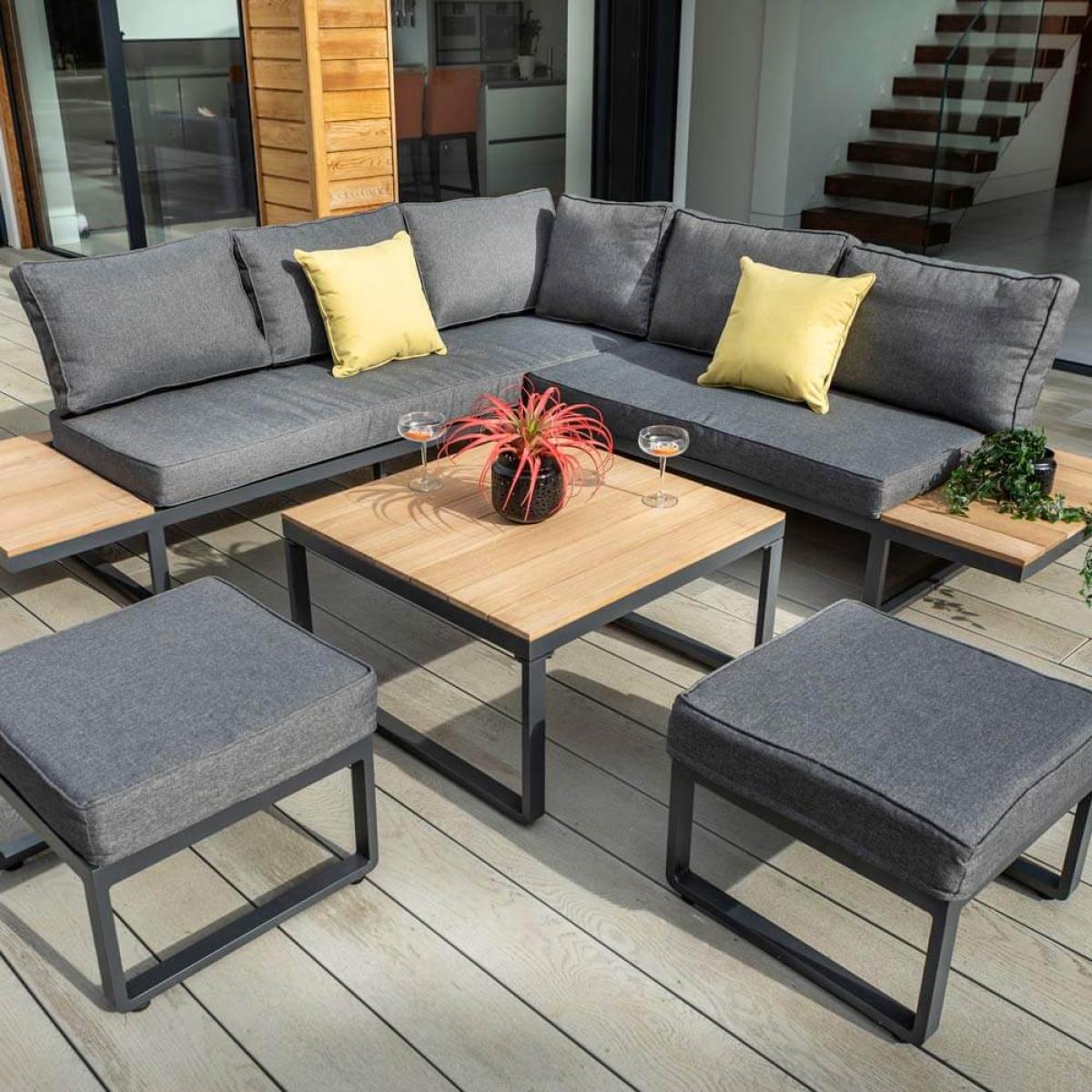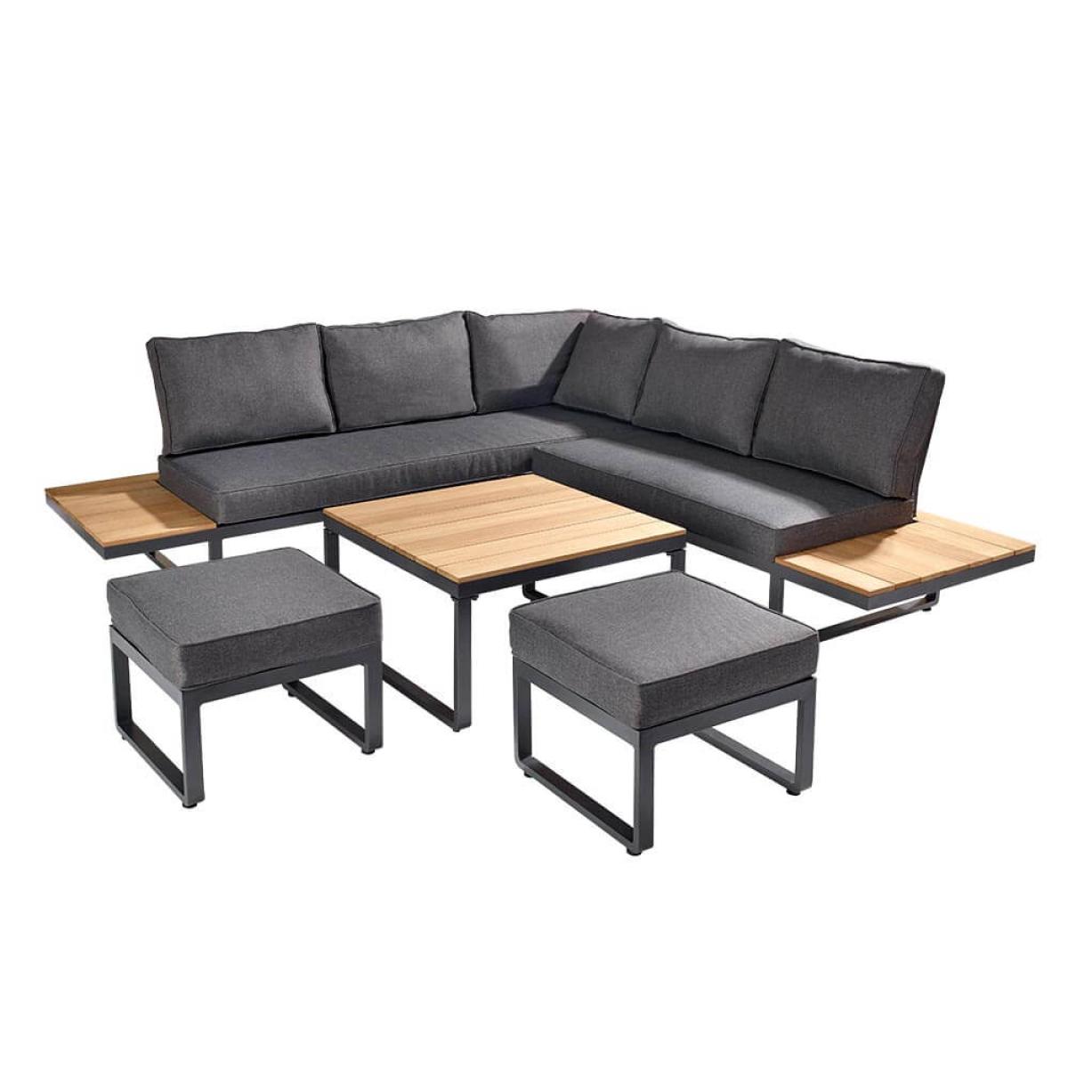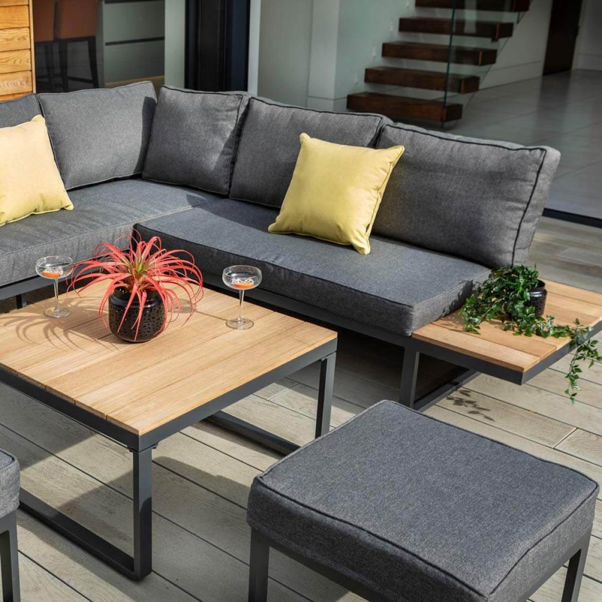 Set consists of:. About:. Splay out, casually dine, sip a cocktail, gather friends, read a book or simply sit and absorb the fine weather; all of these garden pursuits, and more, are suited to the wonderfully stylish Hartman Singapore Square Corner Platform Casual Dining Set. This finely styled Hartman outdoor garden furniture is capable of seating 6 people and is equipped for all things alfresco-casual. Find two ingenious platform side tables built onto the ends of the corner sofas, respectively. These tables are topped with the same teak hardwood that’s to be found on the small square coffee table, this material doesn’t just look fantastic but is also incredibly hard wearing and easy to clean. The entire Hartman outdoor furniture set is finished in a powder coated aluminium and therefore benefits from an integral repellency to the elements, this. The comfortable corner unit sofa is supremely comfortable for hours of outdoor relaxing and dining enjoyment with family or friends. This Hartman furniture comes equipped with cushion sets covered in their Weatherready® material, a system that’s inbuilt to withstand light rain showers and flash downpours. Any heavier or more consistent wet weather will simply pass through the purposely permeable layers and air-drying over time with airy lighter and brighter conditions. We just advise these are stored indoors during the winter or for consistently poor weather windows. The two accompanying stools are also topped with these thick fill slate cushions, meaning all seated will be happy for hours of garden enjoyment. Key Features:. Although aluminium furniture is by nature resistant and ready for the outdoors to best shield your furniture from tree debris, bird droppings or simply to keep it tidied away we recommend the use of a protective cover, below is a link to the specific fitting Hartman protective cover to be purchased separately:.