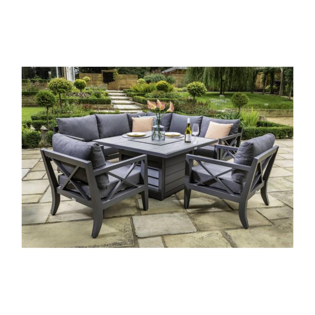 Hartman's Sorrento Square Casual Dining Set with Gas Fire Pit and Lounge Chairs is a contemporary square set offering great comfort and entertaining space for your friends and family. The classic cross bar framework adds timeless style to the furniture, lending its beauty and patio appeal. The Sorrento seating comes complete with slate coloured Weatherready permeable cushions that can be left outside all summer long. Central to the set is the fire pit table which comes with a Rustic Grey Tuscan ceramic glass top. Tuscan Ceramic Glass is both practical and beautiful, tempered for safety reassurance, easy to clean and scratch resistant. Dine informally and spaciously on the full glass table top, then as the sun goes down or as the nights turn chilly, remove the small ceramic glass insert and enjoy a central ambient heat and glow from a click of a button, make the most of the outdoors for longer with your guests. This square casual dining set comfortably seats a minimum of 6 people with its corner sofa and 2 additional generously sized lounge chairs. Be prepared for the unpredictable British summer with Hartman's Weatherready slate-coloured permeable cushions. During the summer showers, the water-resistant fabric simply allows water to bead and run off the cushion. During heavier persistent rain the Weatherready technology allows water to penetrate through the cushions sewing seams. Any water that penetrates the surface will flow through the permeable fibres, fully exiting through the mesh base beneath. Drying time will vary depending on local conditions. Come rain or shine, Hartman Weatherready cushions can be left outside all summer long. We do recommend they are stored away in a clean, dry garage or outbuilding during autumn and winter. The Sorrento's frame is crafted from aluminium, which is rust free, lightweight, strong, and durable, requiring little maintenance. Protect and extend the life of your furniture by using a Hartman cover designed specifically for this set. We recommend cushions are removed if the set is being covered for prolonged periods, to prevent mould and mildew build-up.