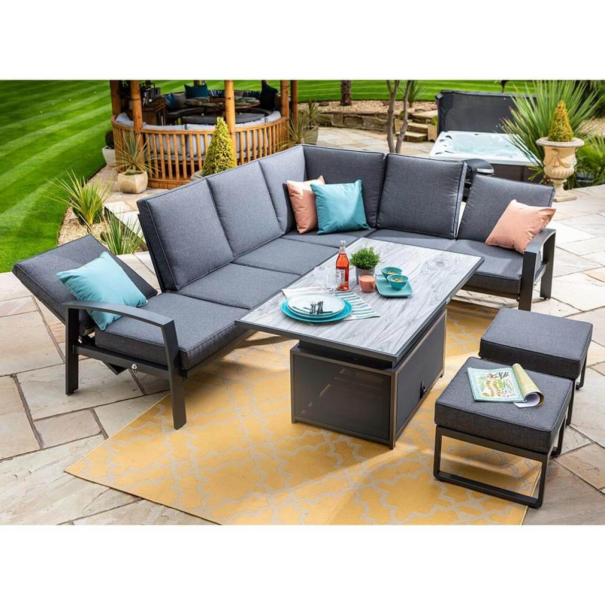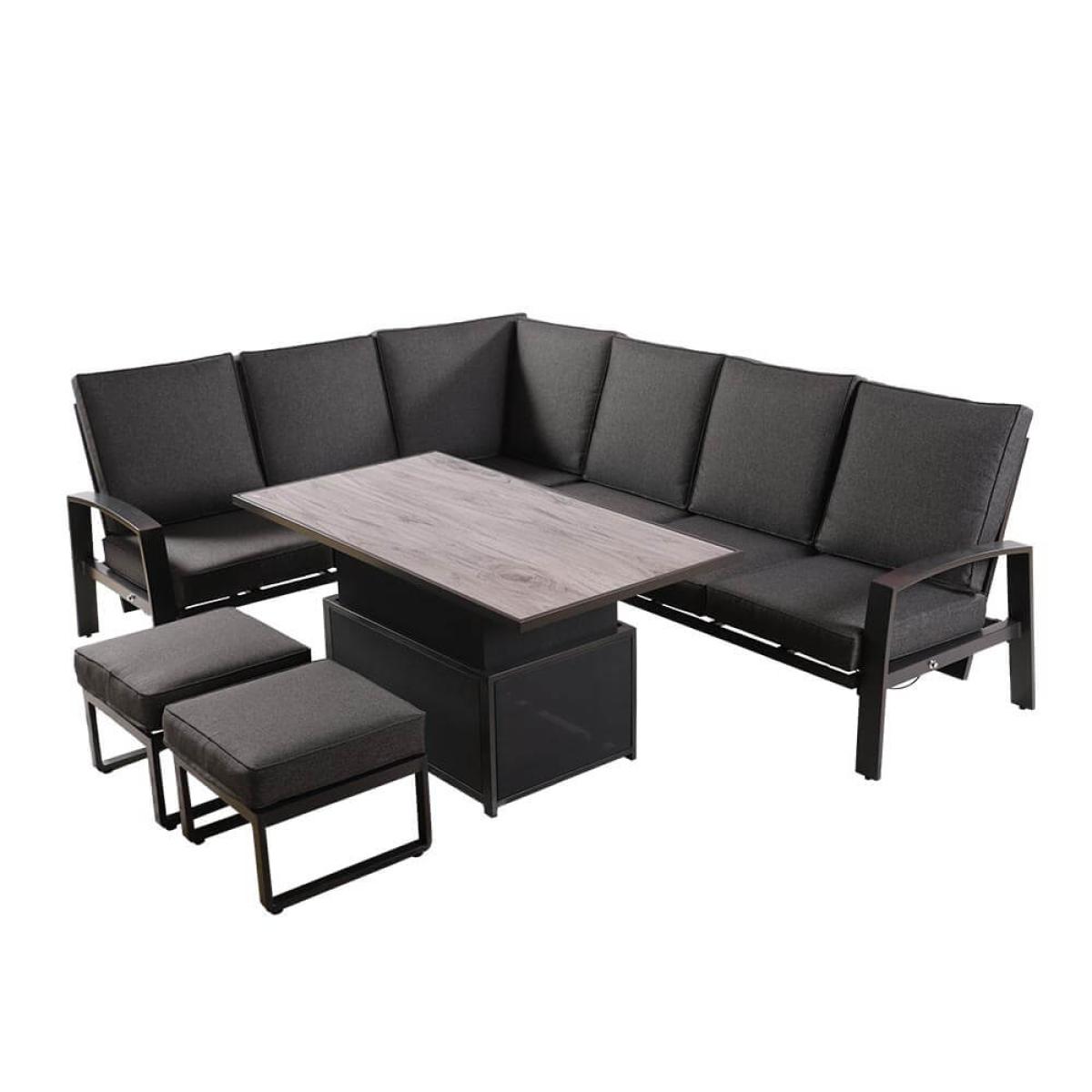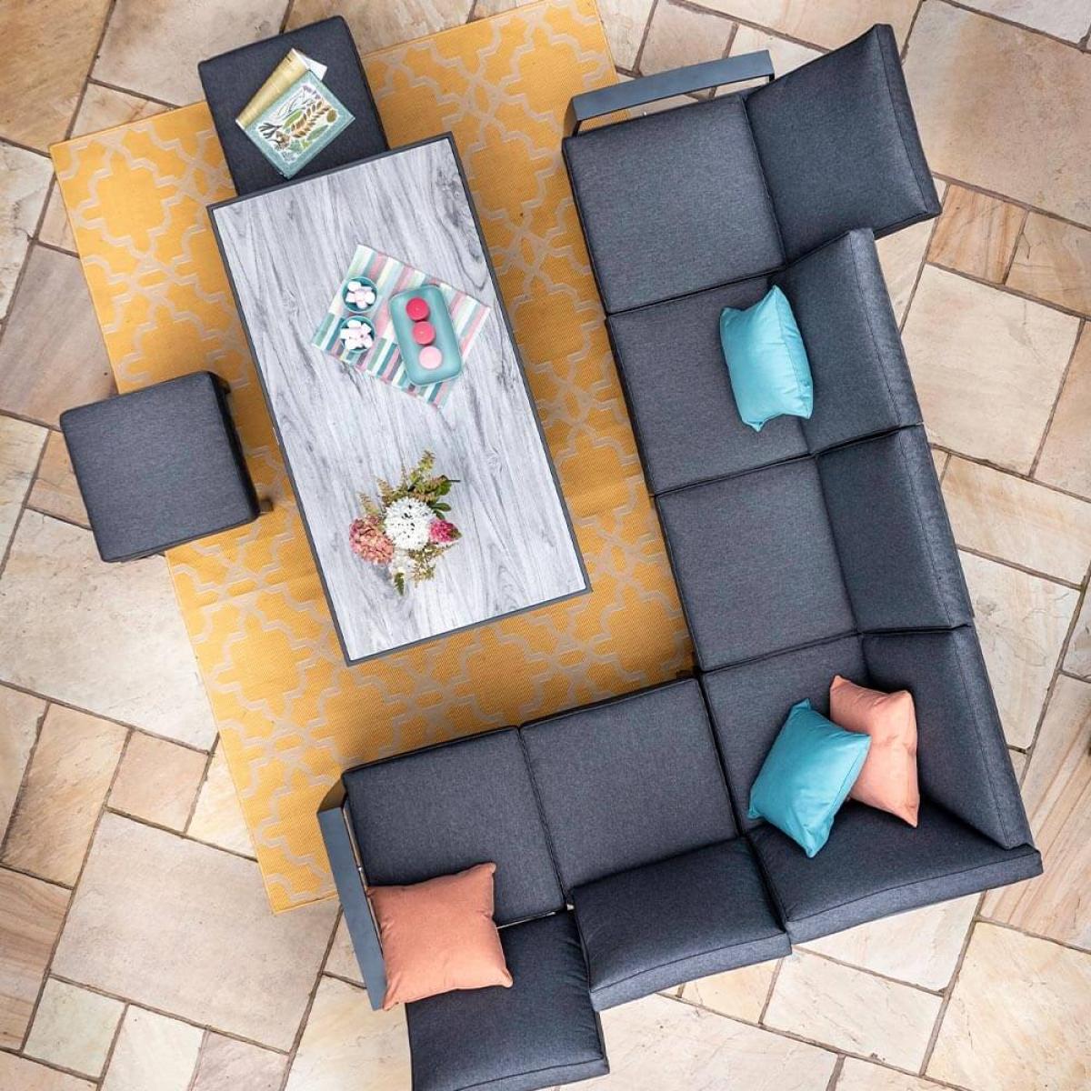 Set consists of:. About:. With an impressive selection of seating prime for garden relaxation and alfresco casual dining the stylish Hartman Vienna Reclining Rectangular Casual Dining Set With Tuscan Adjustable Table will create and enviable chill out area in your outdoors. This is truly sleek and modern minded aluminium garden furniture, benefitting from a neutral grey powder coating and on-trend angular design. Able to seat 7 people, it’s not only plentiful in the looks department but offers exciting user friendly features to aid afternoons spent in the fine weather. This set is customisable with a middle corner section that allows the sofa compartments to attach at either side, meaning you can configure longer on the left or right depending on your space or personal preference. An adjustable height table is easily heightened using the footpeadal, this function is perfect for those looking to offer afternoon drinks as well as casual dining. This table is lavishly topped with a Tuscan ceramic glass that is extremely attractive, but also tactile and scratch resistant. All seating is topped with Hartman’s Weatherready® cushions, complete with a long right hand 3 person sofa and adjoining left hand plus two stools. These thickly filled cushions are comfortable but come equipped with a layering system that will repel light showers and flash downpours. They allow heavier rain to pass through their purposely permeable layers, draining through their underside overtime and in line with local conditions. We just recommend storing these indoors when not in use. The aluminium itself will also never rust so is ideal for years of outside use. Although, perhaps the crowning feature is the two reclining modular seats to be found at the end of the sofa sections, these smoothly recline via a piston operated system and offer an altogether more relaxed seating experience, and better sun worshipping! We think this contemporary Hartman outdoor garden furniture will soon become a garden favourite for those looking to host relaxed afternoons filled with casual dining and conversation. Key Features:.