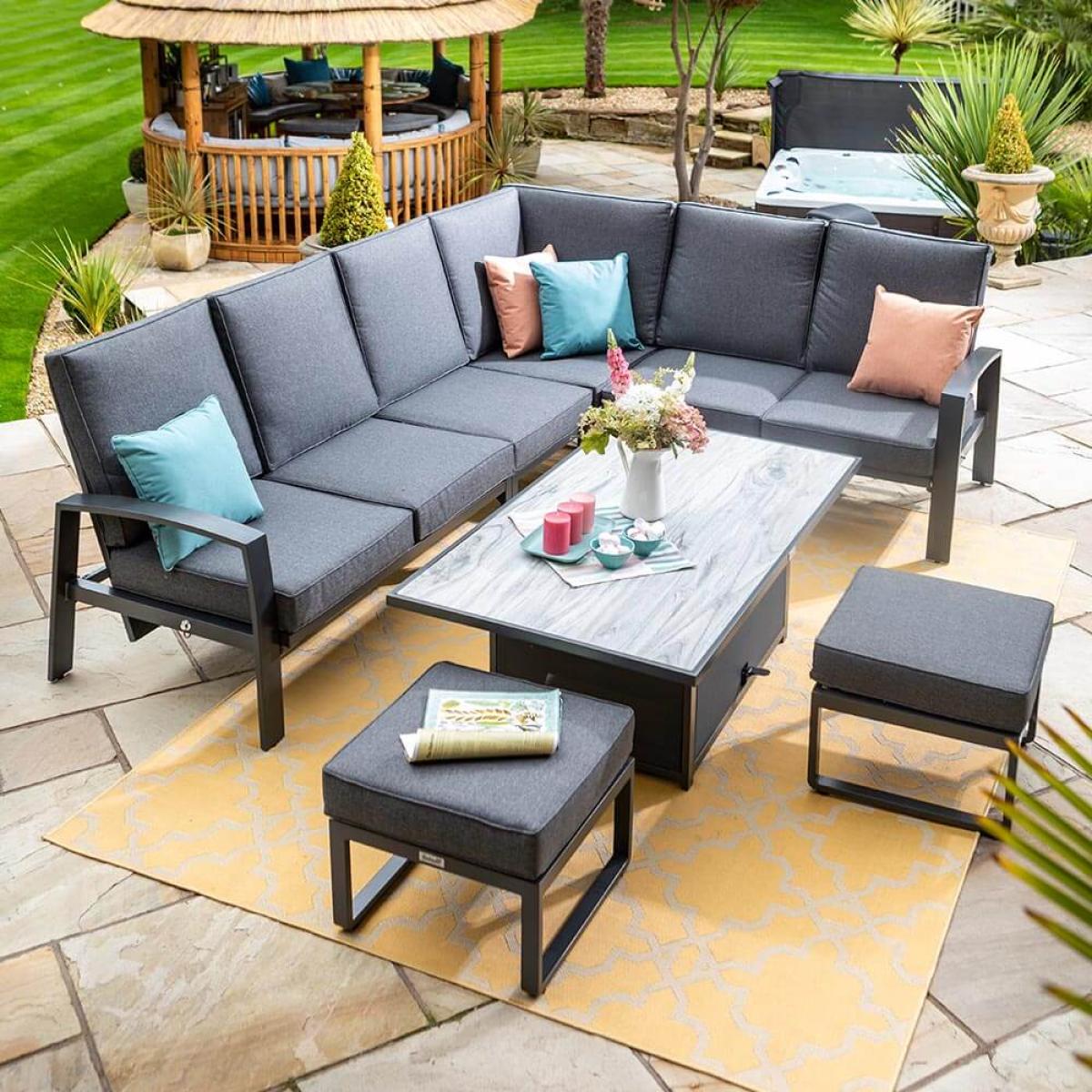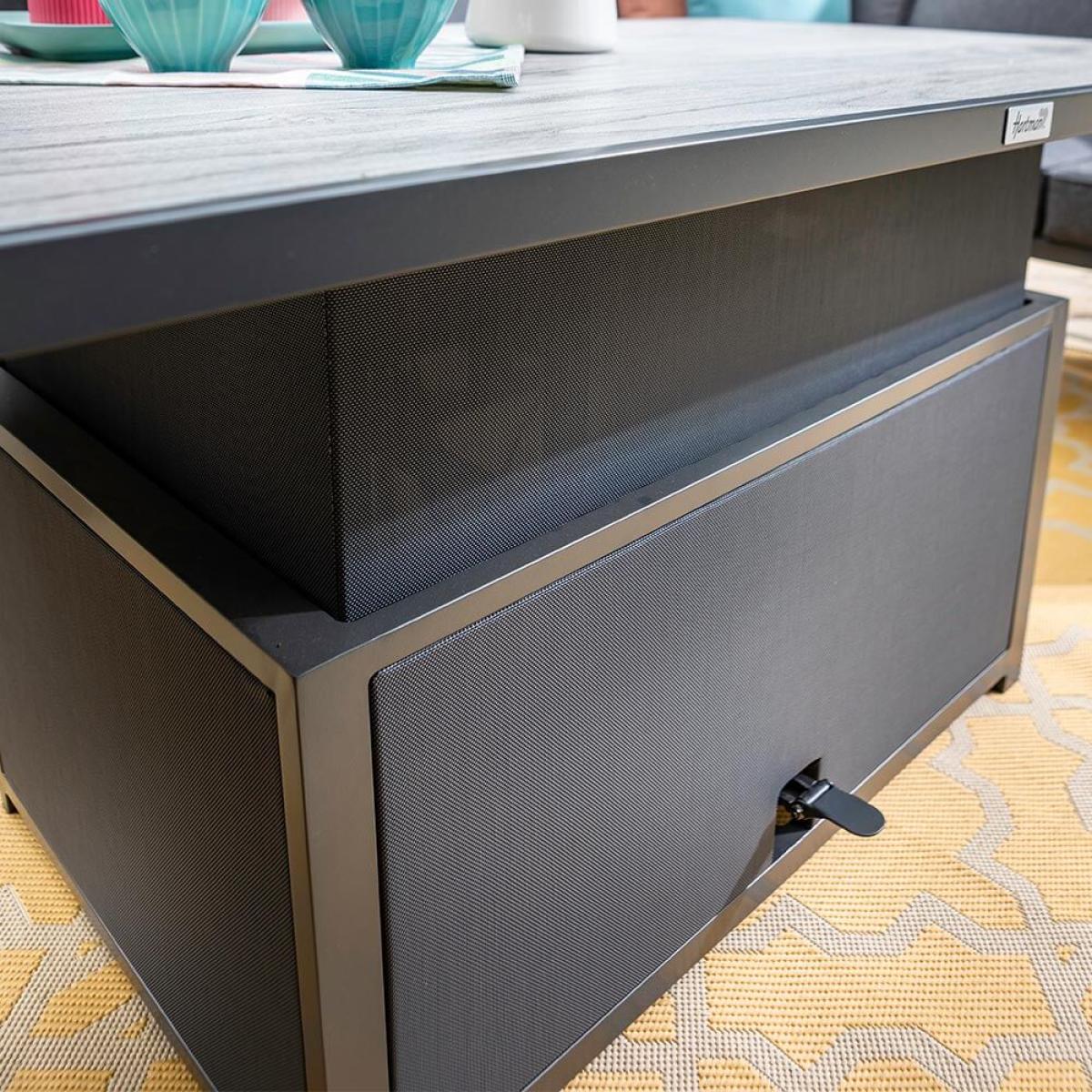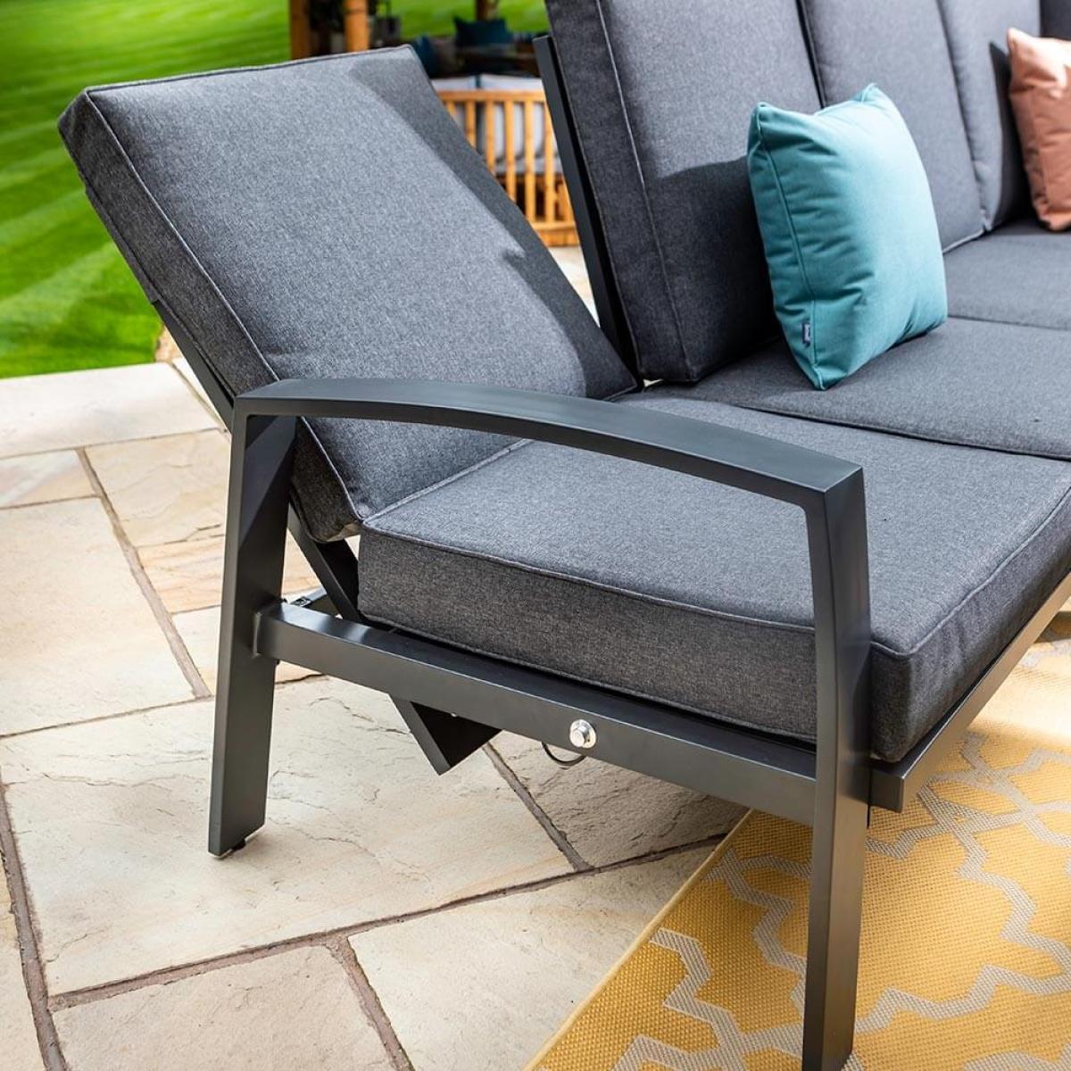Set consists of:. About:. With an impressive selection of seating prime for garden relaxation and alfresco casual dining the stylish Hartman Vienna Reclining Rectangular Casual Dining Set With Tuscan Adjustable Table will create and enviable chill out area in your outdoors. This is truly sleek and modern minded aluminium garden furniture, benefitting from a neutral grey powder coating and on-trend angular design. Able to seat 7 people, it’s not only plentiful in the looks department but offers exciting user friendly features to aid afternoons spent in the fine weather. This set is customisable with a middle corner section that allows the sofa compartments to attach at either side, meaning you can configure longer on the left or right depending on your space or personal preference. An adjustable height table is easily heightened using the footpeadal, this function is perfect for those looking to offer afternoon drinks as well as casual dining. This table is lavishly topped with a Tuscan ceramic glass that is extremely attractive, but also tactile and scratch resistant. All seating is topped with Hartman’s Weatherready® cushions, complete with a long right hand 3 person sofa and adjoining left hand plus two stools. These thickly filled cushions are comfortable but come equipped with a layering system that will repel light showers and flash downpours. They allow heavier rain to pass through their purposely permeable layers, draining through their underside overtime and in line with local conditions. We just recommend storing these indoors when not in use. The aluminium itself will also never rust so is ideal for years of outside use. Although, perhaps the crowning feature is the two reclining modular seats to be found at the end of the sofa sections, these smoothly recline via a piston operated system and offer an altogether more relaxed seating experience, and better sun worshipping! We think this contemporary Hartman outdoor garden furniture will soon become a garden favourite for those looking to host relaxed afternoons filled with casual dining and conversation. Key Features:.