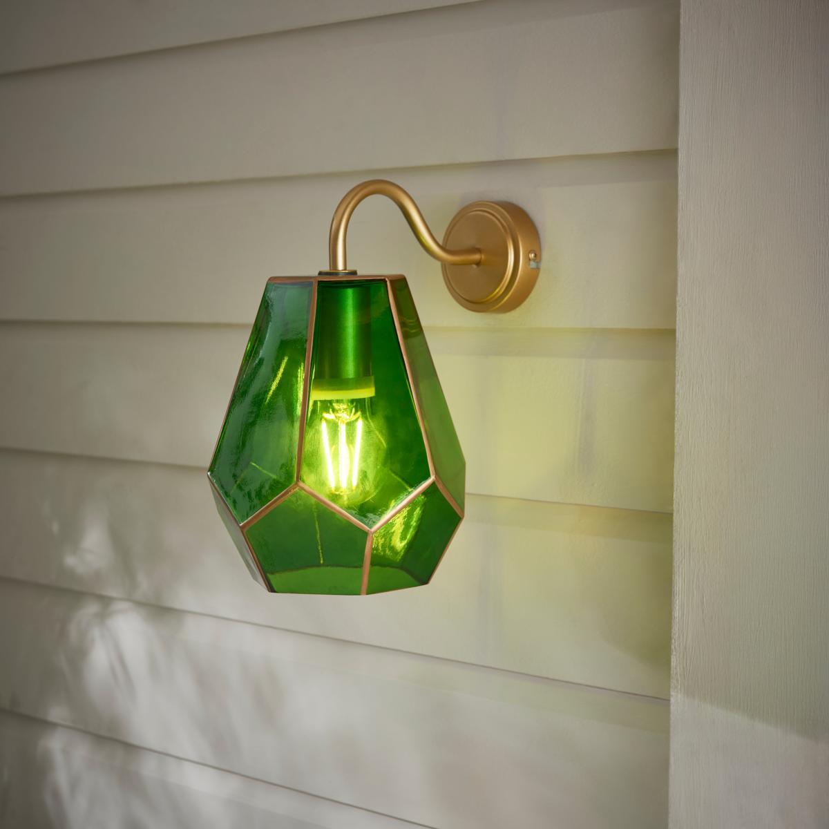I love this wall light for its striking Art Deco influence and bold glass design, which instantly elevates an outdoor space. It works beautifully in both traditional and modern exteriors, adding a touch of vintage glamour while maintaining contemporary appeal. Practical styling tips include placing it beside front doors, along patios, or by garden pathways to create inviting illumination. Pair it with minimalist furniture or lush greenery to allow its sculptural form to stand out. Its green glass adds colour and visual interest without overwhelming, making it a versatile piece that can complement a range of outdoor styles.