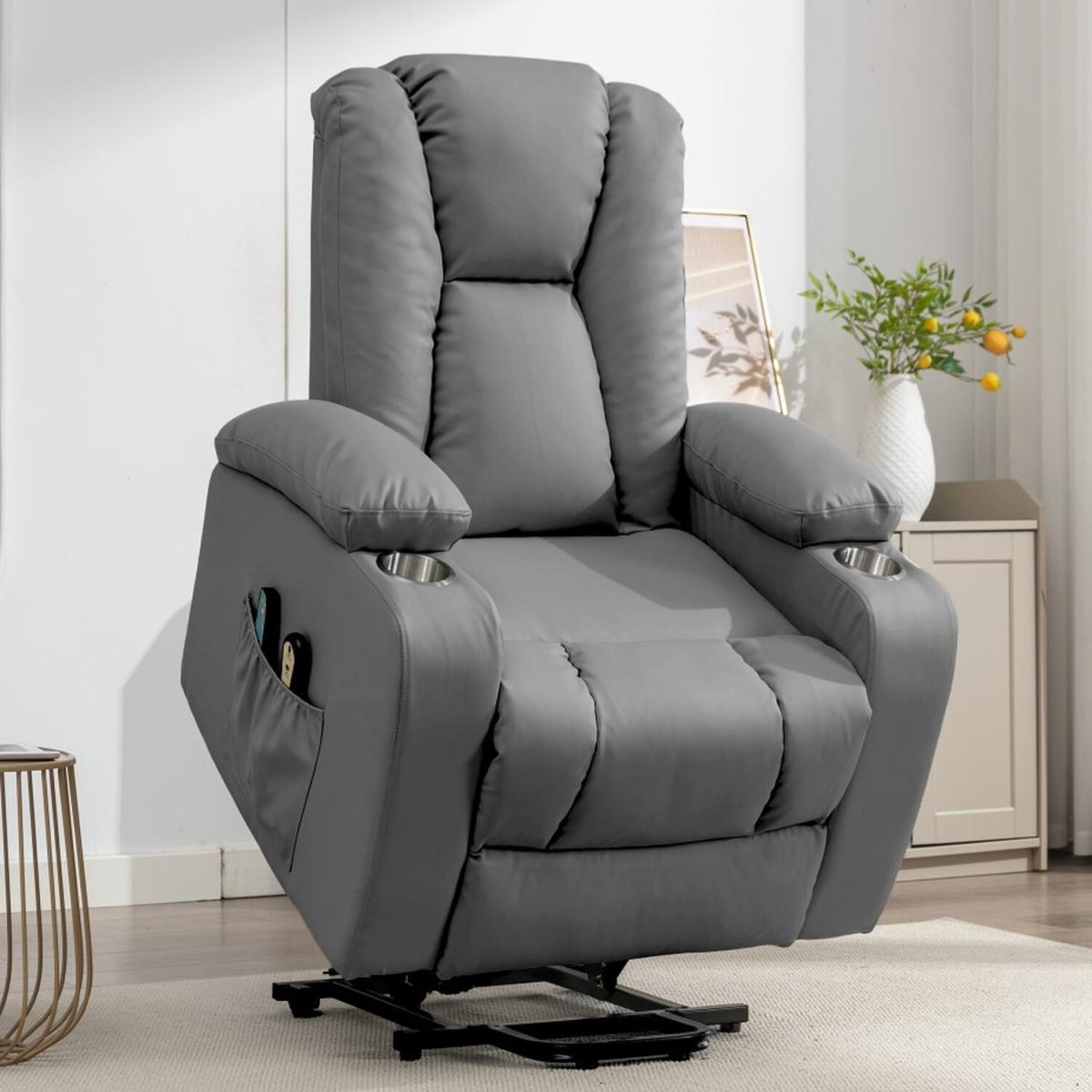 Experience the pinnacle of relaxation and comfort with the Hartville electric lift assist riser recliner chair. Crafted with bonded leather upholstery, this chair exudes timeless elegance. Its coil-sprung and foam-filled interior ensure unmatched support and cushioning, while the narrow back design adds a sleek touch to any space. Our two-man delivery and assembly service ensures a hassle-free setup. The built-in cup holder in the armrests keeps your beverages within reach, while massage points in the seat, lower, and upper back offer soothing relief. Additionally, the warming heat function in the lumbar area provides an extra layer of coziness. Elevate your relaxation game with the Hartville, where style meets functionality for the ultimate sitting experience.