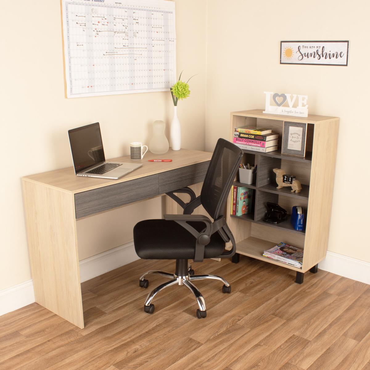 The Harvard home office desk and chair set is ideal for working from home or for creating your own home study area. This stylish desk offers plenty of work space and 2 useful drawers for storing your office essentials. The low bookcase offers practical storage or space for display and has black metal legs. The washed oak and carbon grey oak effect melamine finish is hardwearing and easy to maintain. The home office chair has a black upholstered seat and black mesh back. The chrome plated steel base has castors and the gas lift ensures the height can be adjusted to suit your needs. The arms lift to give ease of access. Maximum weight capacity 120 KG.Dimensions :Desk - 120.6w x 45d x 75.6h cm Bookcase - 60w x 32.3d x 103h Chair -61w x 57d x 94-105h cm