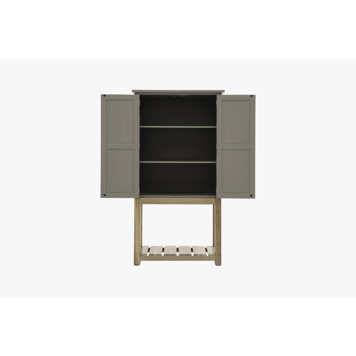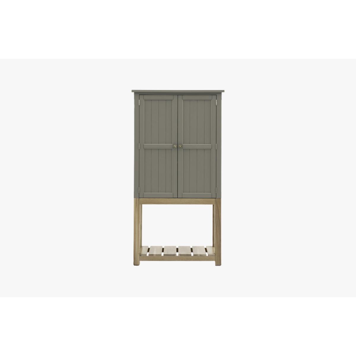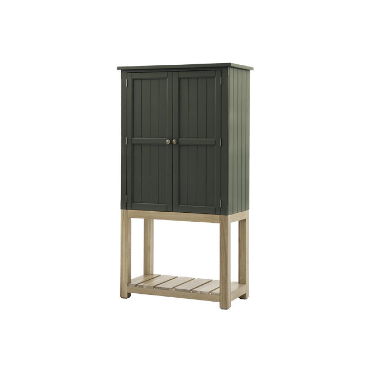 I love this cupboard for its understated charm and versatility. The moss green finish lends a relaxed, natural vibe that works beautifully in both country-style kitchens and modern, pared-back interiors. Its design is practical, providing ample storage while the elevated base adds a touch of visual interest and lightness, making it suitable for spaces with higher ceilings or limited floor space. For styling, I’d suggest pairing it with rustic wooden accessories or contrast it with sleek metals for a more eclectic look. You can also play with open shelving inside for displaying everyday essentials or decorative items, turning this piece into both functional storage and a subtle design statement.