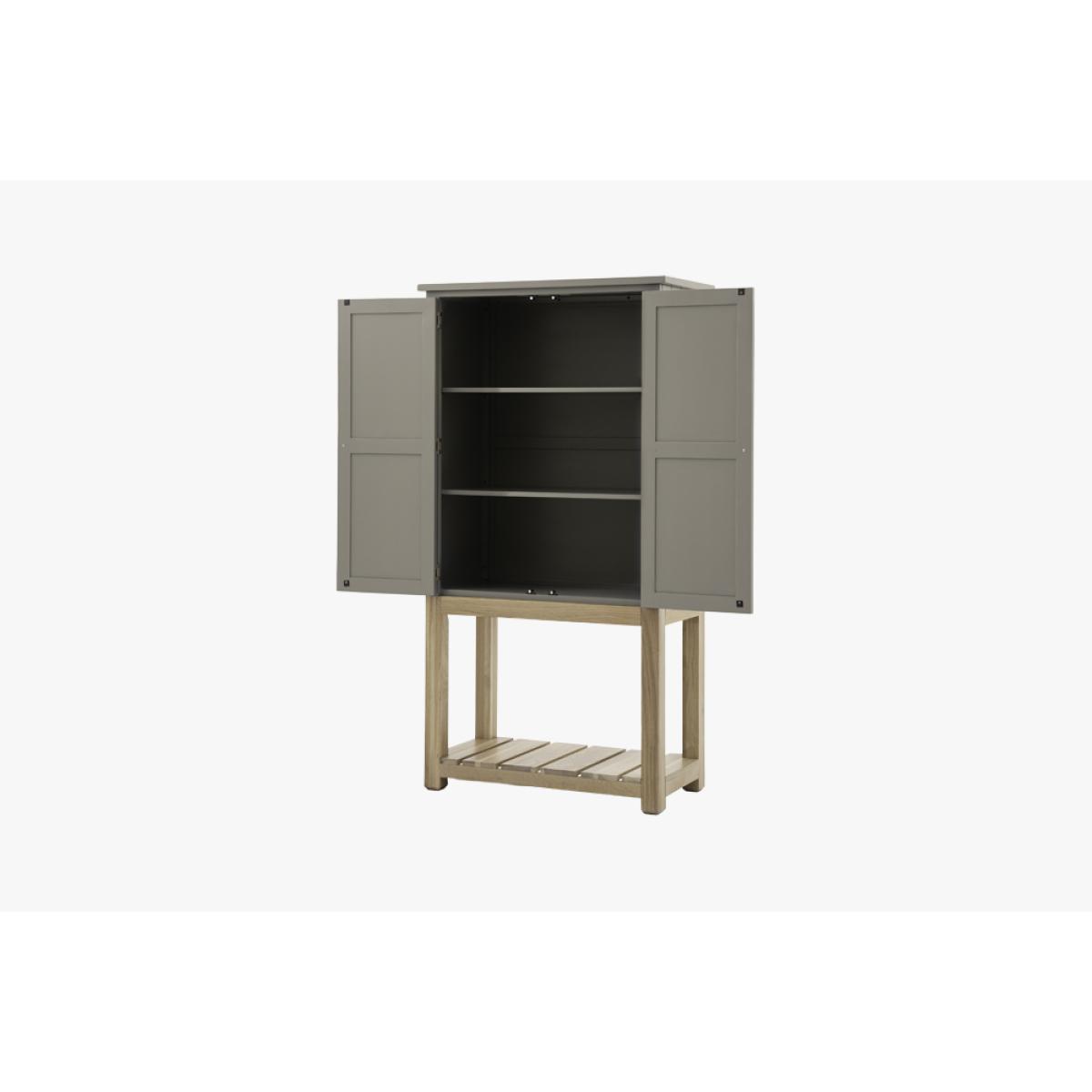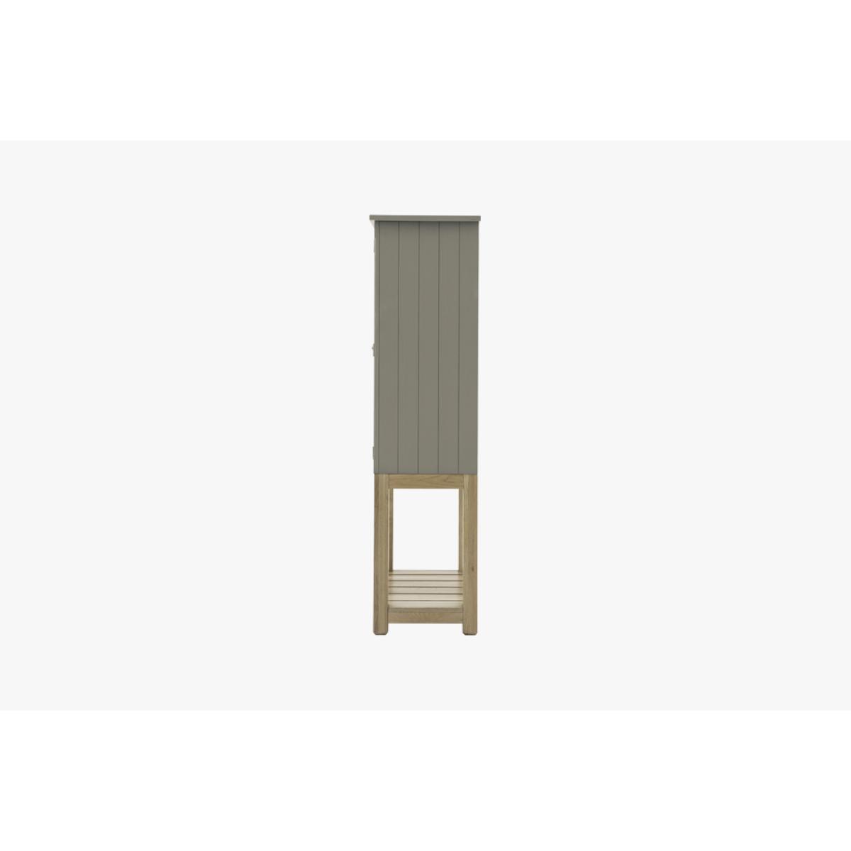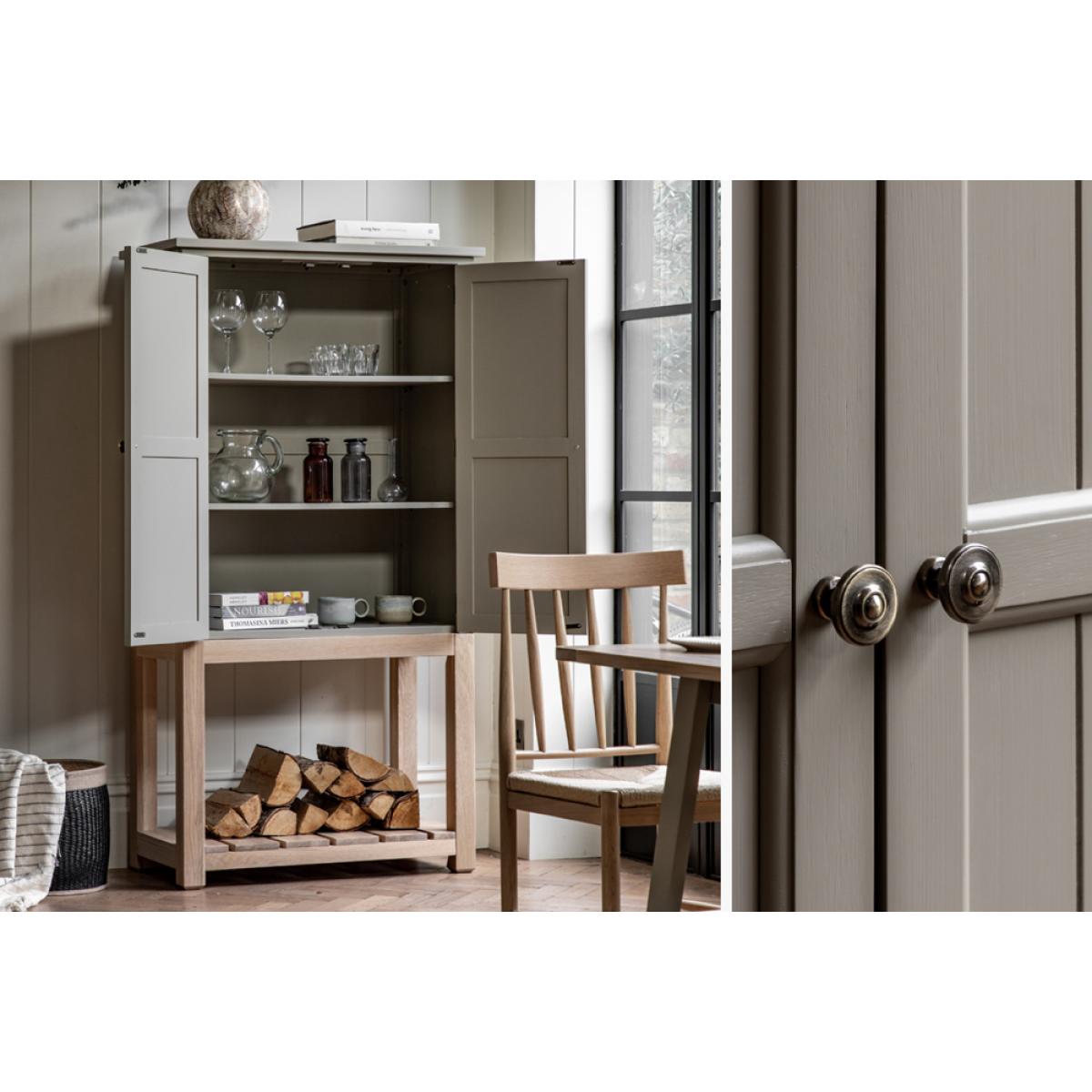 Effortlessly combining comfortable style and practicality, the Harvest cupboard's internal shelves and lower oak shelf has plenty of storage. The combination of pale sage hand painted texture and solid oak creates a modern country style cupboard that will suit any space, adding some cosy charm wherever its placed.
