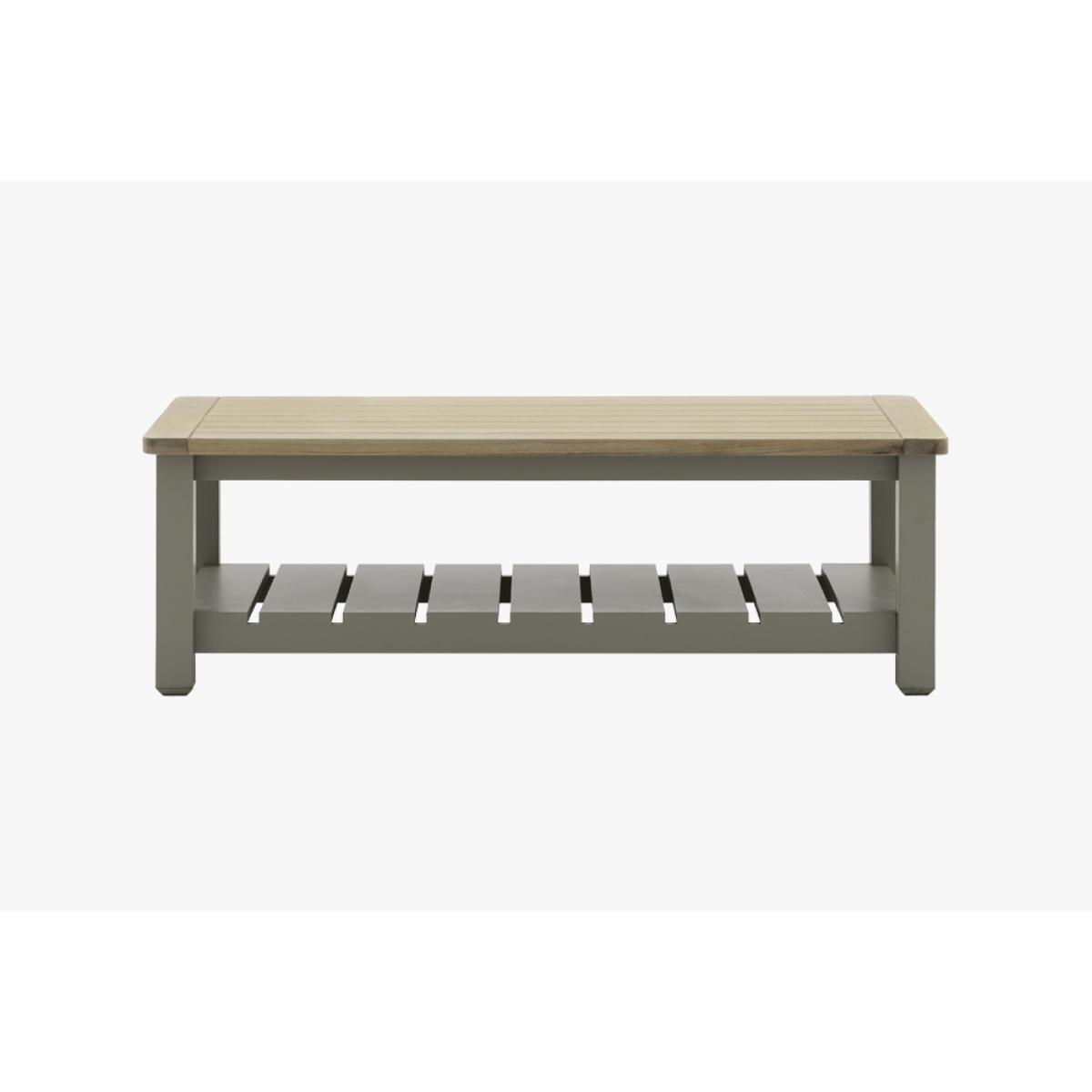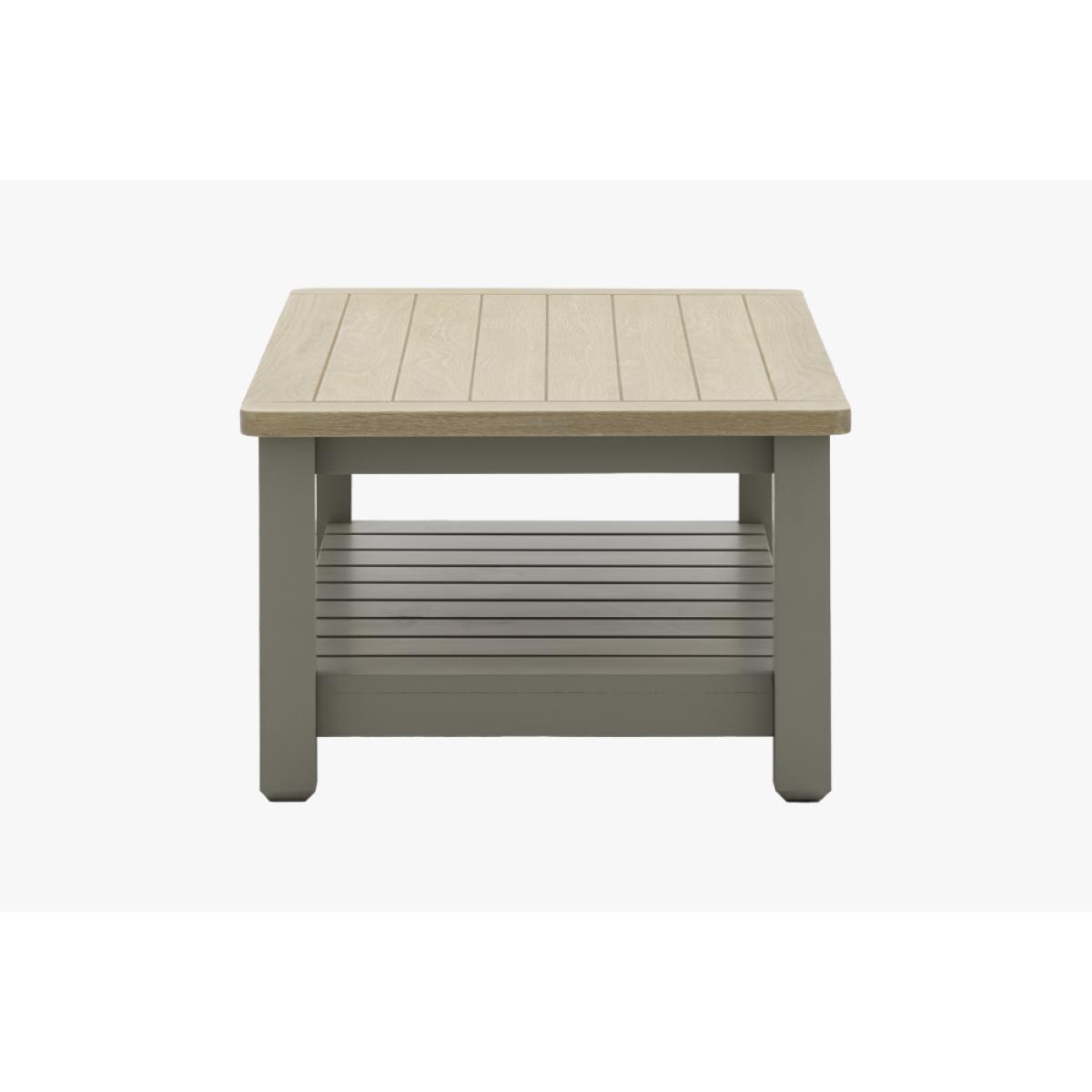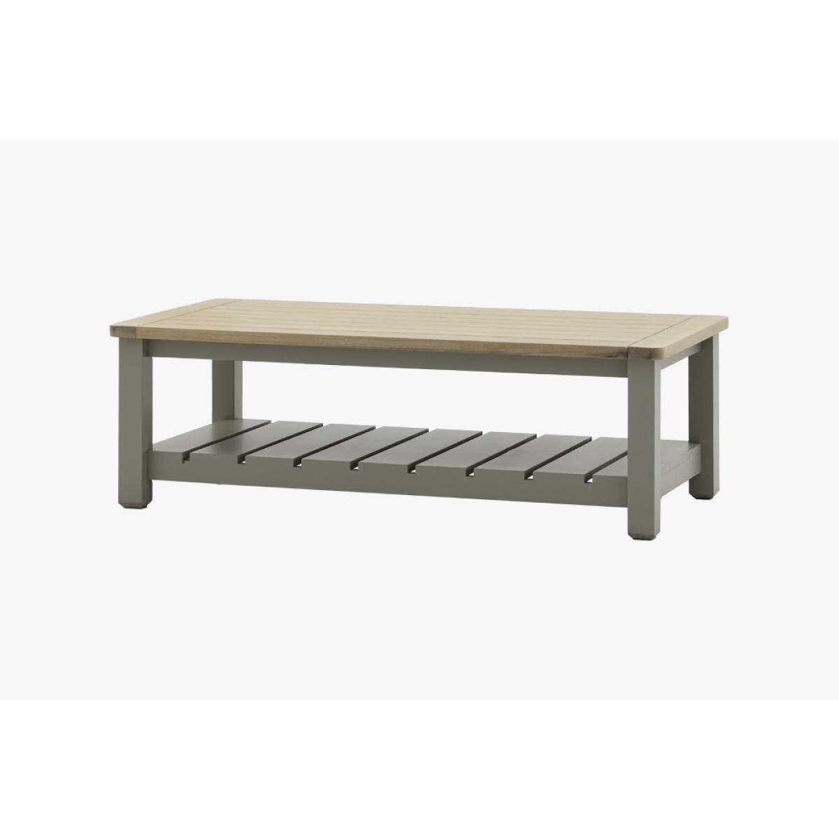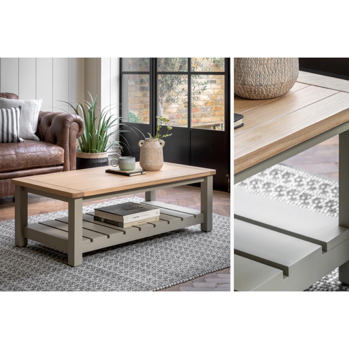 With just the right balance of country style and modern versatility, the Harvest coffee table oozes rustic charm. The simple chunky base hand pained in sage green is perfectly complimented by a grooved oak top, and a slatted shelf underneath adds a bit of extra storage.