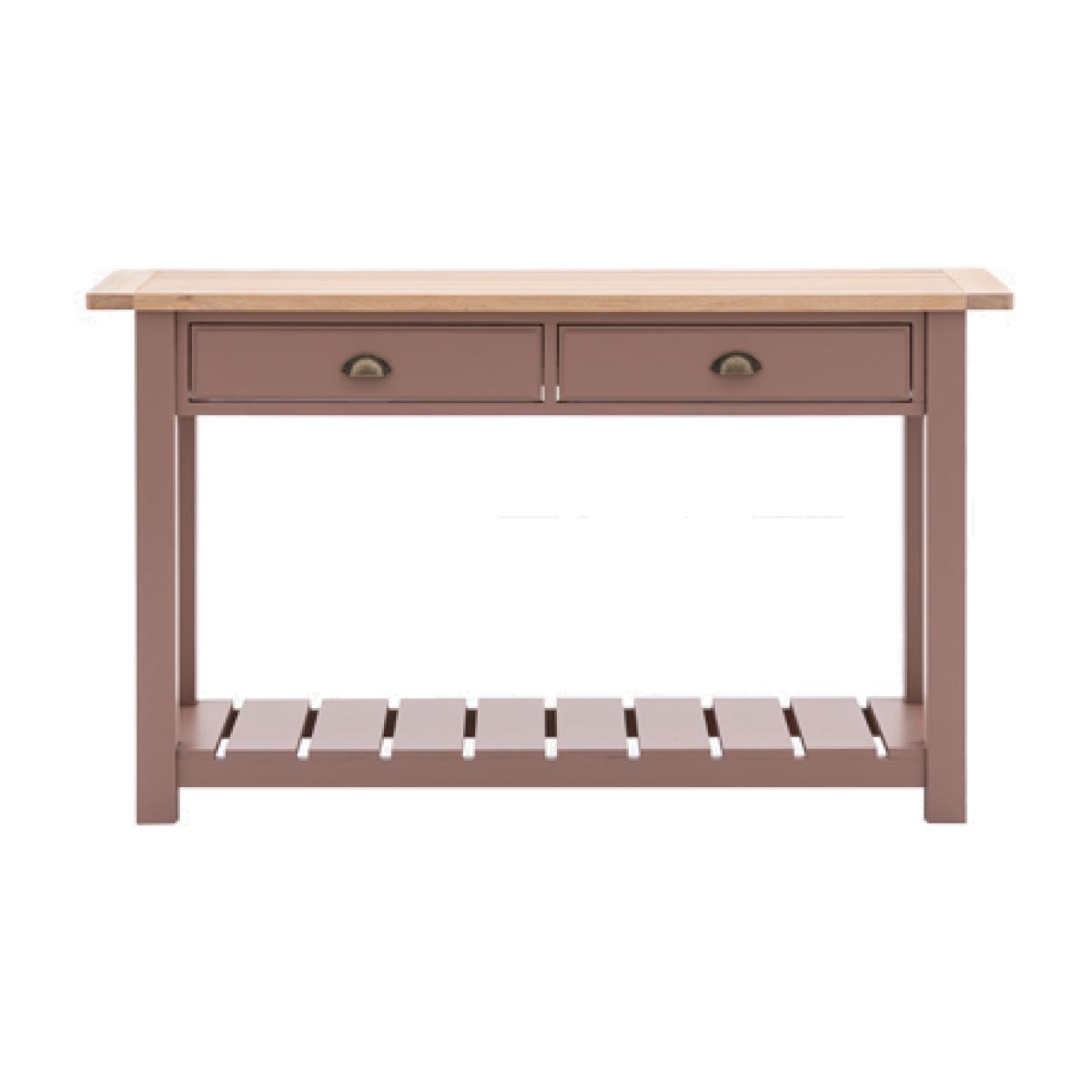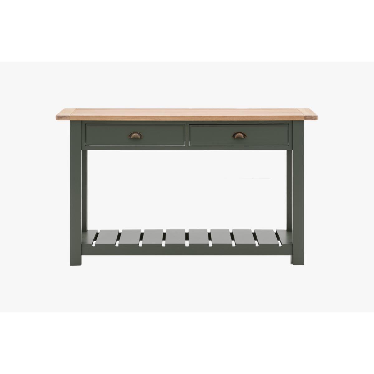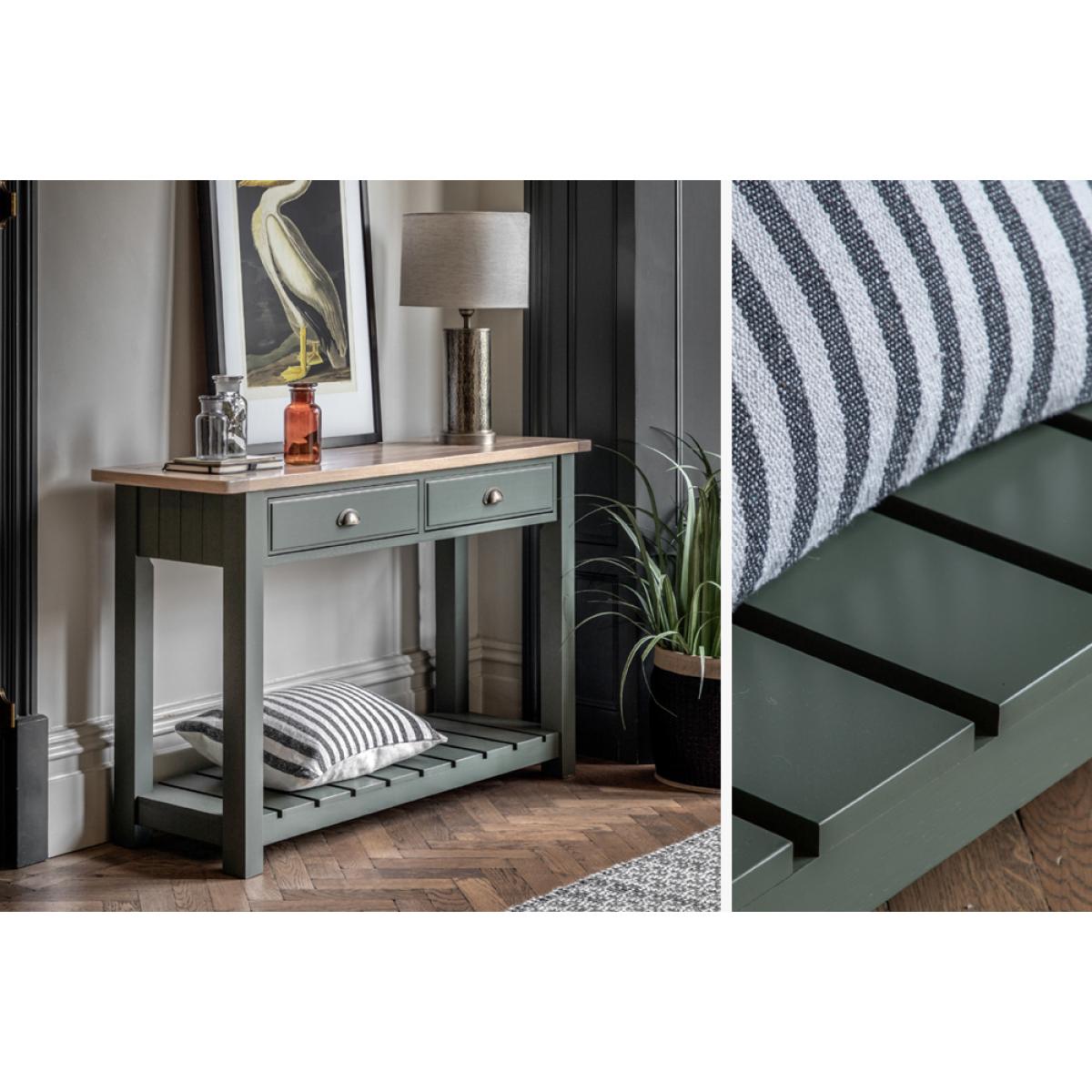 The simple lines, metal handle details, sage hand painted texture and grooved oak top of the Harvest console table makes it perfect for adding a little country charm to your home. With 2 drawers and a low shelf the Harvest console table is the perfect versatile storage solution, a solid staple piece for any home.