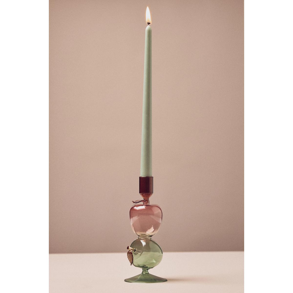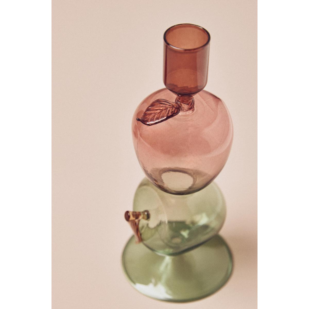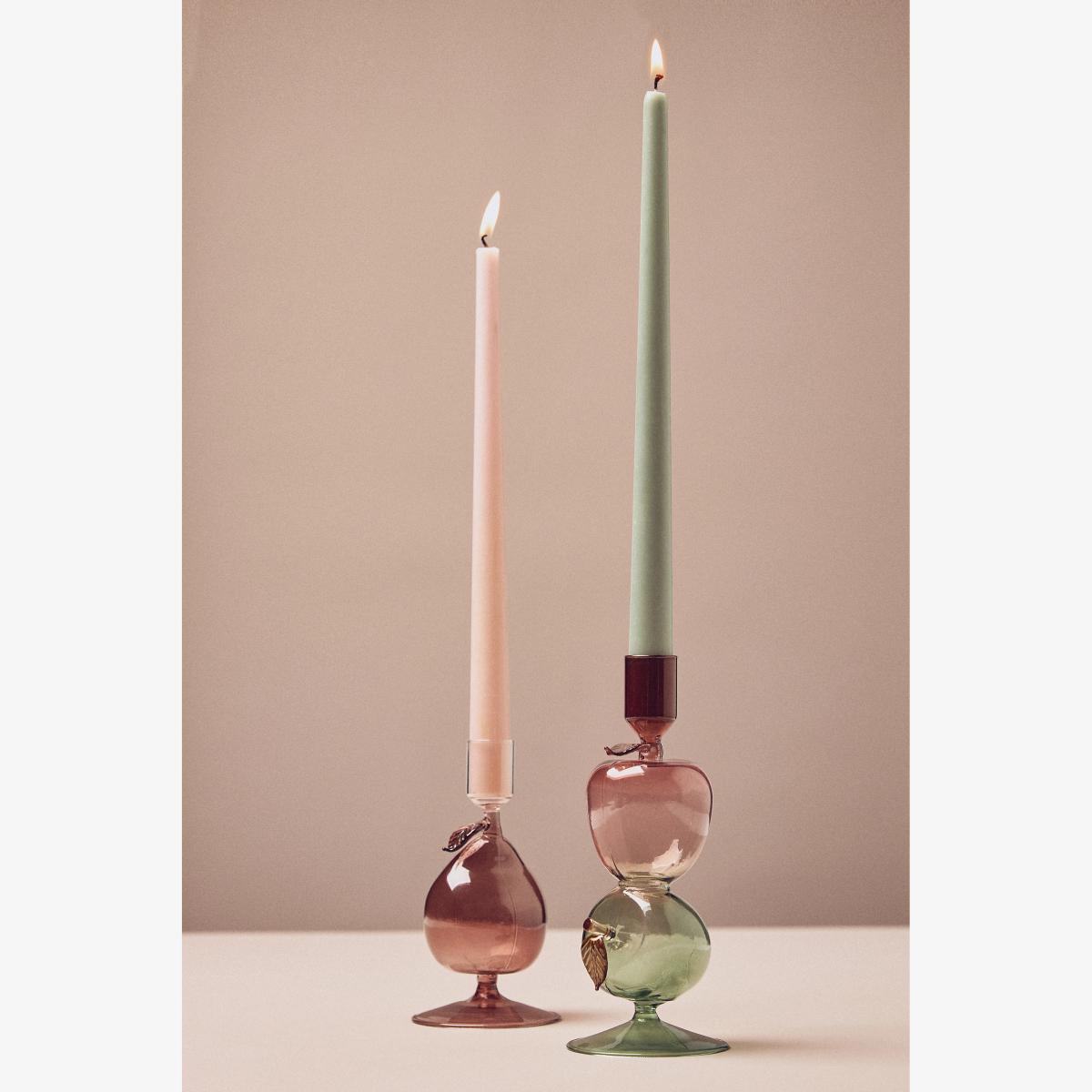 A base of softly tinted glass, shaped like harvest fruit, supports this candle holder, designed to decorate tables for gatherings. Please note: The composition of borosilicate glass allows for beautiful transparency and thermal stability but as with all glassware, please handle with care! * 100% borosilicate glass * Wipe clean with soft cloth * Imported
