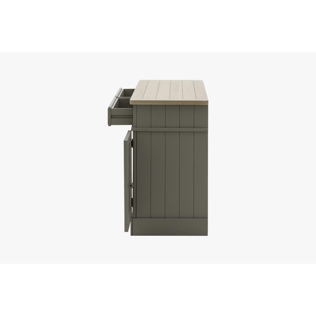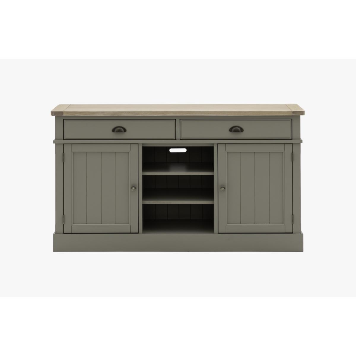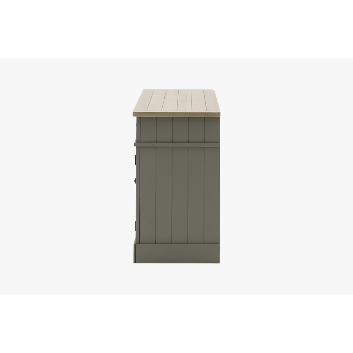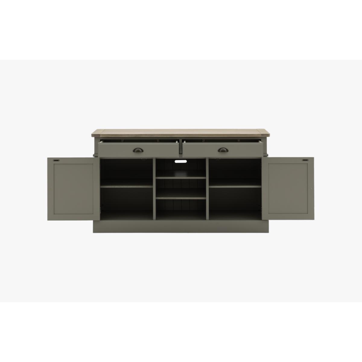 The Harvest sideboard's simple shape, metal handle details, oak grooved top and hand painted sage finish is perfect for adding some cosy county style to any room. With 2 cupboards with adjustable shelves, 2 drawers and cookbook ready middle shelves the Harvest Sideboard has plenty of practical storage, perfect for adding some much needed worksurface space to a kitchen diner.