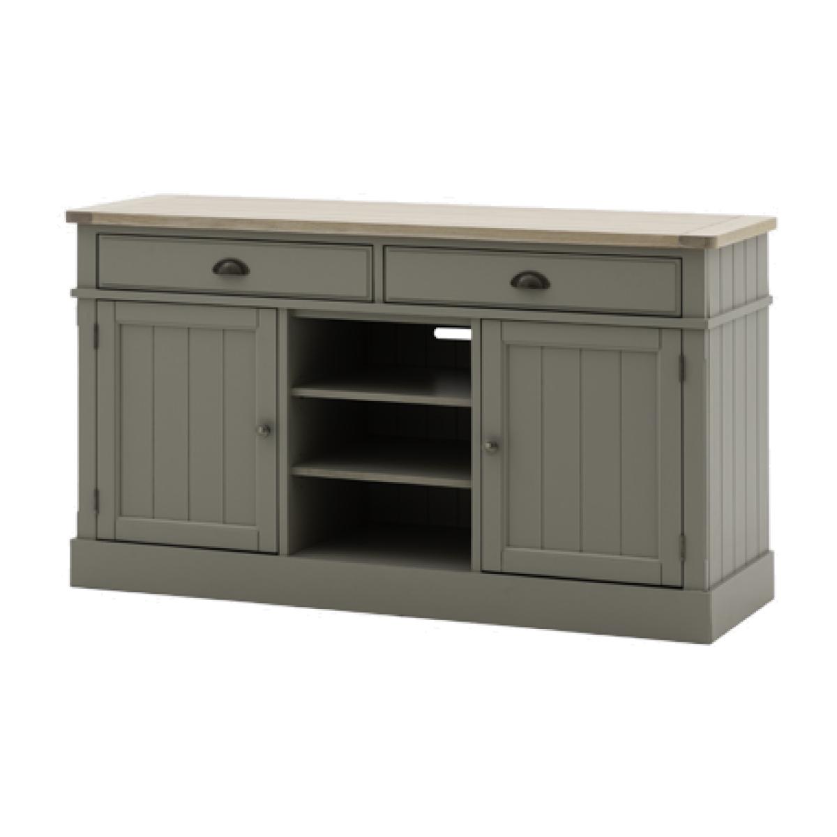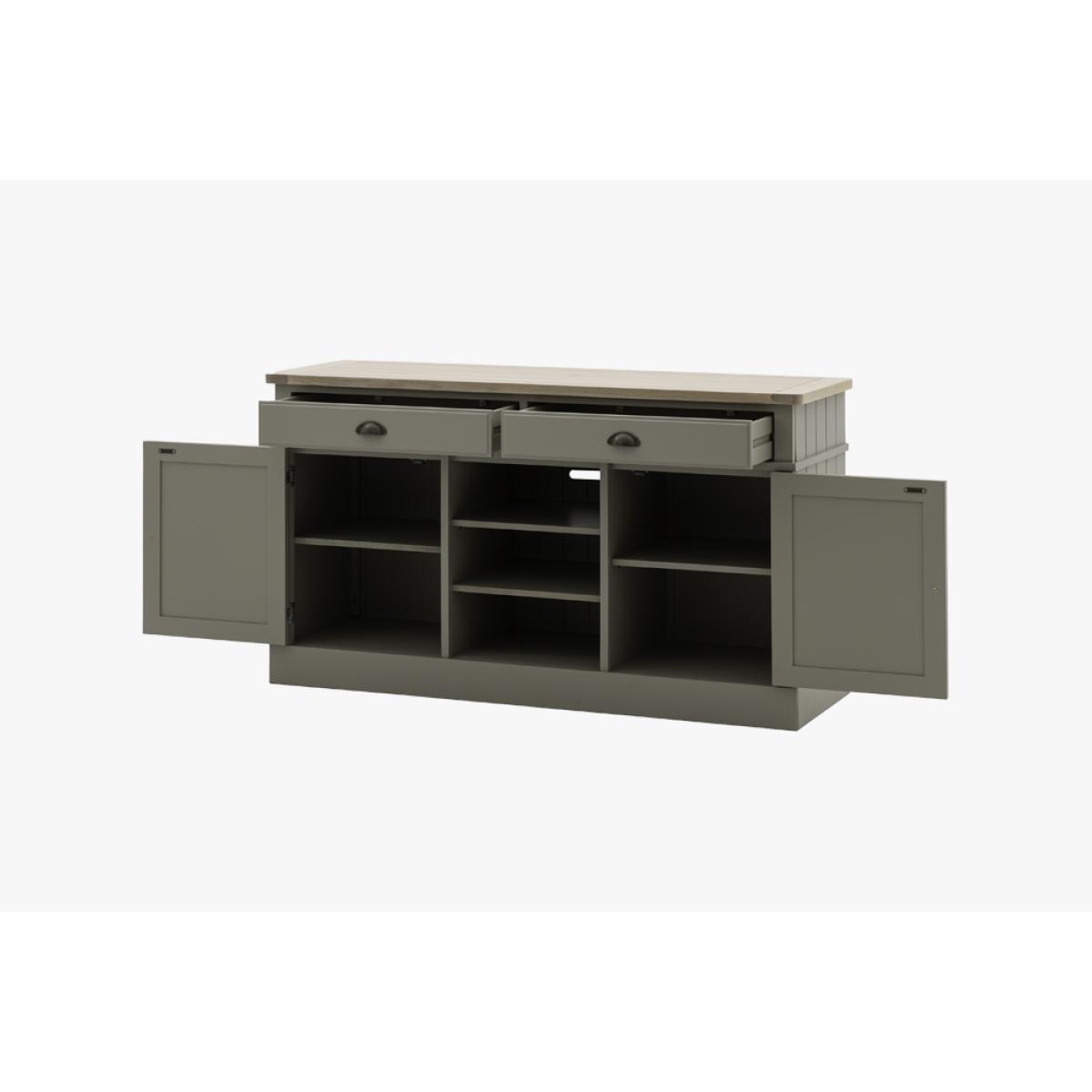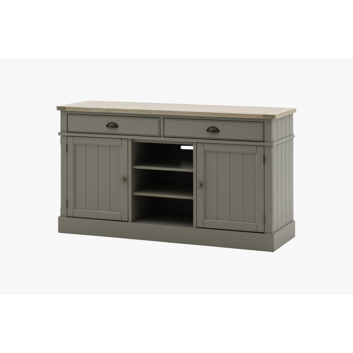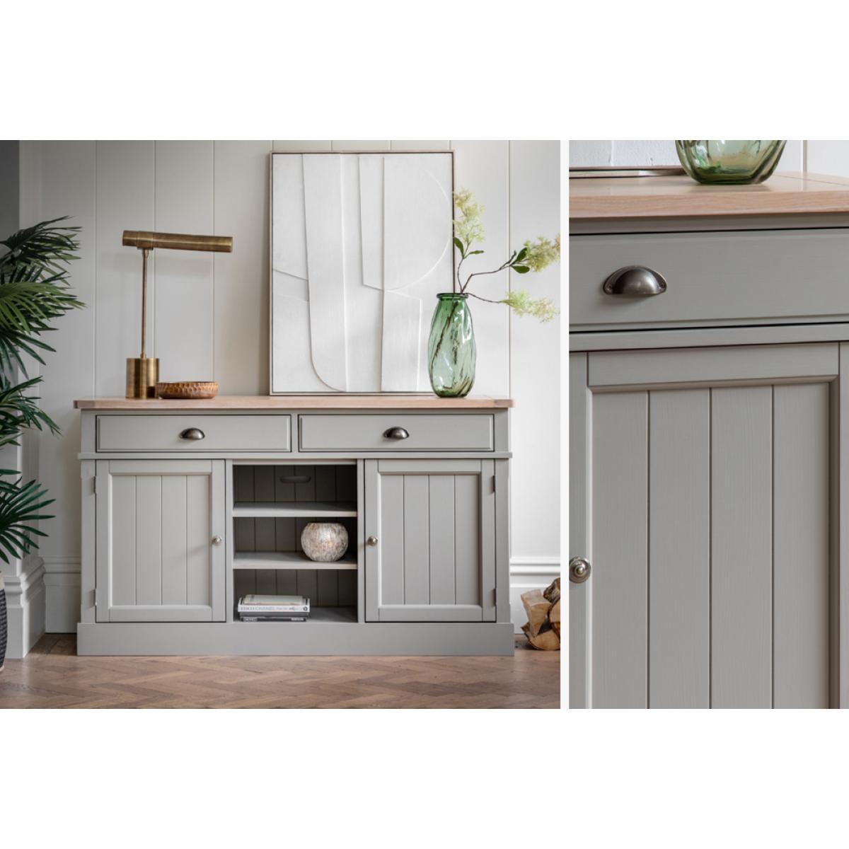 The Harvest sideboard's simple shape, metal handle details, oak grooved top and hand painted sage finish is perfect for adding some cosy county style to any room. With 2 cupboards with adjustable shelves, 2 drawers and cookbook ready middle shelves the Harvest Sideboard has plenty of practical storage, perfect for adding some much needed worksurface space to a kitchen diner.