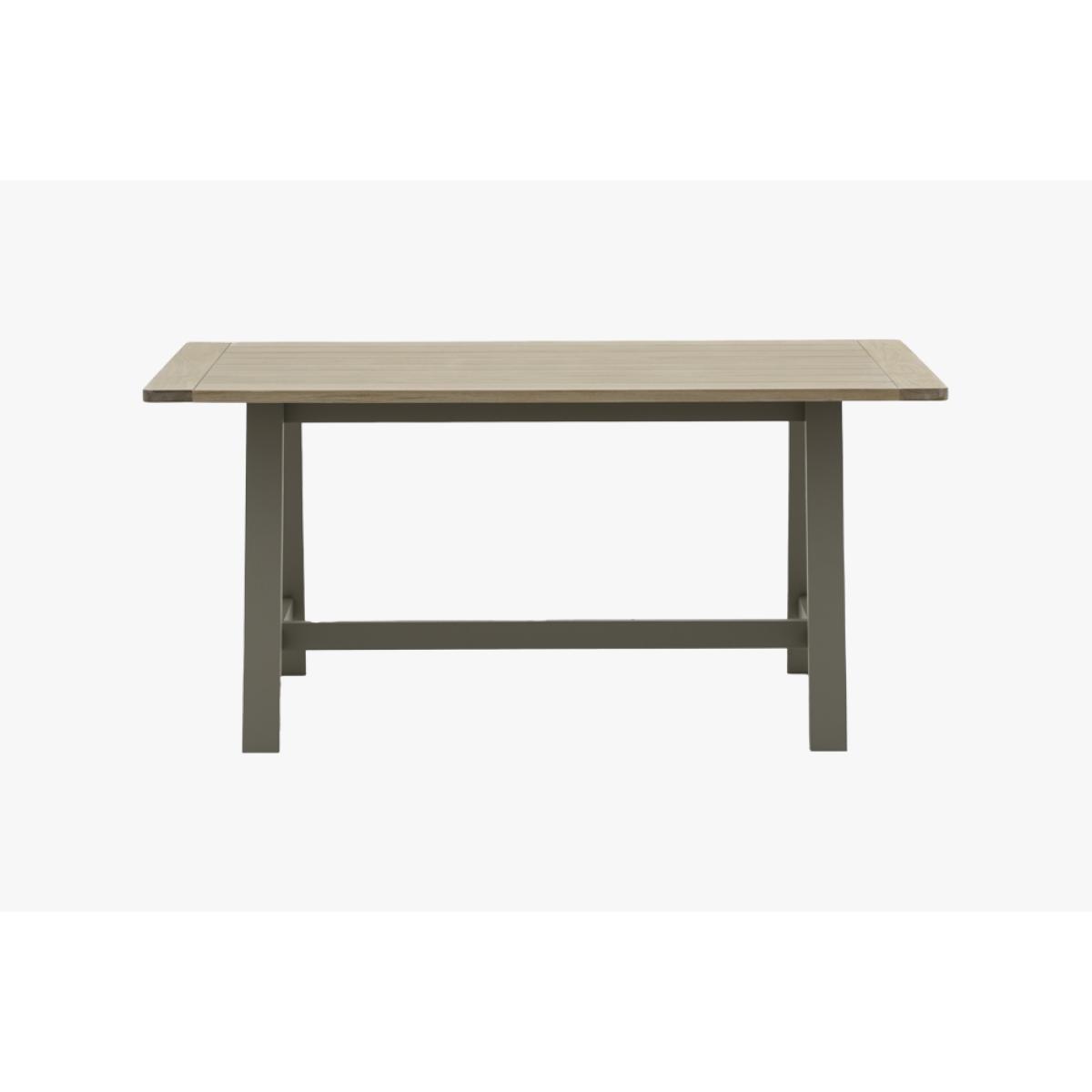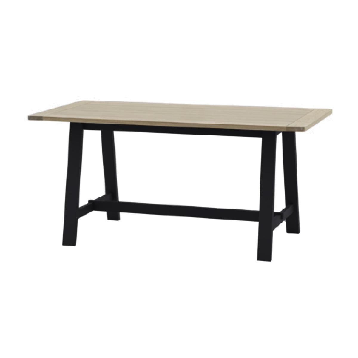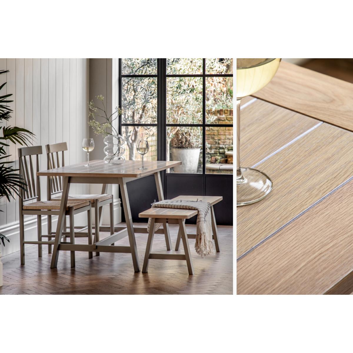 I particularly like this harvest trestle for its clean lines and contrasting tones - the pale oak top feels fresh while the darker base grounds the space. It suits Scandi-inspired or modern farmhouse schemes, and because of its generous length it works well in open-plan dining areas or as a kitchen-diner work surface. To style, mix in a long bench on one side and slim-profile chairs on the other for a relaxed, collected look. Add a simple runner down the centre, a low tray of natural ceramics or glassware and a few tapered candles. Finish with a neutral jute rug beneath to define the area and protect your flooring.