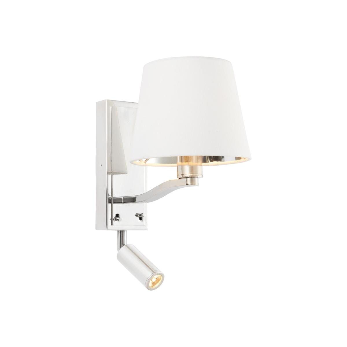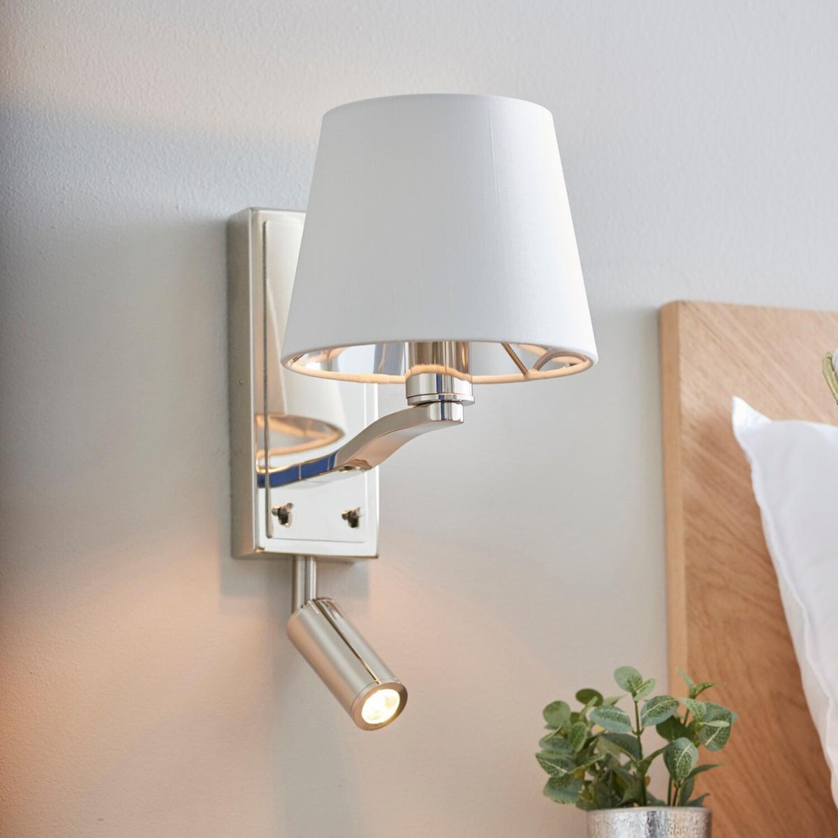 The Harvey wall and reading light is finished in bright nickel plate complemented by a vintage white, faux silk shade, with a silver lined, vintage white, faux silk shade. Featuring an additional, adjustable LED reading light, for the perfect sophisticated boutique hotel look. Matching items also available.