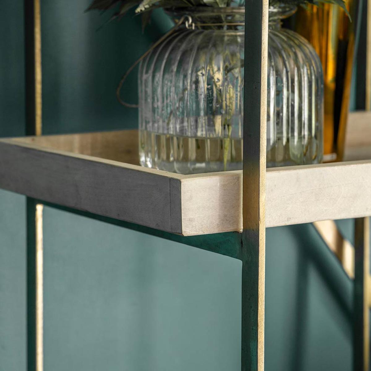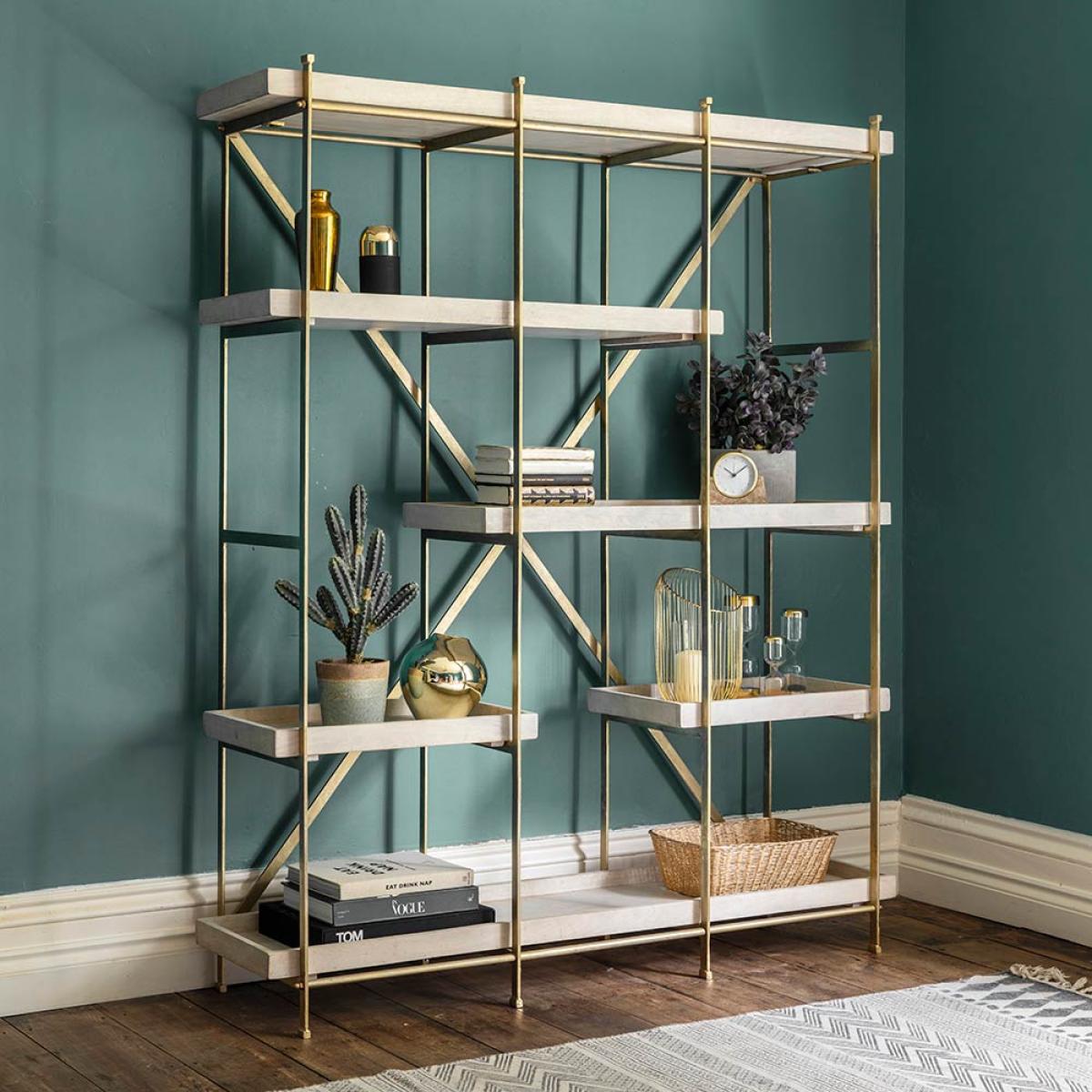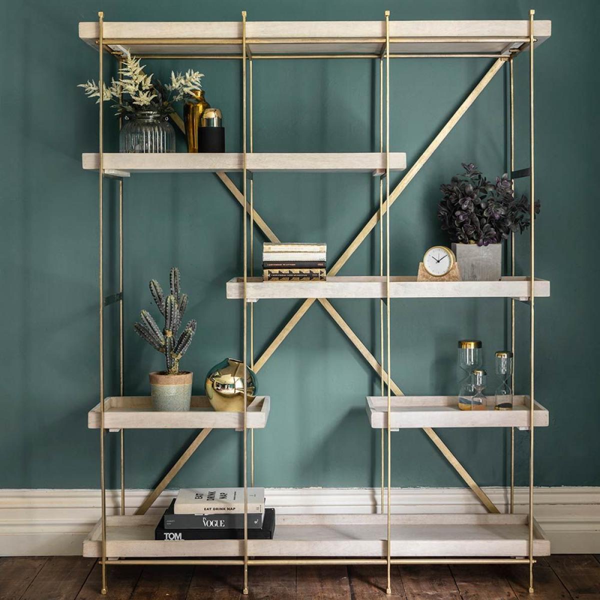 Offering stacks of storage space, our Harvey Shelving Unit in whitewash mango wood looks great in the living room, dining area, home office or even the kitchen. Use to display everything from crockery and cookware to books and paperwork. Its brass plated iron frame is ideal for bringing the industrial look into your home and it makes a handy room divider, too.