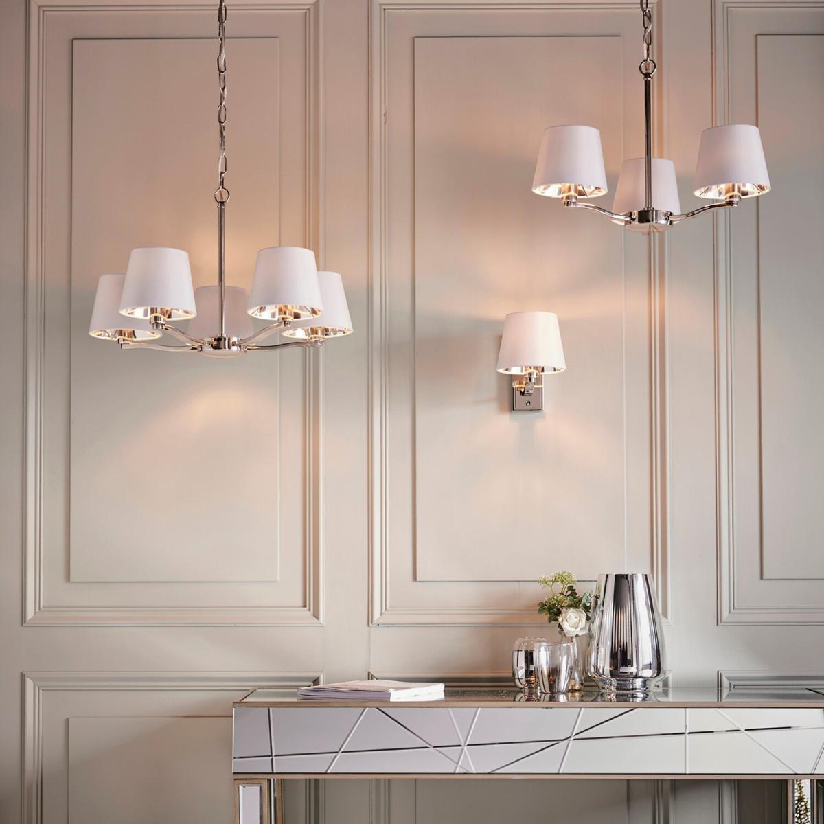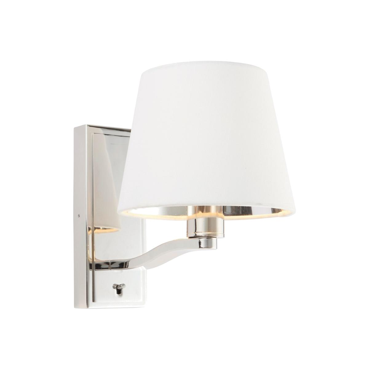 The Harvey wall light is finished in bright nickel plate and complemented by a metallic silver lined, vintage white faux silk shade, for the perfect sophisticated boutique hotel look. With modern on'off switch. Matching items also available.