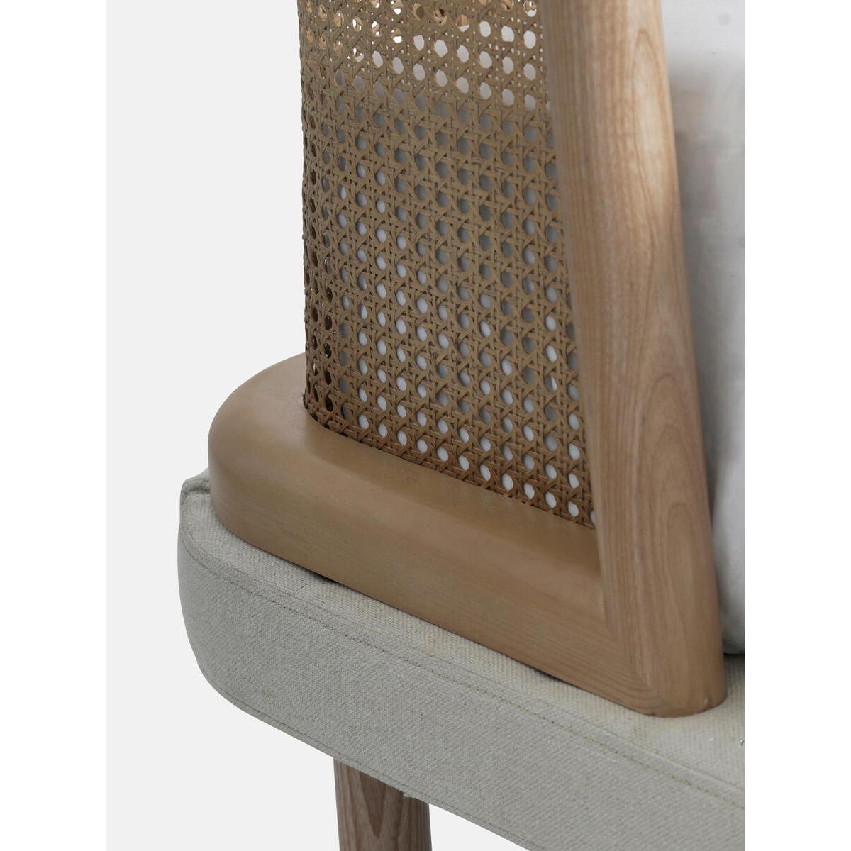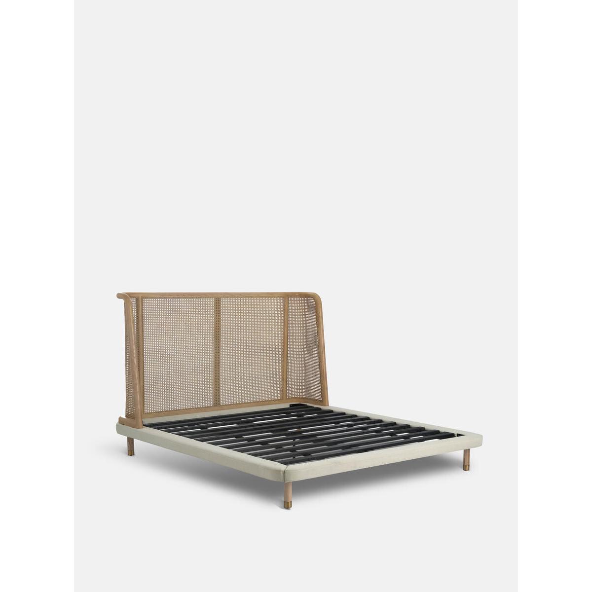 Referencing the rattan and cane furniture in the bedrooms at. Soho House Mumbai, our Hasker bed features a gently curved ashheadboard with cane panel inserts. Encased in pure linen, the baserests on low timber legs, creating a streamlined sillouhette. Solid ash headboard with caning insert. Linen upholstered frame. Inspired by Soho House Mumbai.