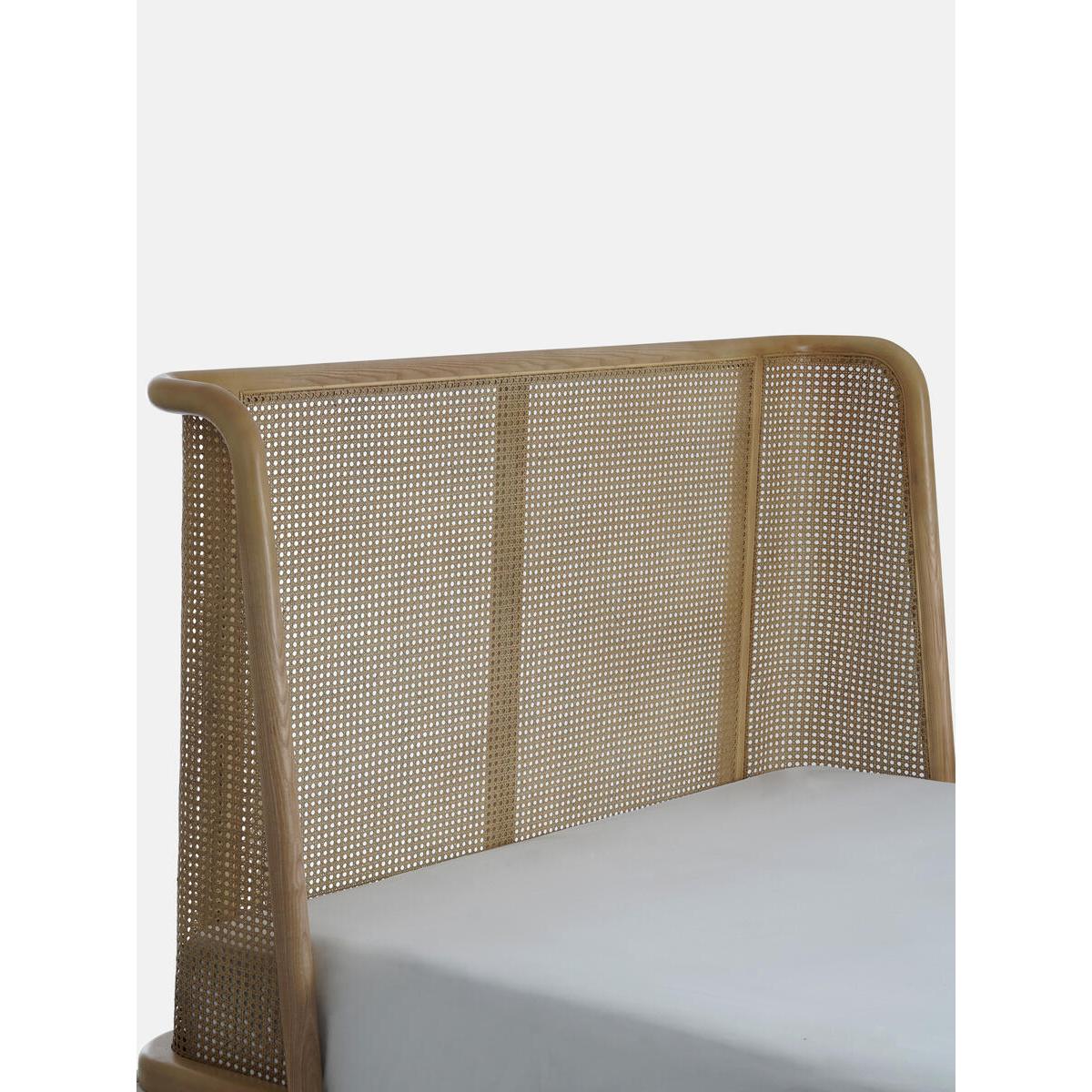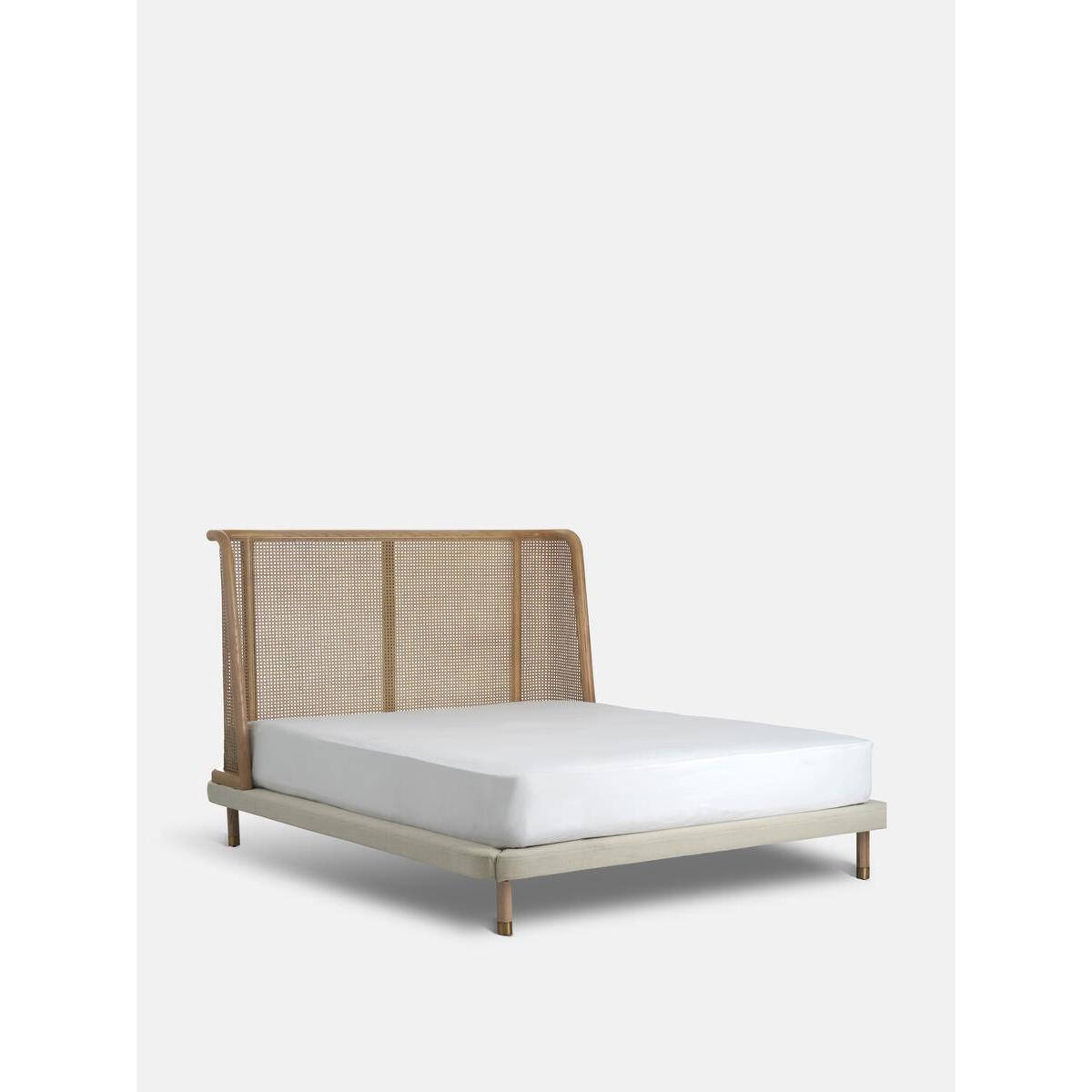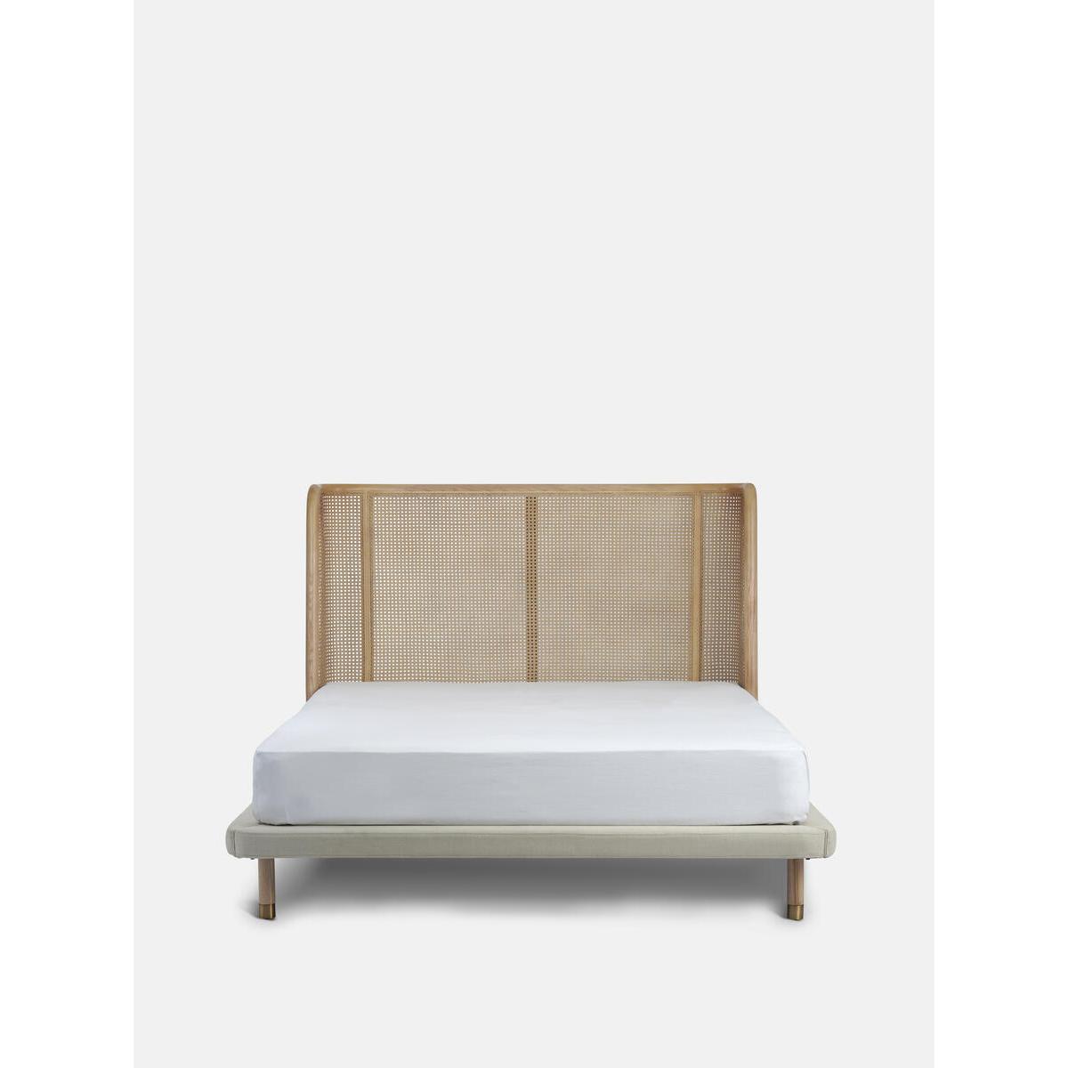 Referencing the rattan and cane furniture in the bedrooms at Soho House Mumbai, our Hasker bed features a gently curved ash headboard with cane panel inserts. Encased in pure linen, the base rests on low timber legs, creating a streamlined sillouhette. Solid ash headboard with caning insert Linen upholstered frame Inspired by Soho House Mumbai