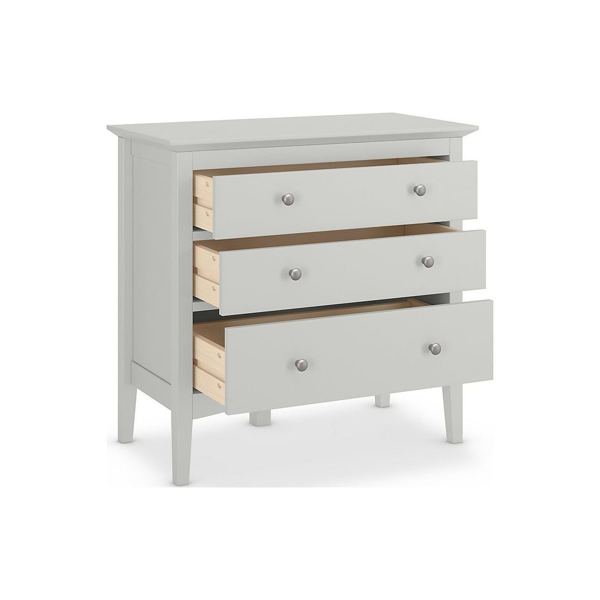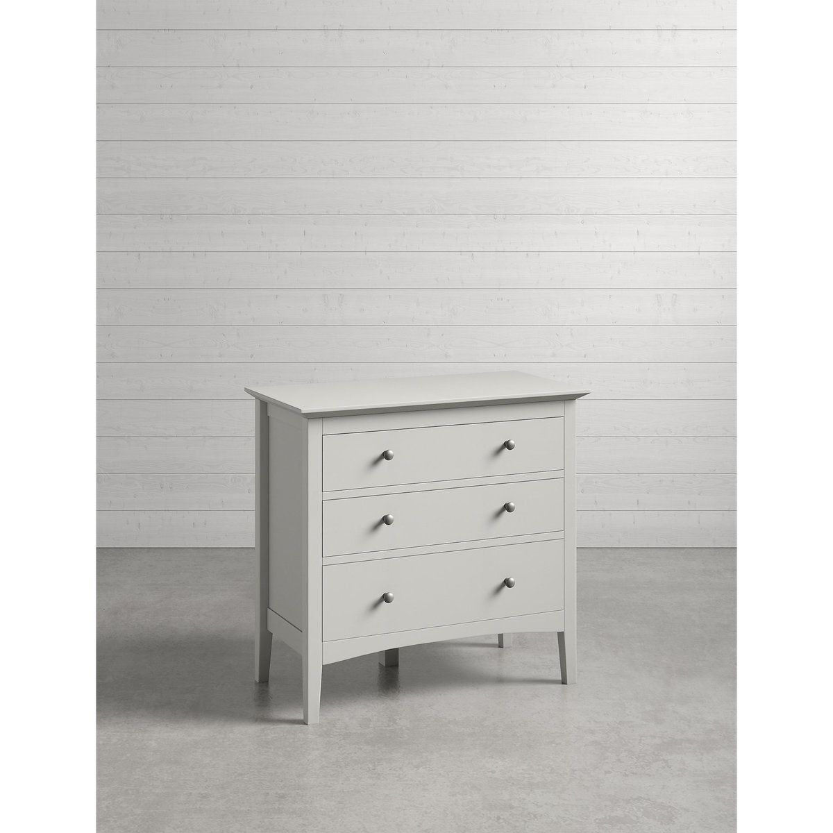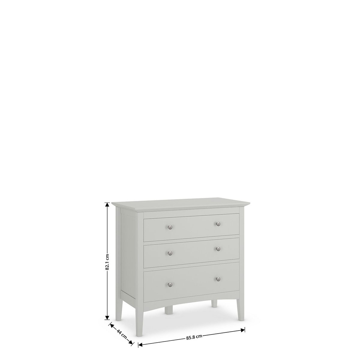 Add this bright three drawer chest to your room for extra storage and style in equal measure. Characterised by its simple design and elegant details, this charming drawer chest features tapered cornices, contrasting metal knobs, and a cut-out plinth for a modern shape that keeps your decor clean and sharp. Featuring three generously sized drawers to store your clothes, this grey drawer chest has been expertly crafted from sustainable wood for a strong and sturdy build