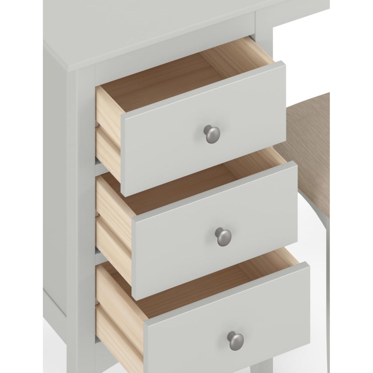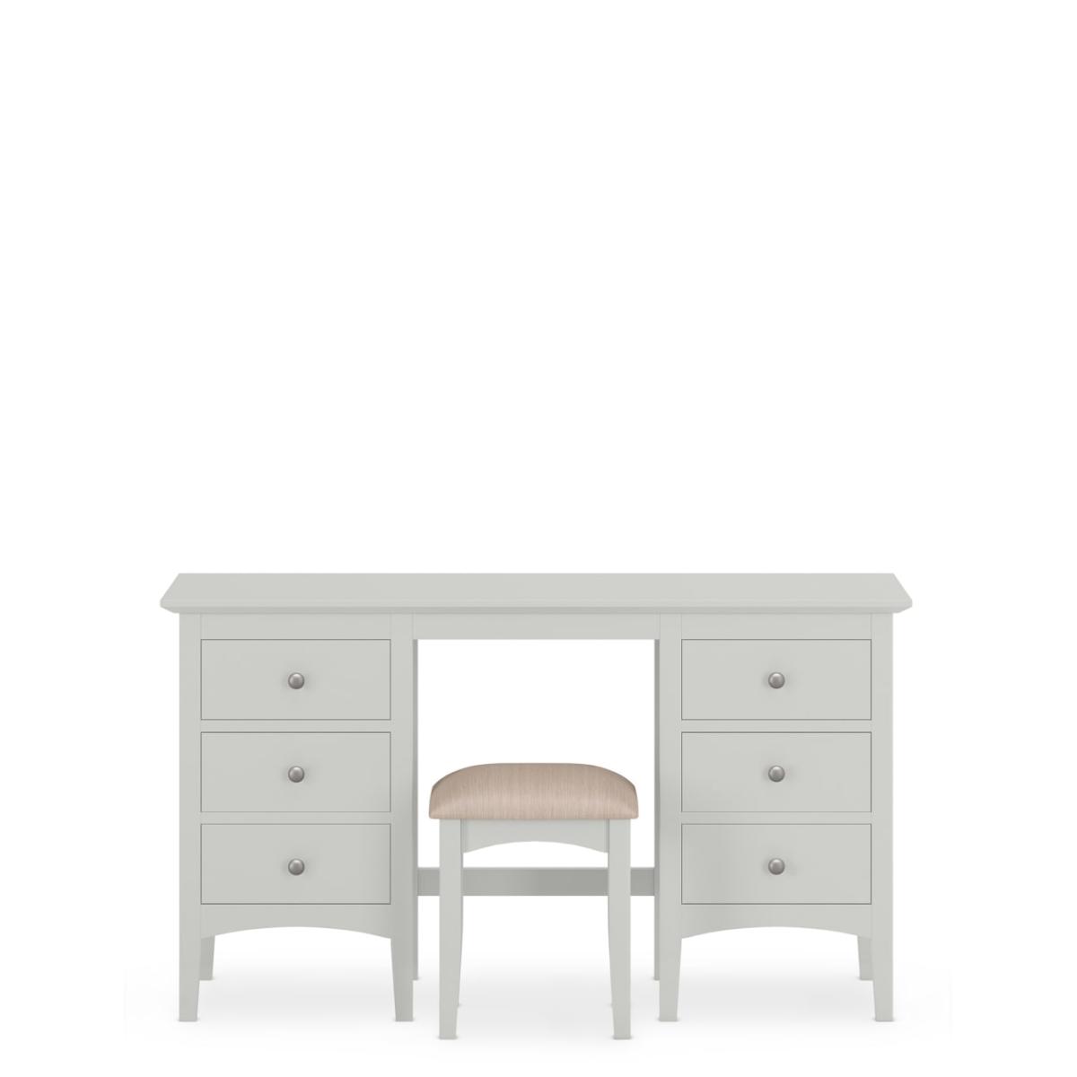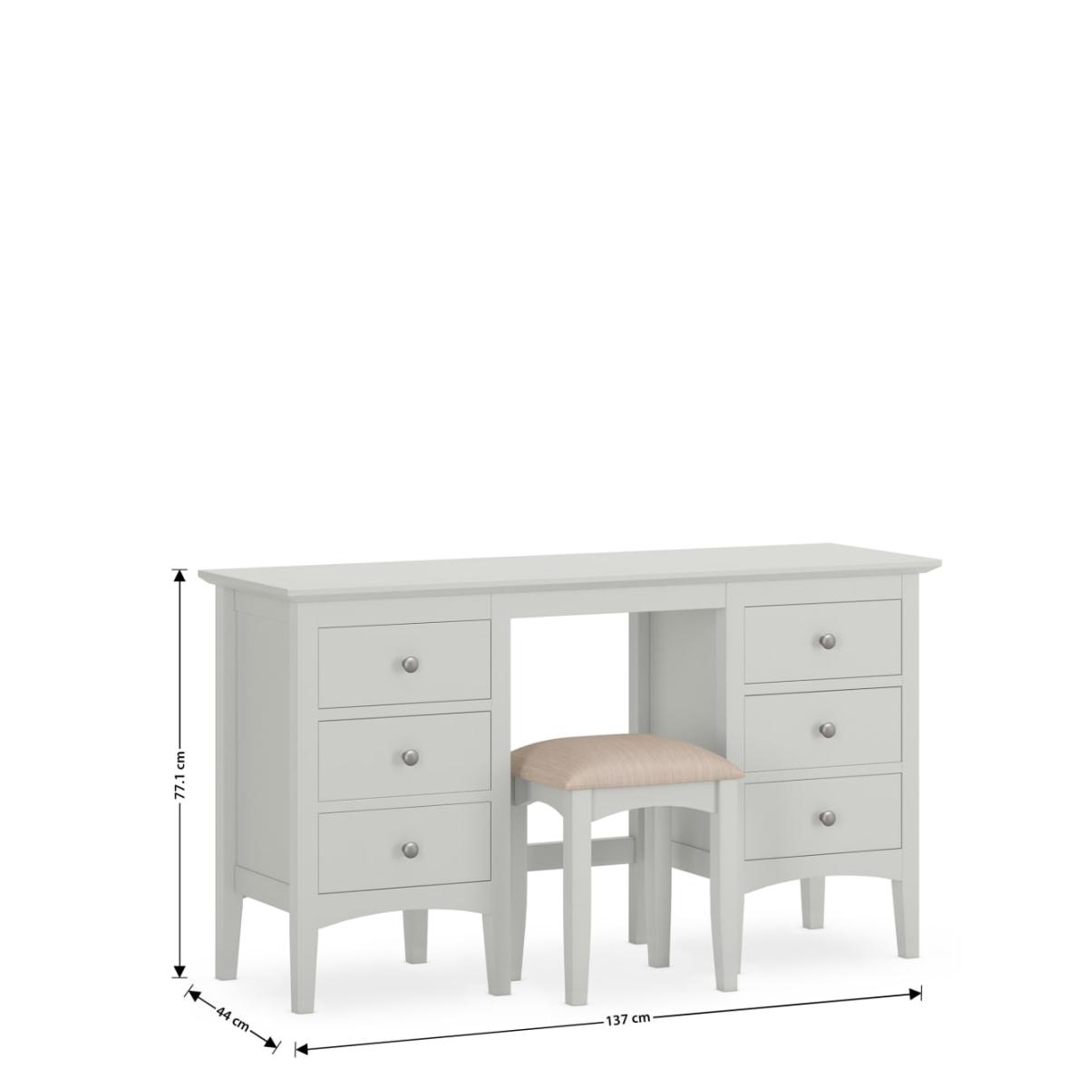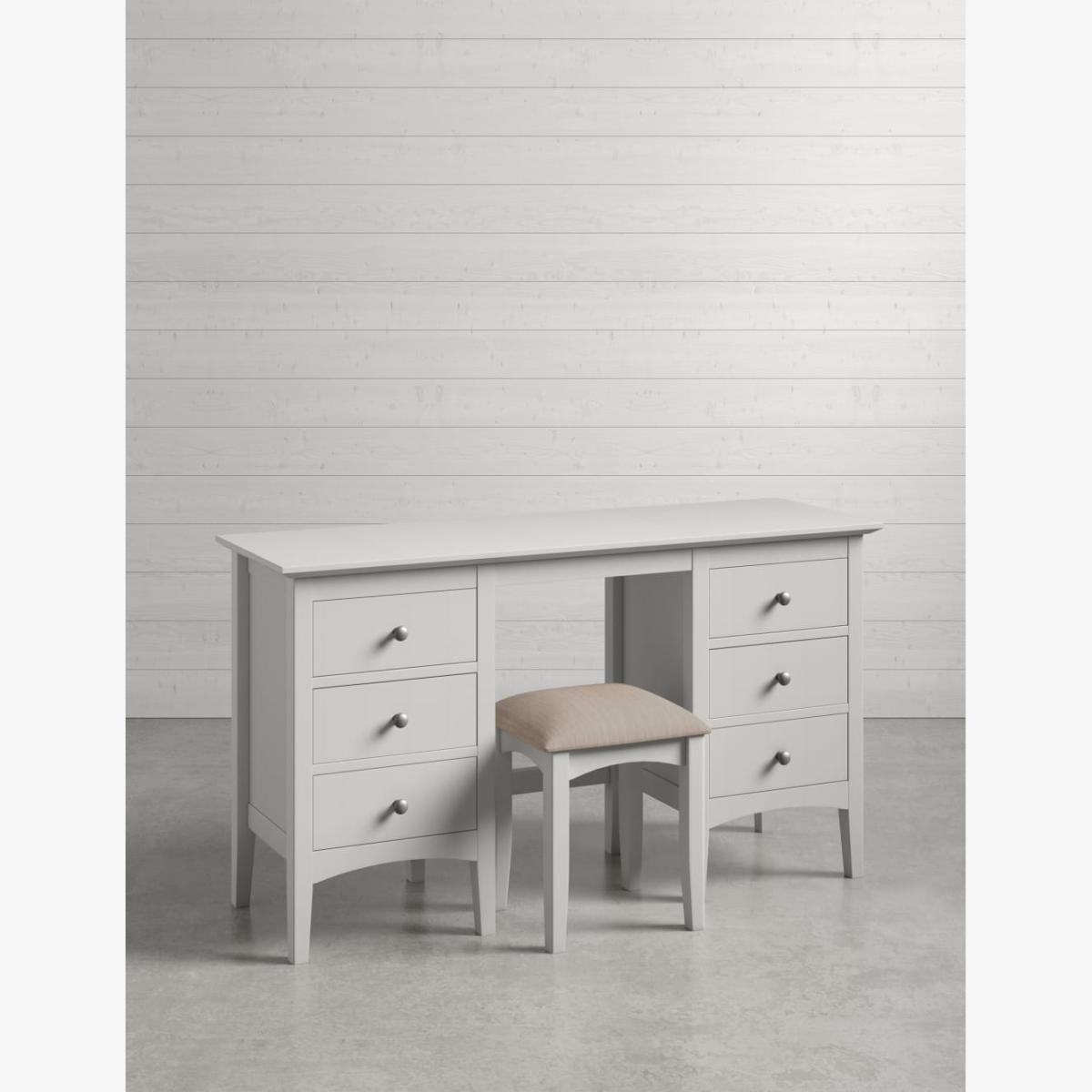 The Hastings Grey dressing table and stool make for a versatile and functional addition to various interiors. I love its neutral grey finish, which offers a calm, modern feel and works well in both contemporary and classic schemes. It’s perfect for creating a dedicated beauty or grooming space, especially in bedrooms with soft or muted colour palettes. Practical styling tips include keeping the surface clear with organised trays or beautifully simple vases, while a few framed photos or a small mirror can elevate its look. Pair it with tactile accessories like velvet cushions on the stool or a textured rug underneath for added comfort and visual interest. Its clean lines and subtle colour make it easy to integrate into spaces without overwhelming the overall design.