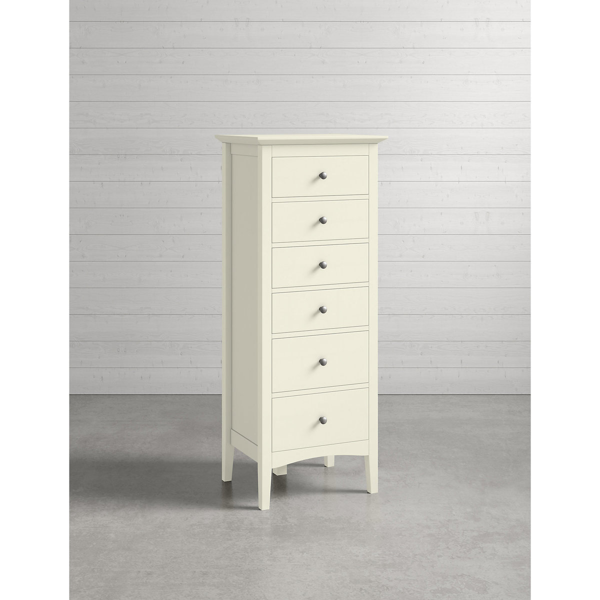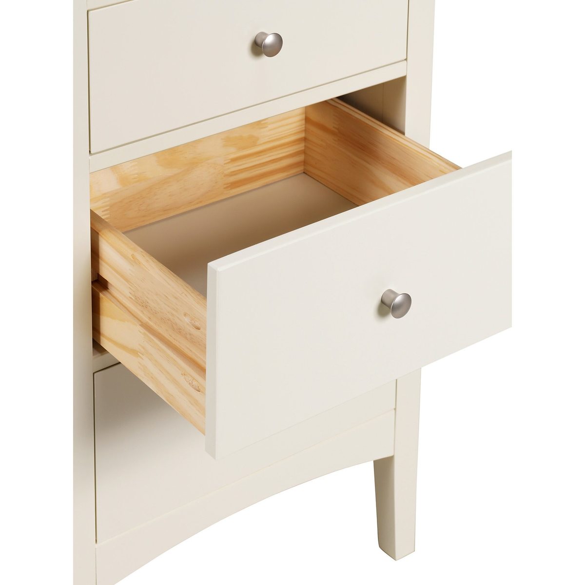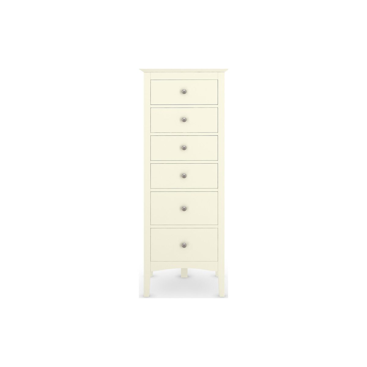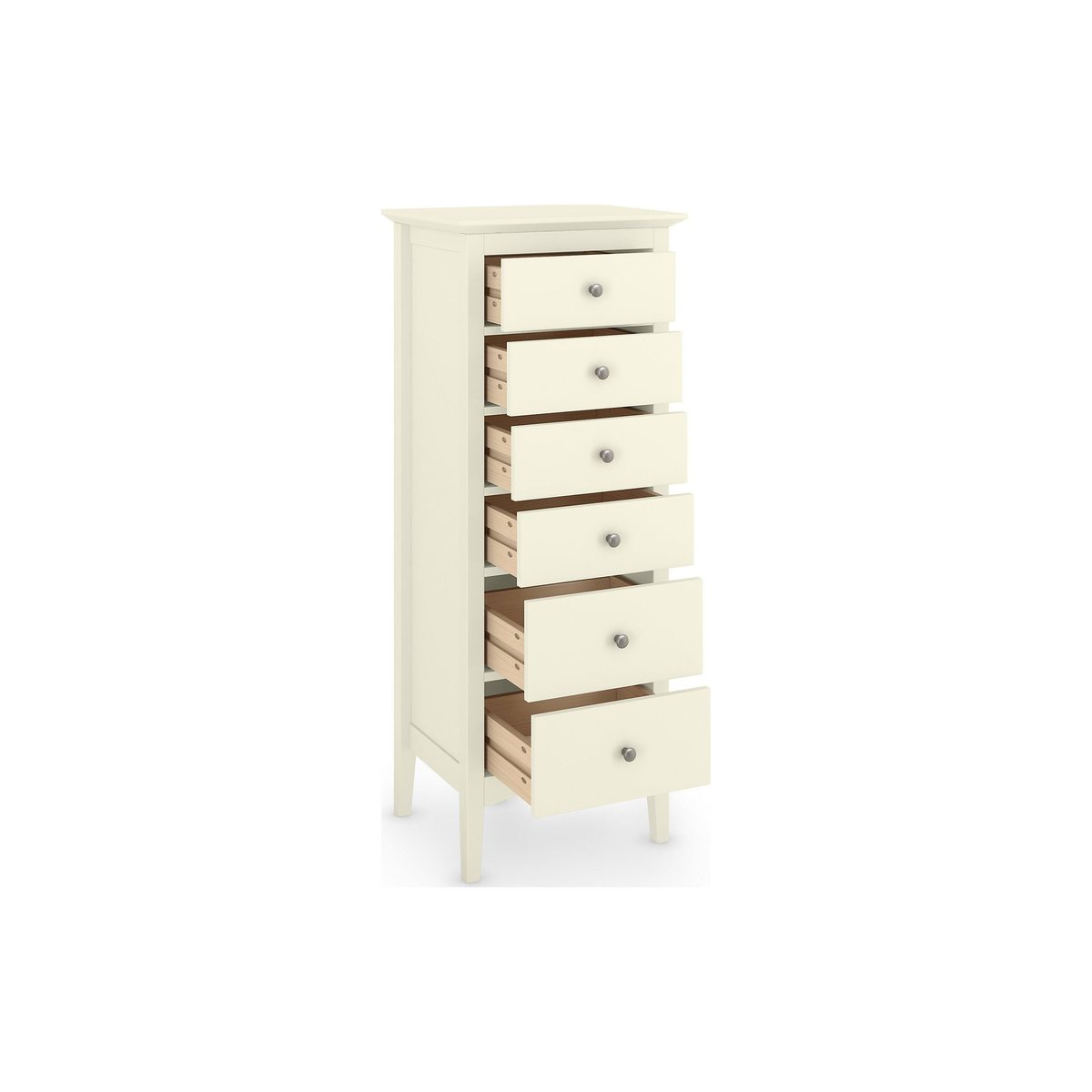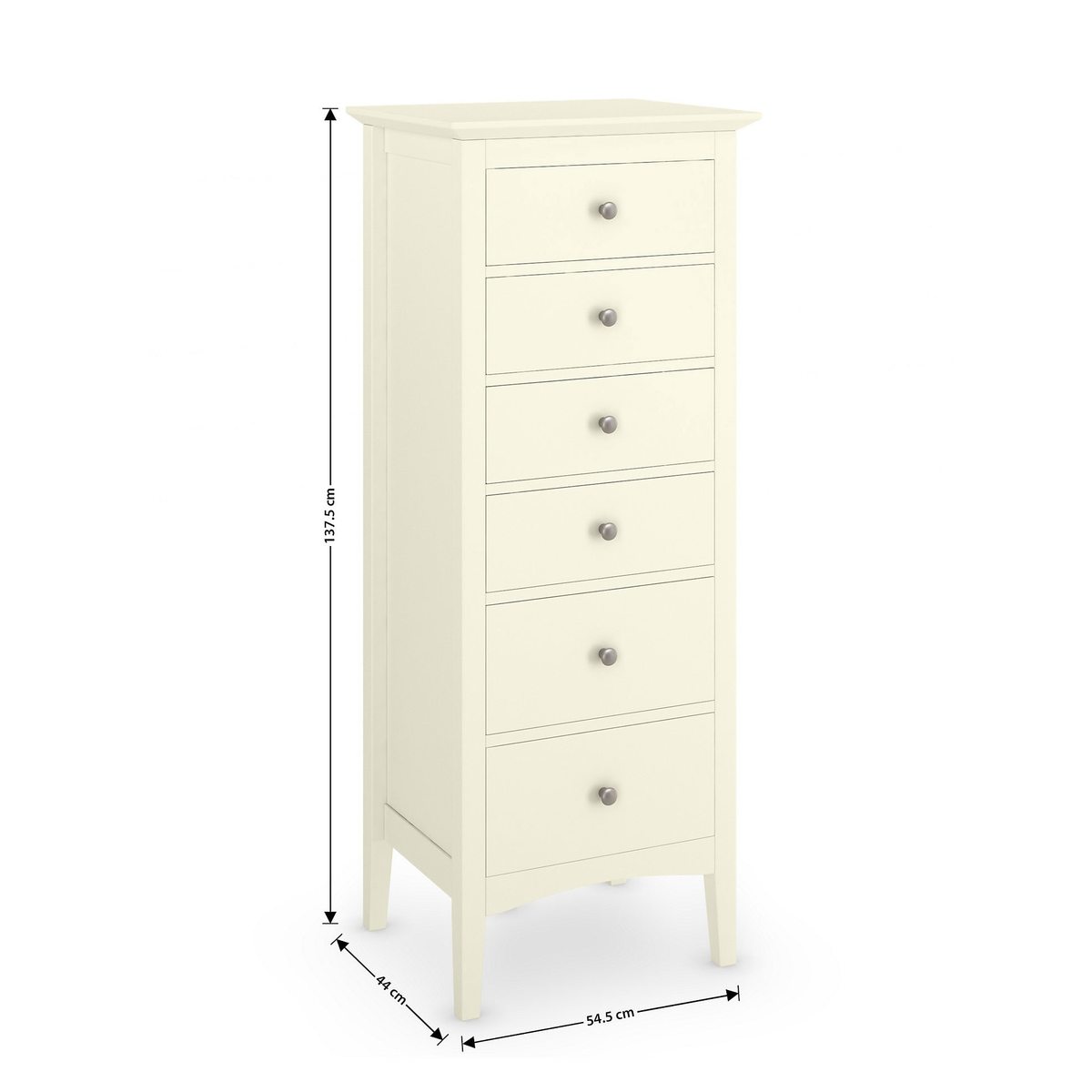 Designed to fit into small spaces, yet providing plenty of space for de-cluttering rooms, the stylish Hastings Tallboy is an elegant addition to any room. Featuring six drawers: four small drawers and two deeper drawers, you\u2019ll have plenty of space for all sorts of items. This elegantly tall and slim chest of drawers is made from sustainable wood with factory glued and pressed joints for extra strength and finished in a classic soft ivory colour with chrome handles for a timeless look.