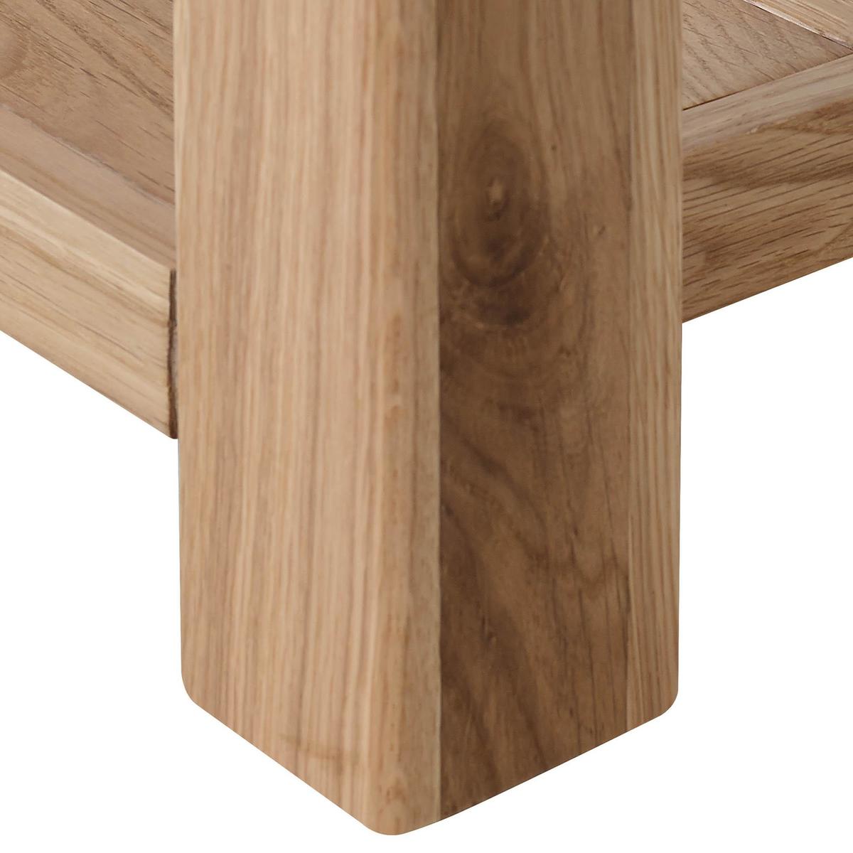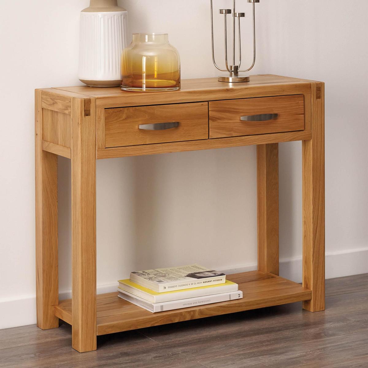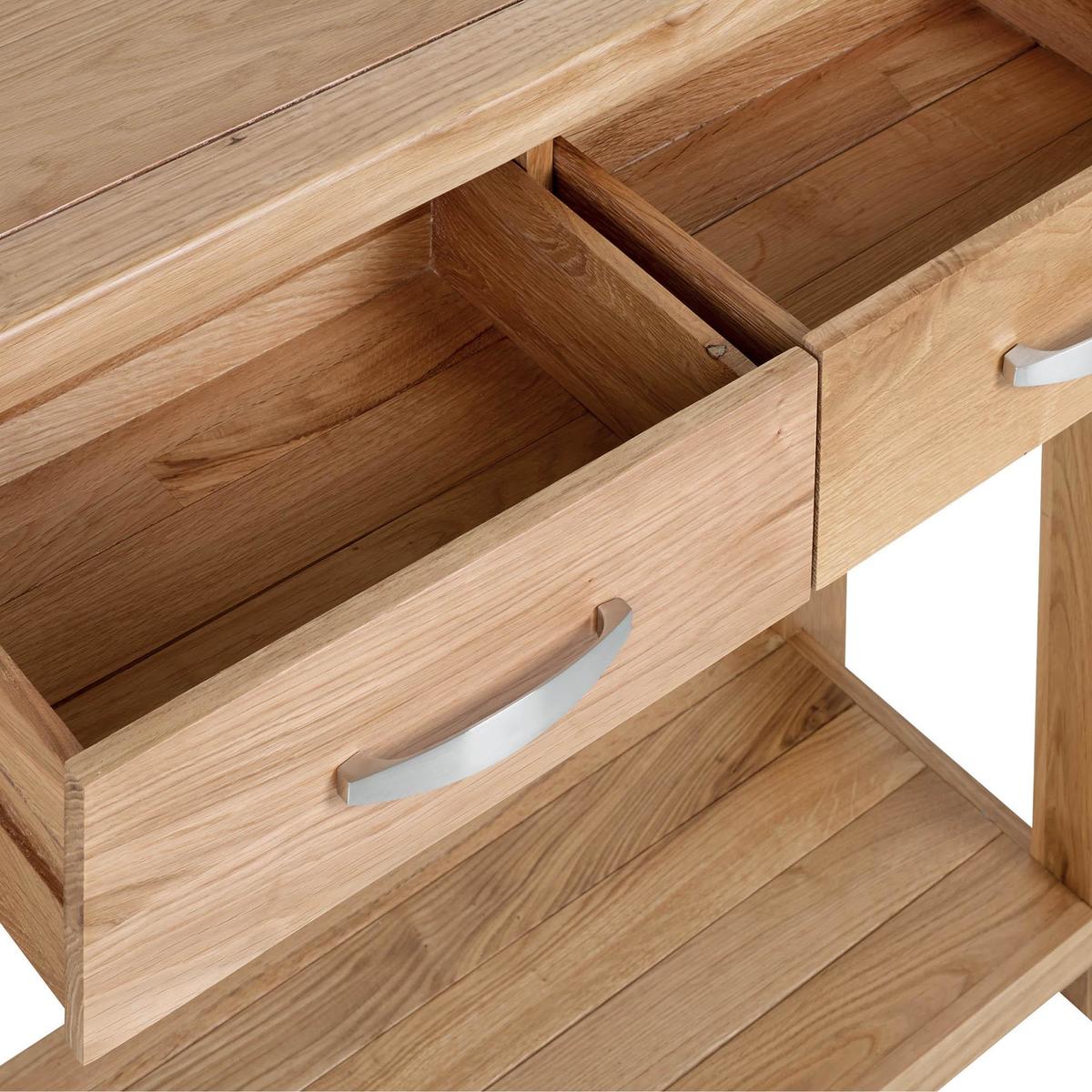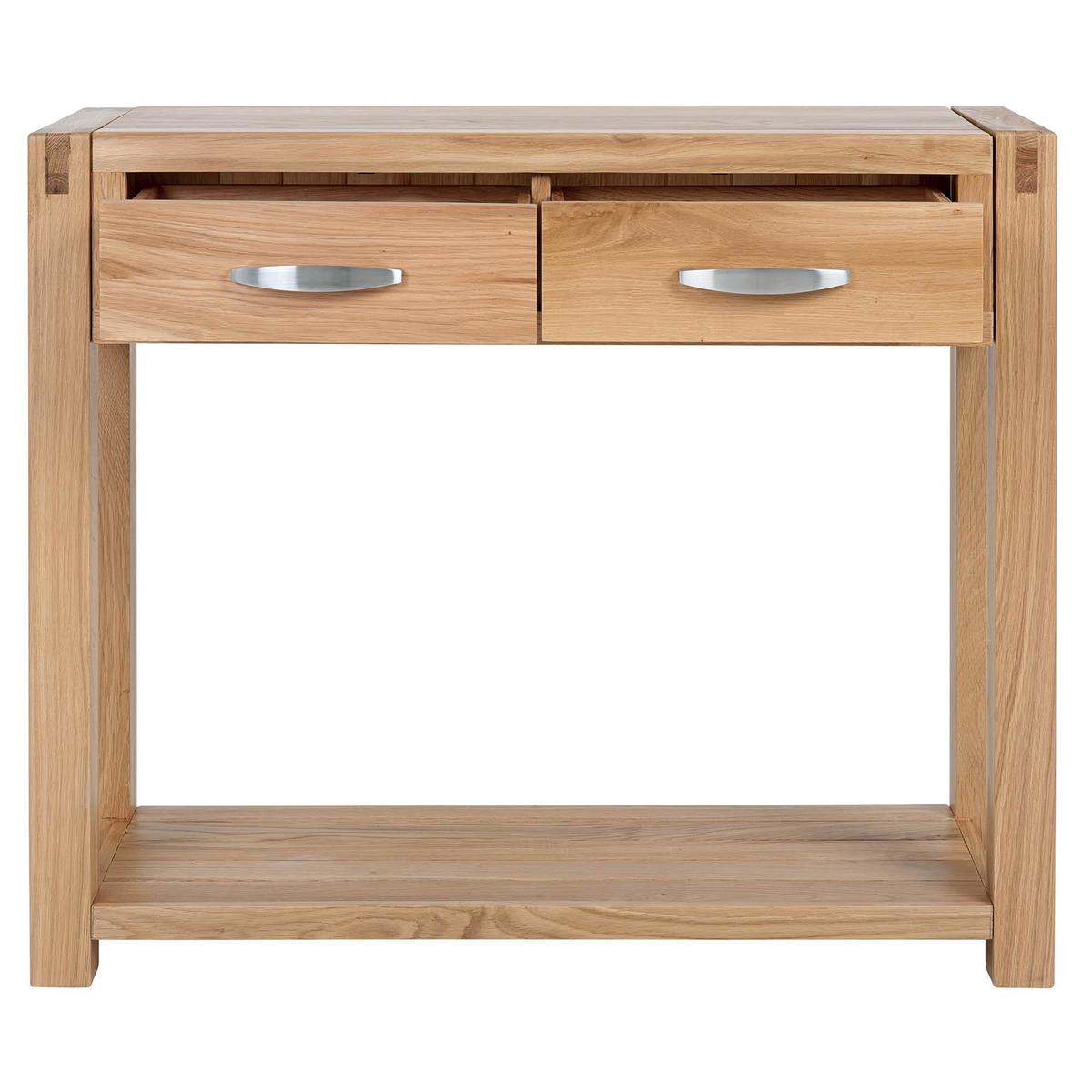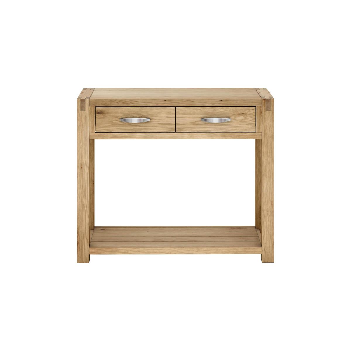 Dunelm Exclusive - Designed and Developed by Dunelm. Featuring a low panelled shelf and two spacious drawers, this console table is designed with enhanced natural grain patterns and contrasting silver handles. Crafted from solid oak pieces, this 100% hard wood console table is finished with layers of smooth lacquer.