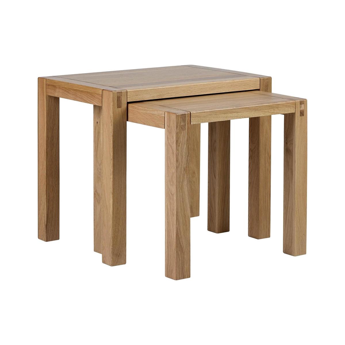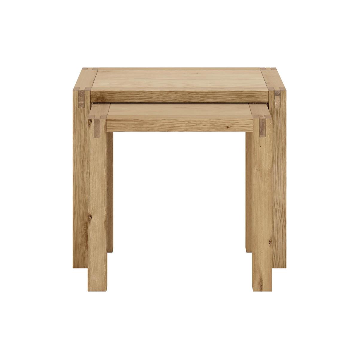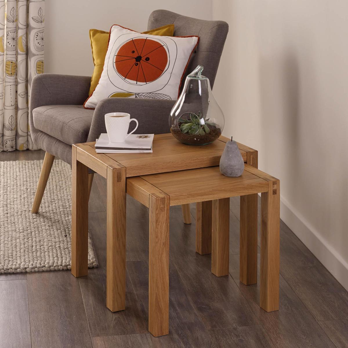 Dunelm Exclusive - Designed and Developed by Dunelm. Crafted from solid pieces of 100% oak with layers of lacquer to enhance the natural tone, this warm oak nest of two tables feature unique grain patterns and traditional workmanship.
