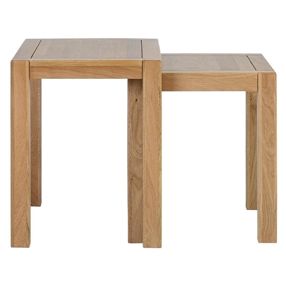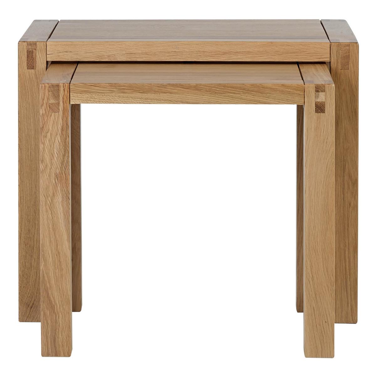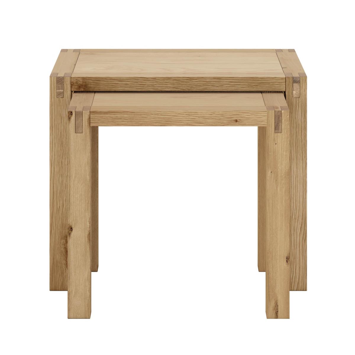 Dunelm Exclusive - Designed and Developed by Dunelm. Crafted from solid pieces of 100% oak with layers of lacquer to enhance the natural tone, this warm oak nest of two tables feature unique grain patterns and traditional workmanship.