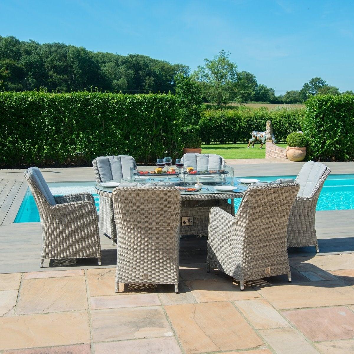 Design. Make outdoor entertaining a breeze with the Hathaway 6 seater garden dining set. Benefiting from a glass-topped firepit table that’s just perfect for grilling food and creating atmosphere come nightfall, it’s as practical as they come. The classic rattan furniture is given a modern update in soft grey, with comfortable seat cushions in a coordinating tone. Sturdy, stylish and sure to keep the festivities going long into the evening, this garden table and chairs will look great in any outdoor setting.
