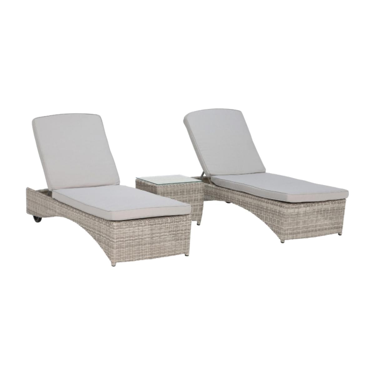 Design. Casual and cool, the Hathaway 3-piece garden sun lounger set is an effortless way to bring casual comfort to your outdoor space. In a contemporary grey colour palette, each piece features stylish and durable rattan weave that is smooth in appearance and soft to the touch. An adjustable headrest together with foam and fibre cushions ensure optimum comfort, whilst a wheeled frame allows for easy manoeuvrability. Place a refreshing drink upon the coordinating table and settle down for a sunny afternoon, or even an open-air nap.