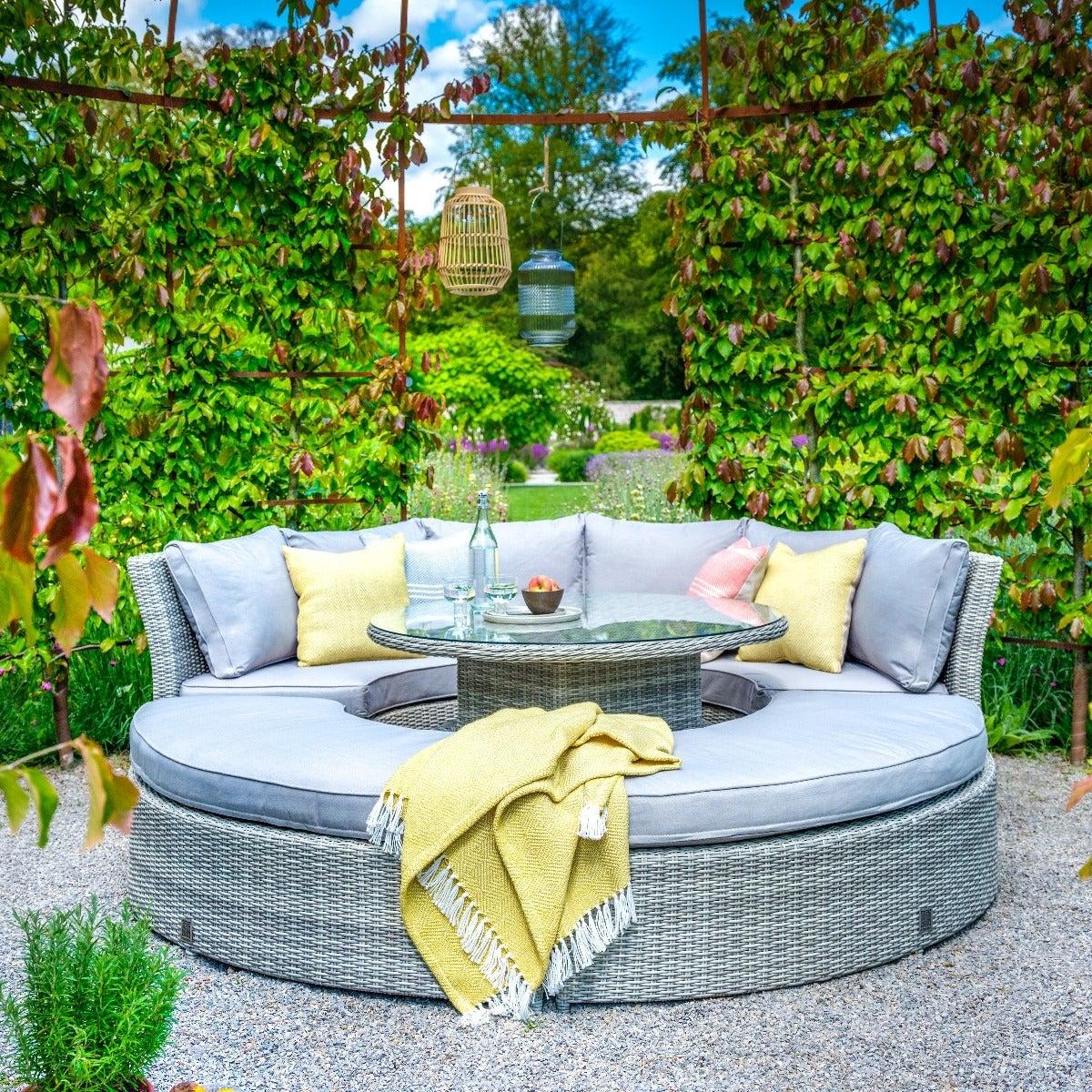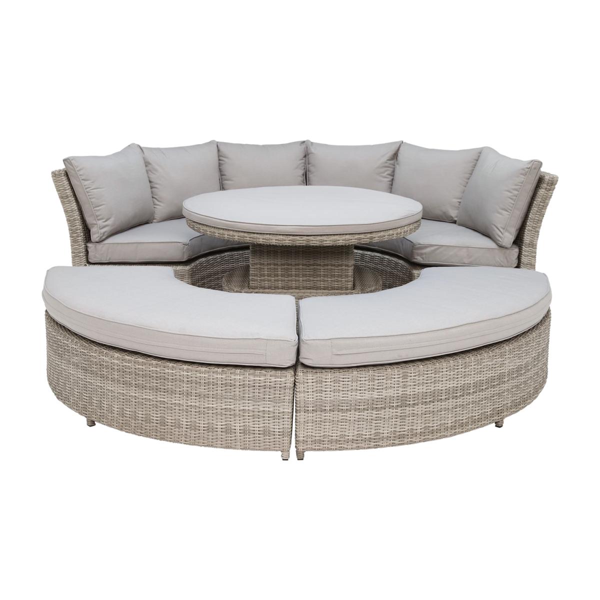 Design. From luxurious lounging by day to decadent dining in the evening, the Hathaway Lifestyle Suite includes a large cushioned bench, two smaller benches and a handy rising table with a removable cushion pad to create a versatile set that can be used for a variety of occasions. With a neat rattan weave giving this stylish set its neutral, relaxing appeal, the Hathaway can be suited to a range of garden decors and with plenty of padded cushions, you can be sure yours will be the home of choice for cosy socialising.
