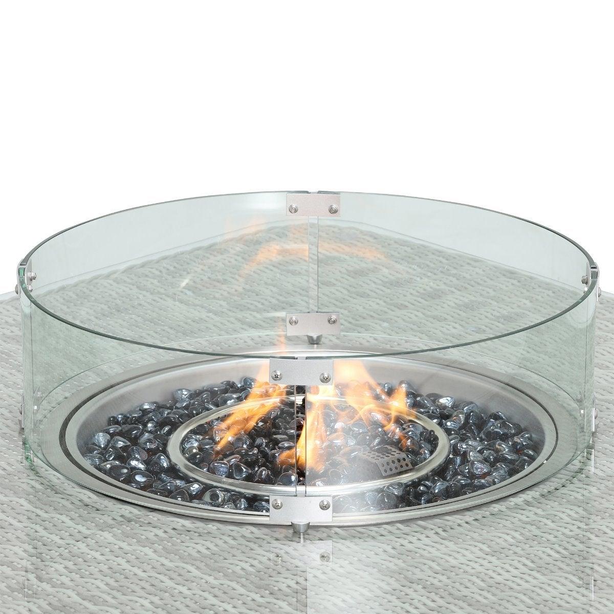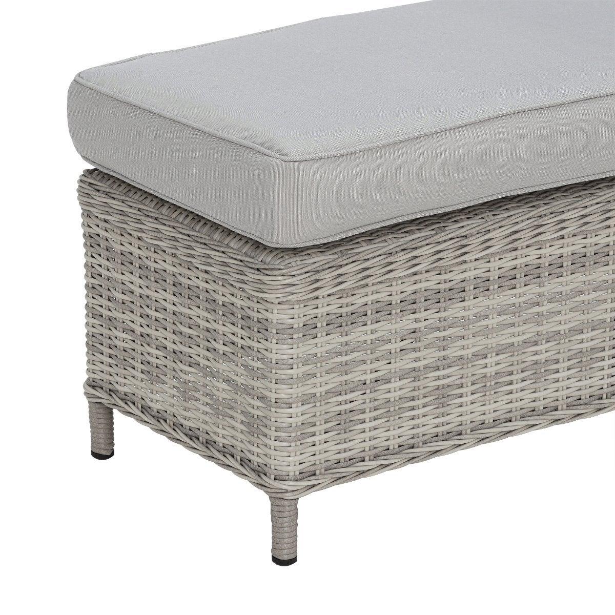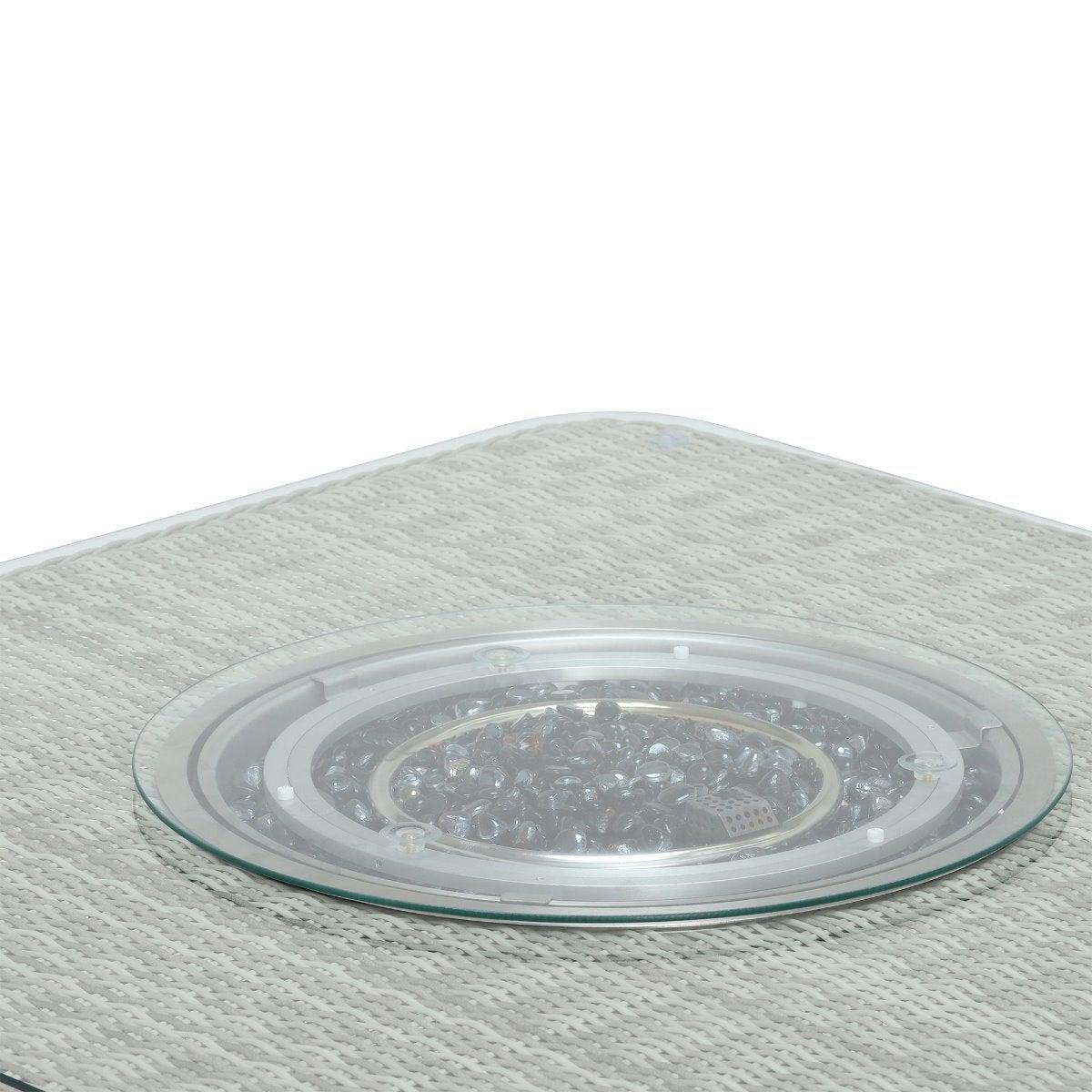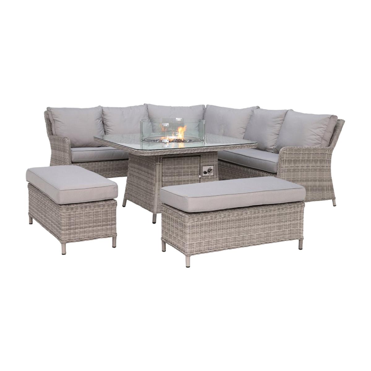 Design. Cosy up in the comfort of your garden with the Hathaway outdoor corner set. Comprised of a corner sofa, two benches and a glass-topped table with integrated fire pit, this set makes spending time in the sunshine even more enjoyable. Whether it's an al fresco feast with the family or drinks after dark, you'll benefit from the all-around support of foam and fibre cushioning. Finished in contemporary grey weave and fabric, this rattan garden furniture set will never go out of style.