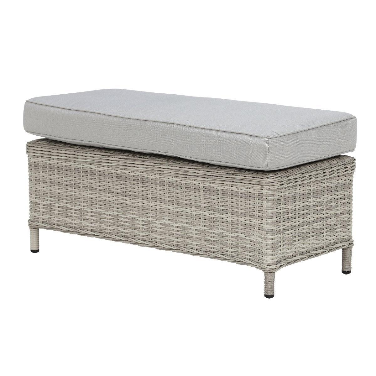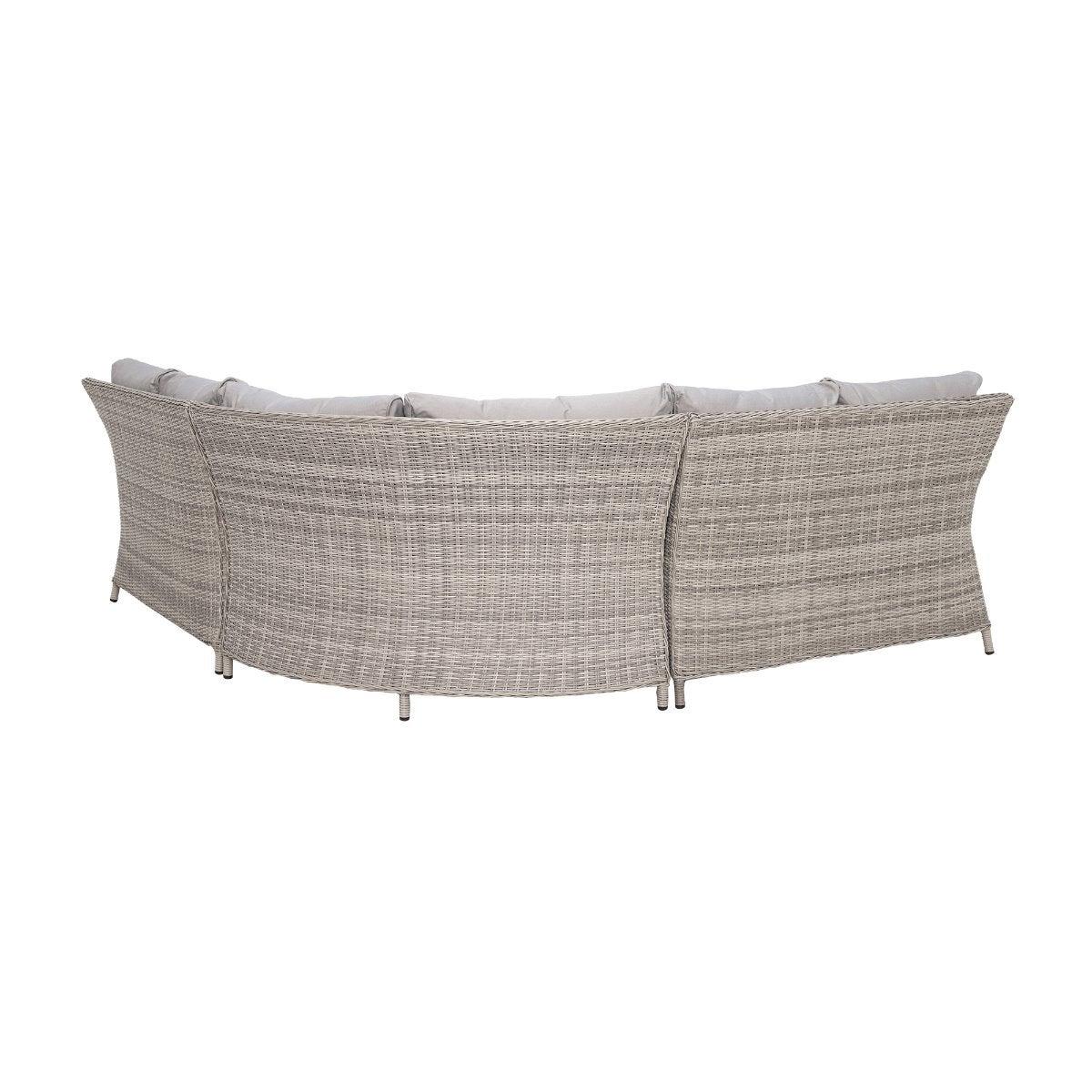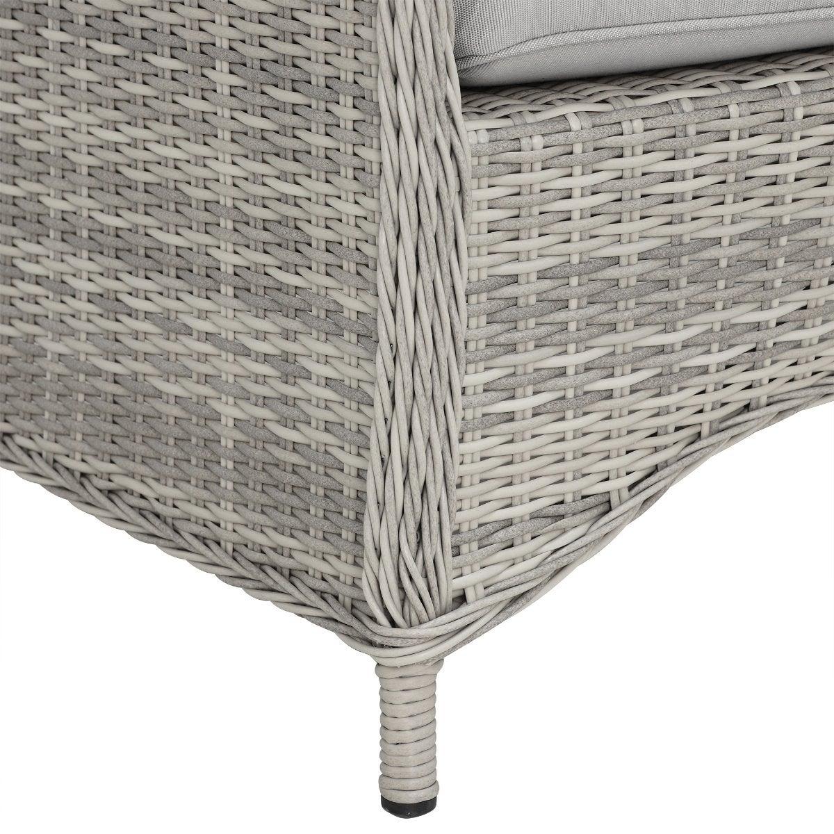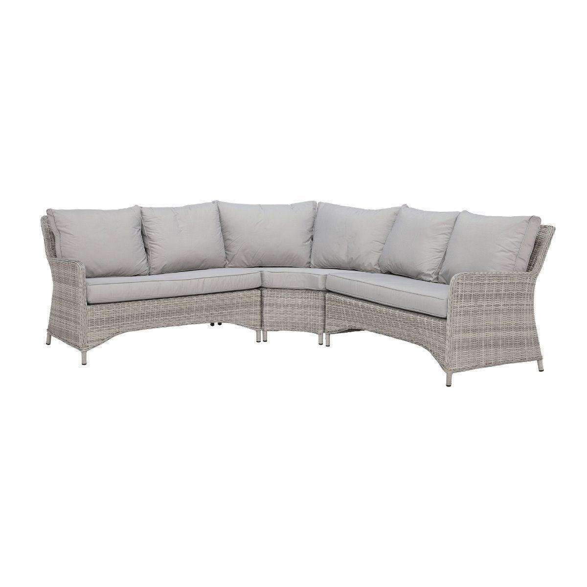 Design. Cosy up in the comfort of your garden with the Hathaway outdoor corner set. Comprised of a corner sofa, two benches and a glass-topped table with integrated fire pit, this set makes spending time in the sunshine even more enjoyable. Whether it's an al fresco feast with the family or drinks after dark, you'll benefit from the all-around support of foam and fibre cushioning. Finished in contemporary grey weave and fabric, this rattan garden furniture set will never go out of style.