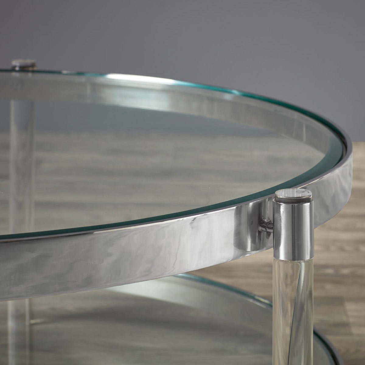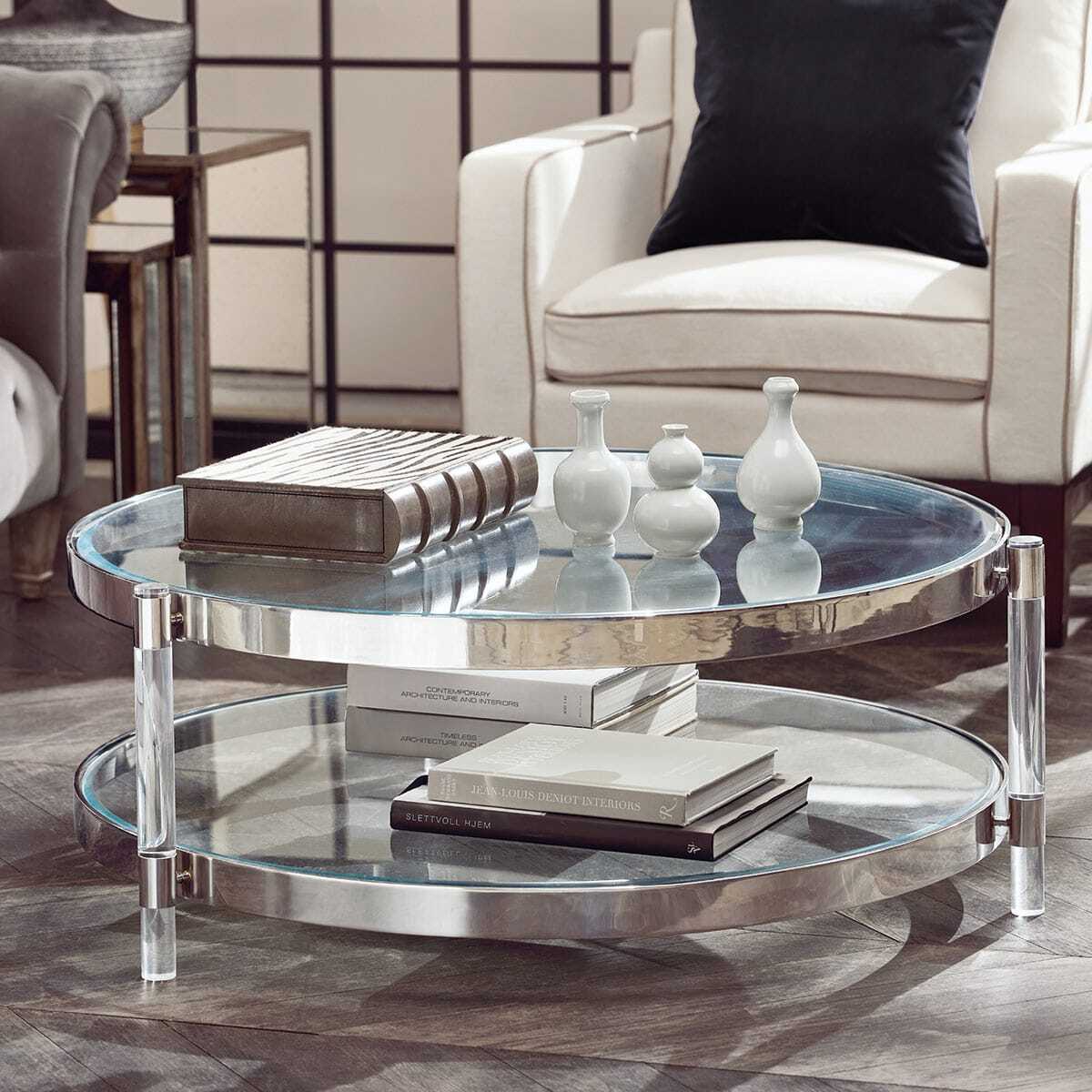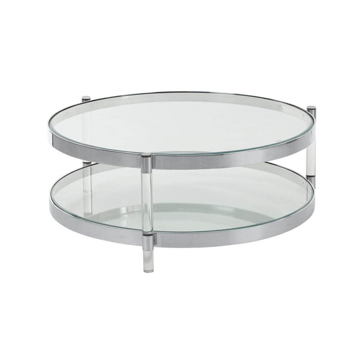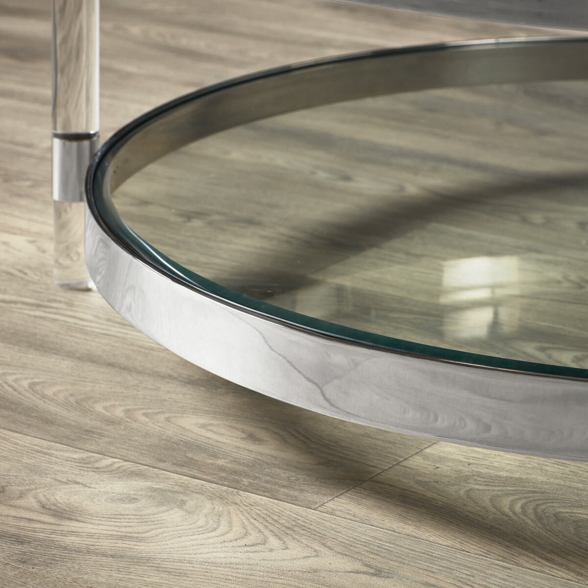 This charming contemporary coffee table reminded us of a looking glass, so we named it after a certain hare from Lewis Carroll's enchanting universe. Featuring a circular glass top and lower shelf bordered in smart stainless steel and supported by three acrylic legs, the Hatta Coffee Table is perfect for displaying books, objets d'art, and curious souvenirs from Wonderland.