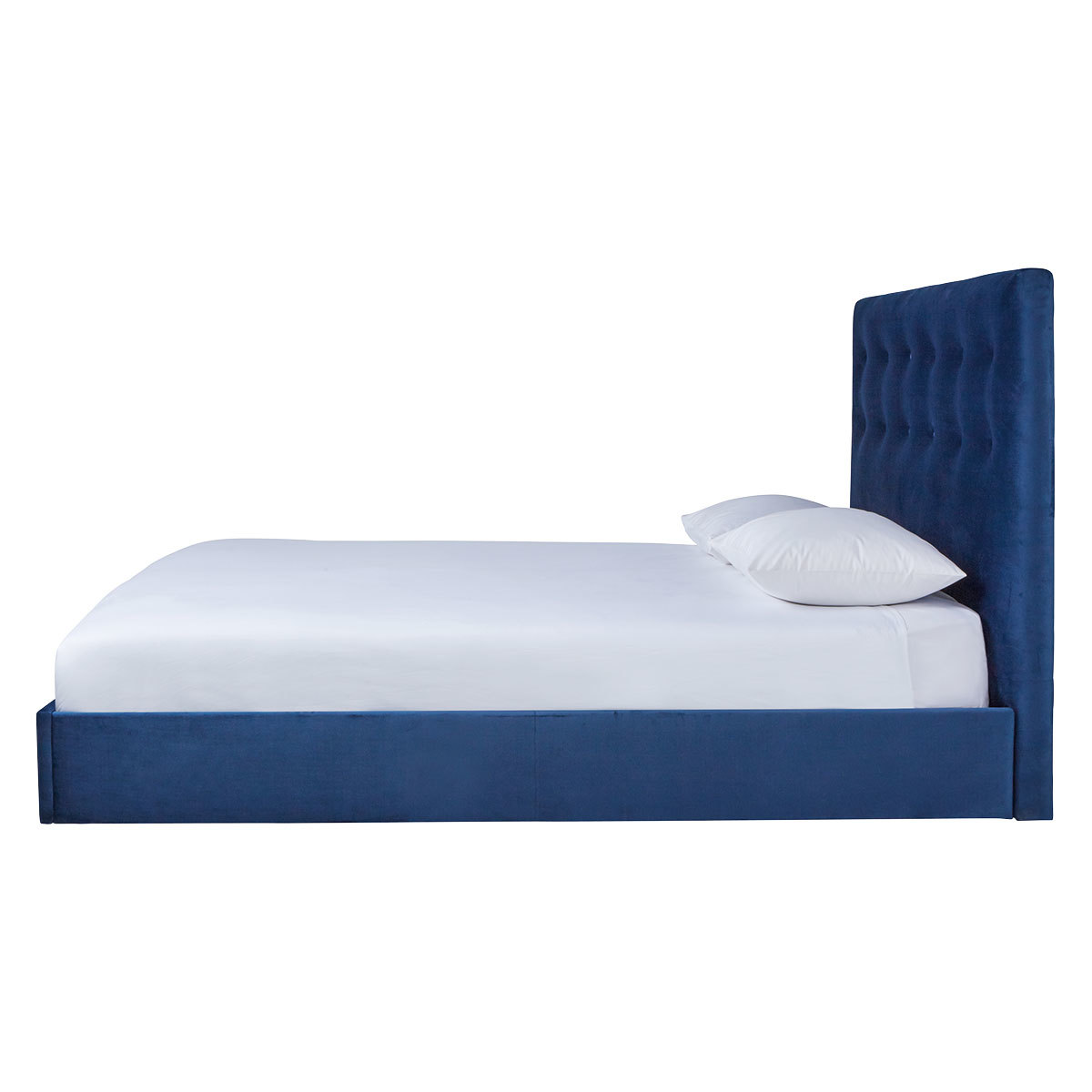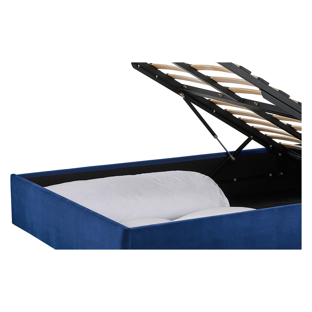 Get the high-end luxe look with a pocket-friendly price with the Hattie blue velvet king size ottoman bed frame. Designed with comfort in mind, the bed is fitted with a padded and upholstered tall headboard for extra comfort and depth and features gas lift pistons which allow the mattress to be lifted with ease revealing spacious storage below for bedding essentials and clothes. Signature button back detailing and plush velvet fabric gives the design depth, bags of personality and visual impact. Cut, sewn and upholstered by hand, Hattie will add a touch of elegance to your bedroom with its smooth, soft-to-touch curves and matches perfectly with our Linen bed sets. Part of the Hattie range, the bed is available in both double and kingsize and without storage.