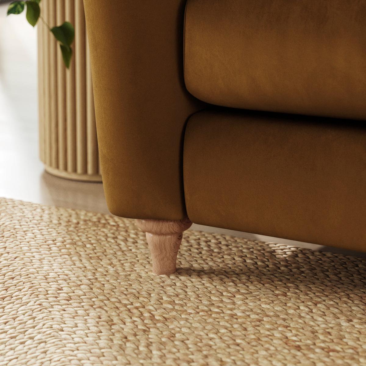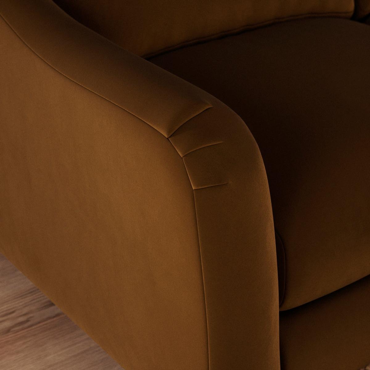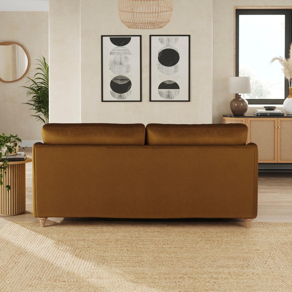 I love this sofa for its rich caramel hue, which brings warmth and a touch of luxury to any living space. The matte plush velvet adds a tactile softness that invites relaxation, making it perfect for both contemporary and classic interiors. It works particularly well in neutral or earthy colour palettes, where it can be the standout feature or complement other textiles like textured cushions or throws. Practical styling tips include pairing it with natural materials such as wood or rattan to enhance its organic vibe, and adding a few patterned cushions for visual interest. Its versatile nature makes it a great anchor piece in living rooms aiming for a cosy yet sophisticated environment.