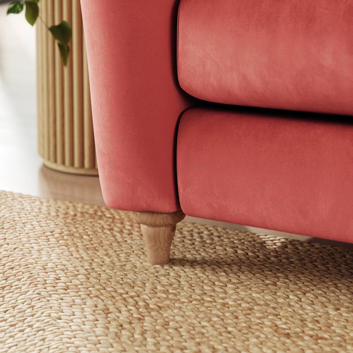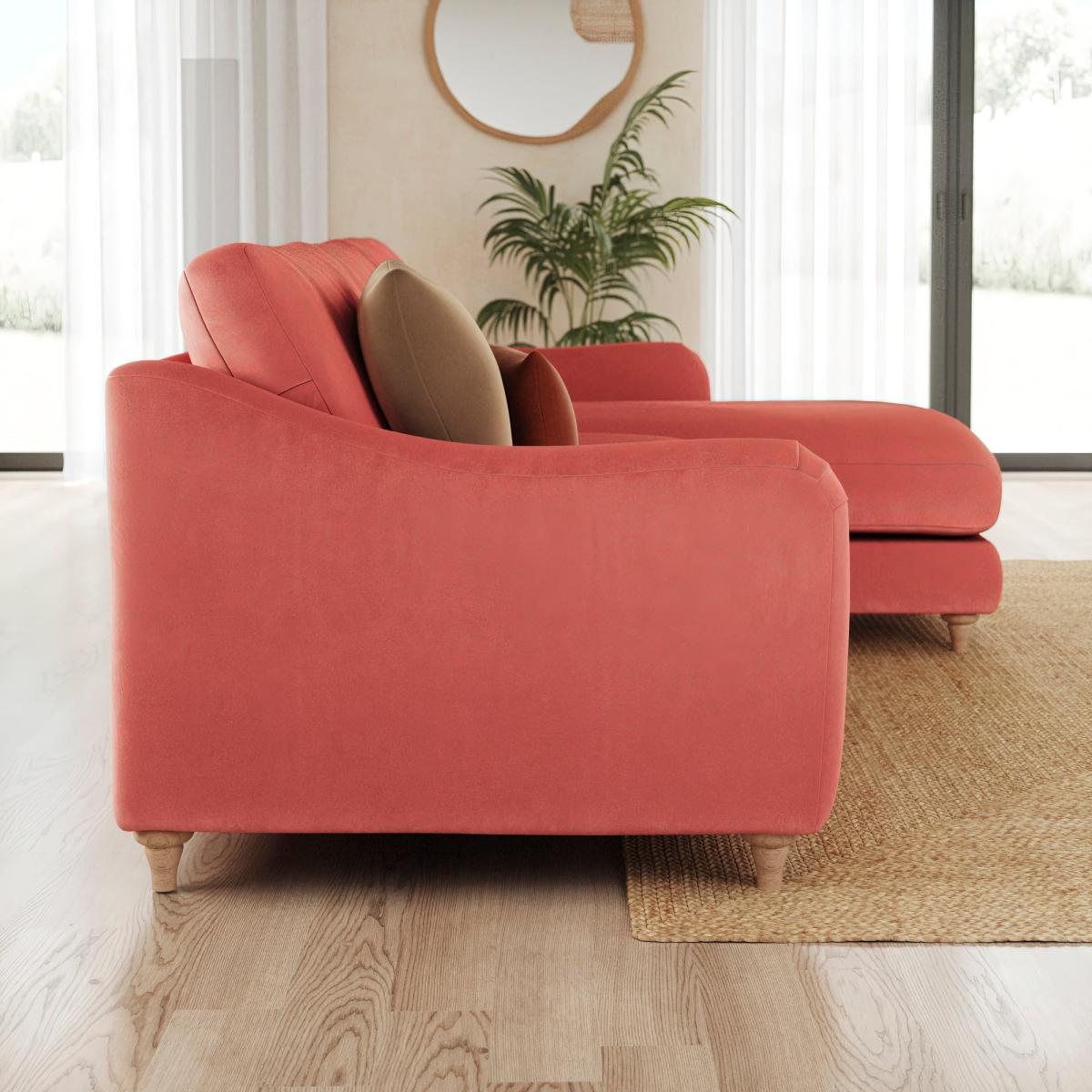 I love this lounge because of its versatile style and plush velvety texture, making it a real statement piece in both contemporary and more eclectic interiors. The warm clay colour adds depth and cosiness, perfect for creating inviting living spaces. Its corner design maximises seating without sacrificing floor space, making it ideal for open plan layouts or larger rooms. To style it effectively, consider pairing with neutral-toned accessories and layered textiles in complementary earthy shades. Pairing it with natural materials like wood or rattan enhances the relaxed vibe, while minimalist cushions keep it looking polished. Remember to keep the surrounding decor simple to allow the sofa to be its focal point, and opt for soft, warm lighting to enhance its inviting character.