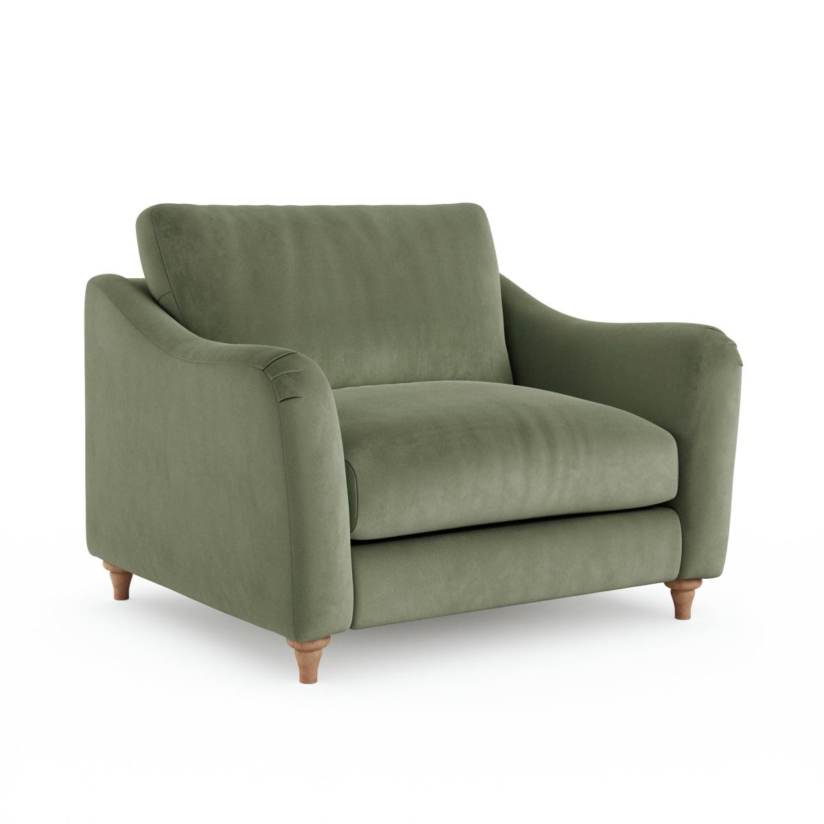 Contemporary Snuggle Sofa Soft Upholstery Curved Arms Extra Pleat Detail Featuring elegantly curved arms and an extra pleat detail, the Hattie Snuggle provides a sumptuously deep fibre-filled seat for the ultimate relaxation experience. Crafted with precision and care in Britain, this collection offers an extensive range of fabric options, the plush velvet upholstery comes in a stunning array of beautiful shades to complement any interior. This product has fibre filled seat cushions. This means they require vigorous plumped by shaking and redistributing the fibres daily. This will add air back into the fibres and preventing clumping, flattening and the seat dipping.