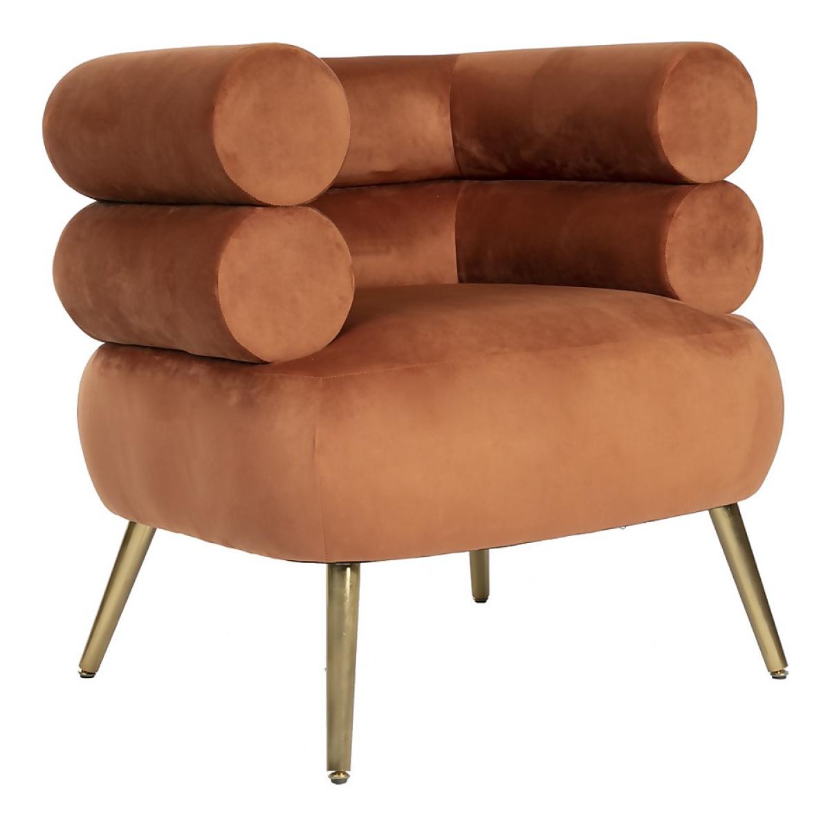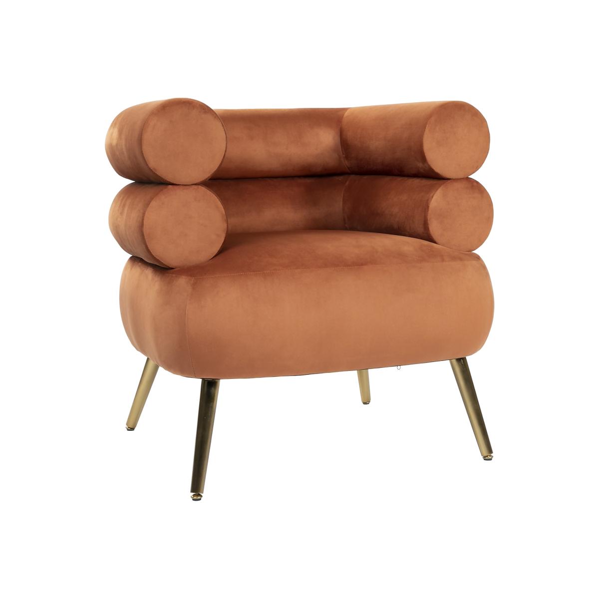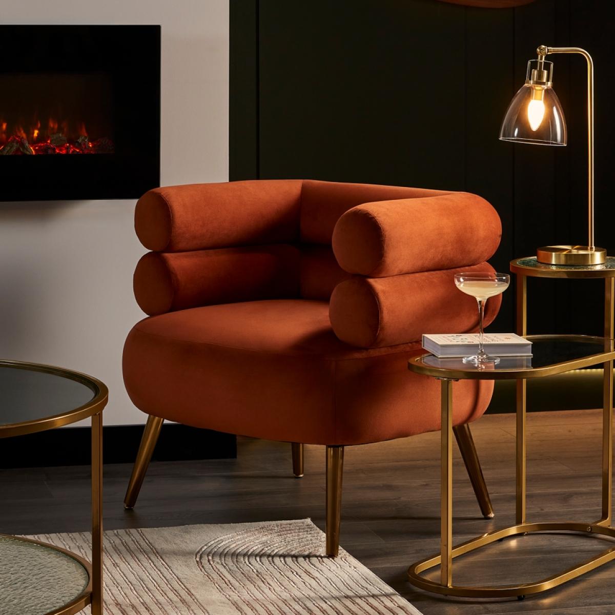Inspired by iconic retro designs, the Hattie accent chair is a real statement piece! The wrap-around, tubular backrest offers support and creates Hattie's unique shape. This occasional chair is upholstered in a luxuriously soft, bold terracotta coloured velvet and with its gold effect metal legs, it will make for a striking addition to your living room or bedroom.