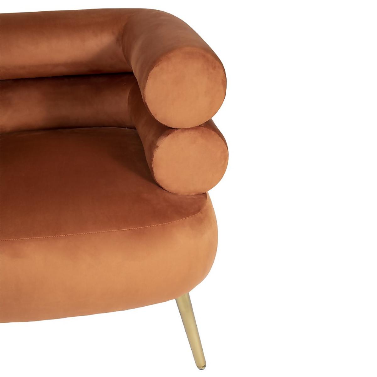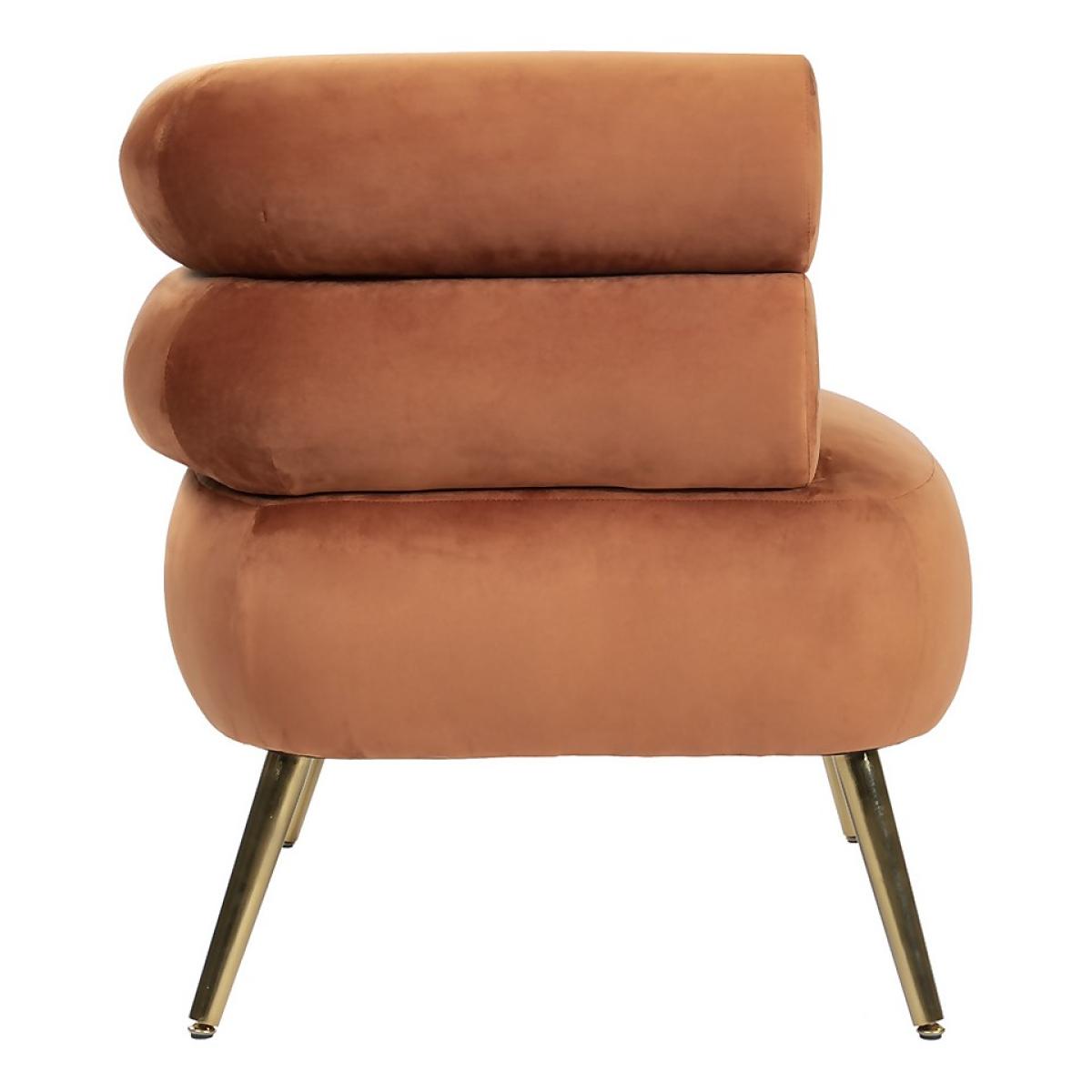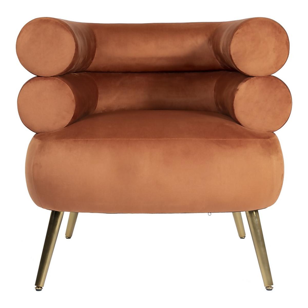 Inspired by iconic retro designs, the Hattie accent chair is a real statement piece! The wrap-around, tubular backrest offers support and creates Hattie's unique shape. This occasional chair is upholstered in a luxuriously soft, bold terracotta coloured velvet and with its gold effect metal legs, it will make for a striking addition to your living room or bedroom.