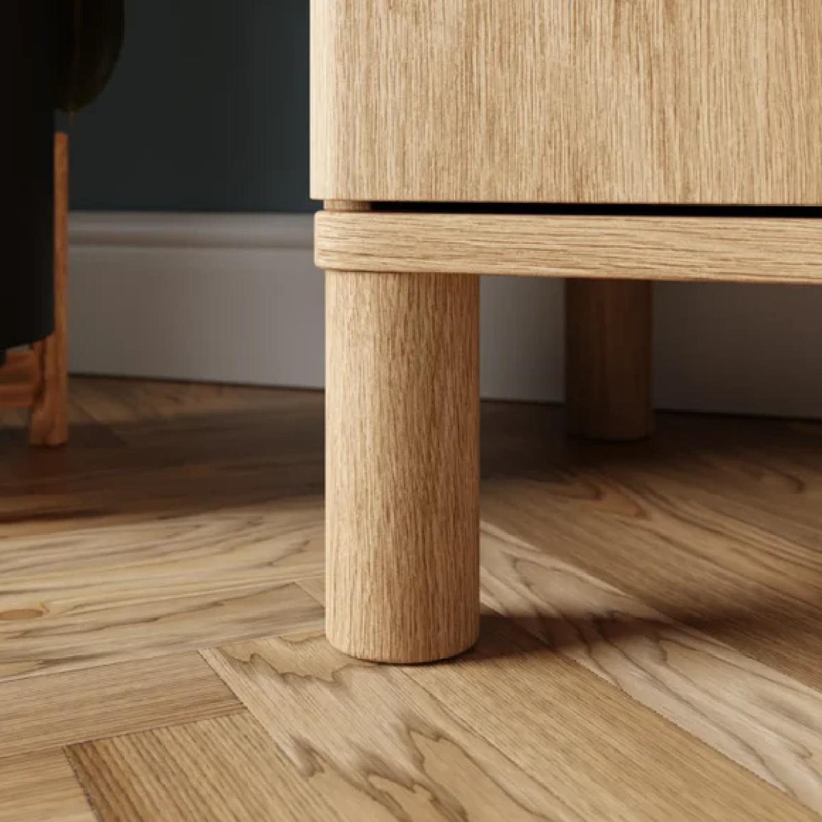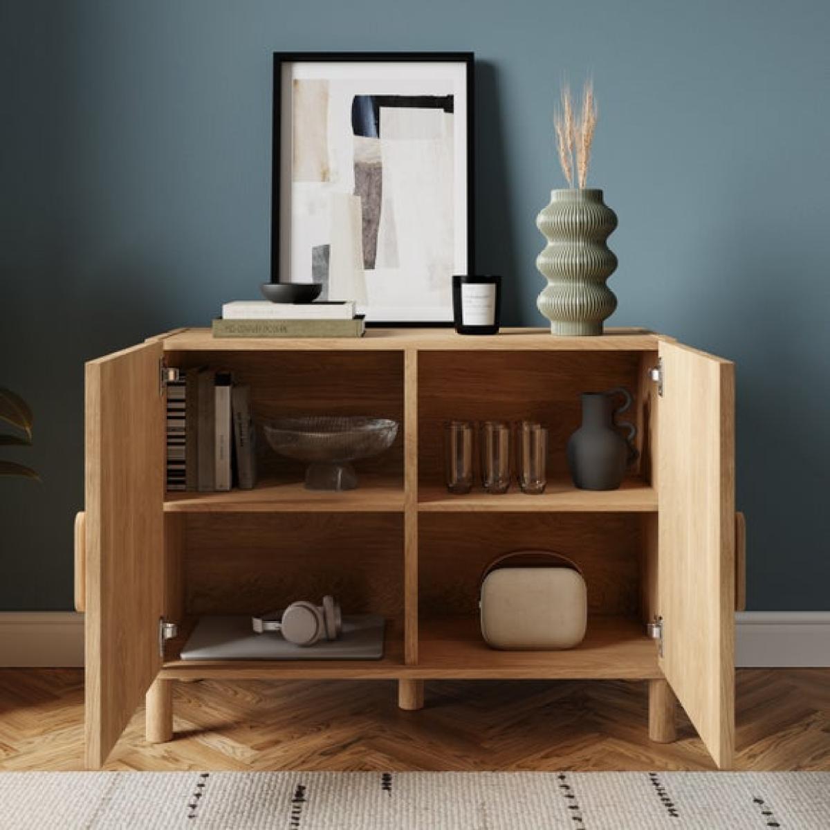 I love this little sideboard for its versatile, natural timber look that suits a variety of interiors, from Scandi-inspired spaces to more contemporary or even rustic schemes. The oak effect finish adds warmth without the maintenance of real wood, making it a practical choice for everyday use. It works well in living rooms, dining areas, or hallways, providing ample storage for essentials while keeping the space tidy. When styling, consider pairing it with minimalist accessories, potted plants, or simple artwork to highlight its clean lines and natural finish. Its compact size makes it especially suitable for smaller spaces where you want a blend of functionality and style.