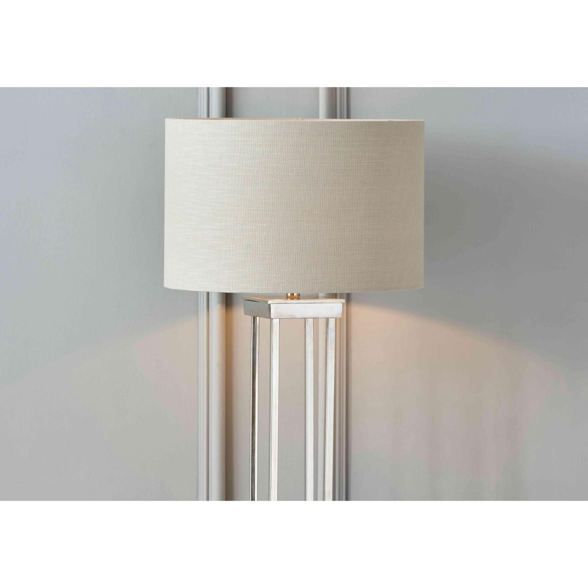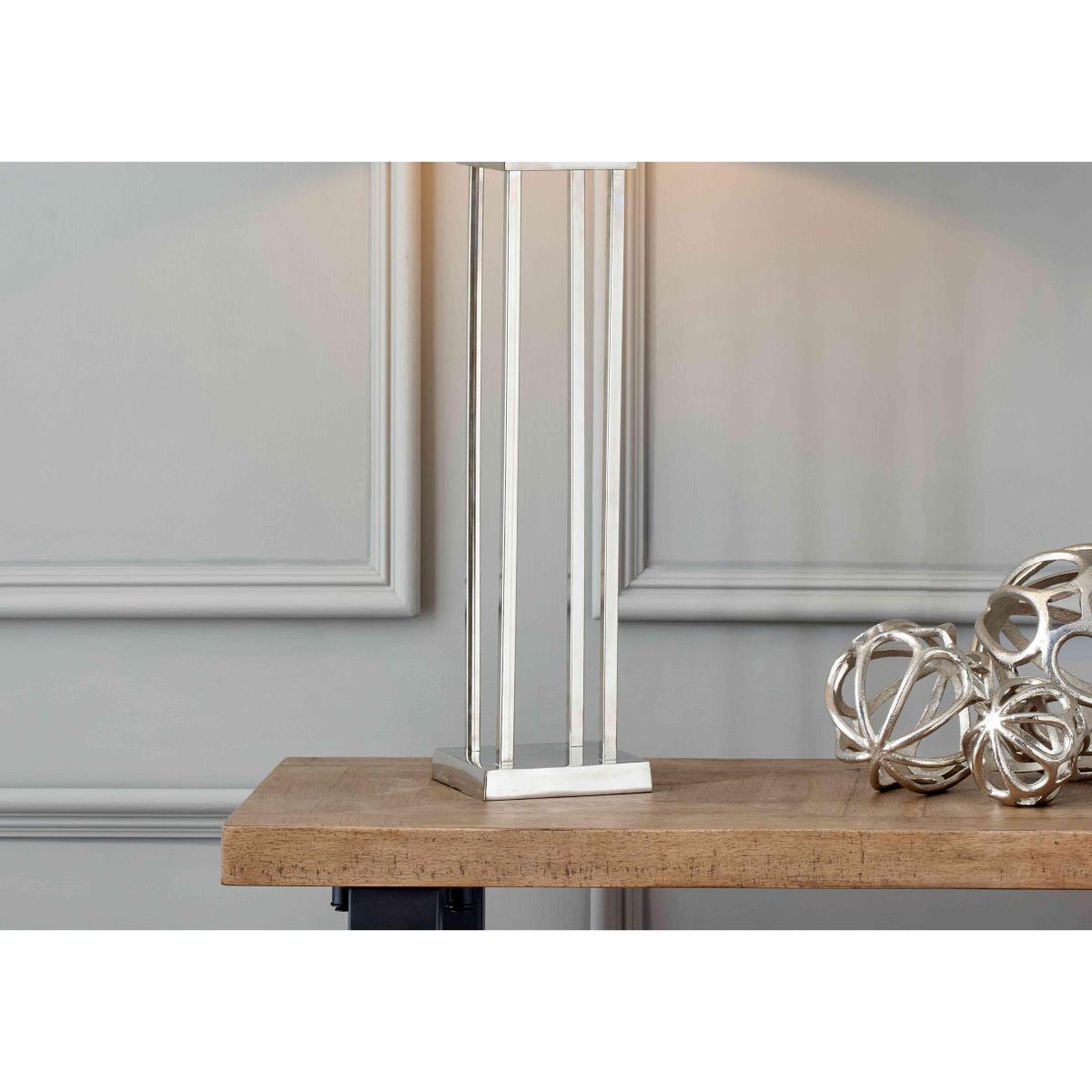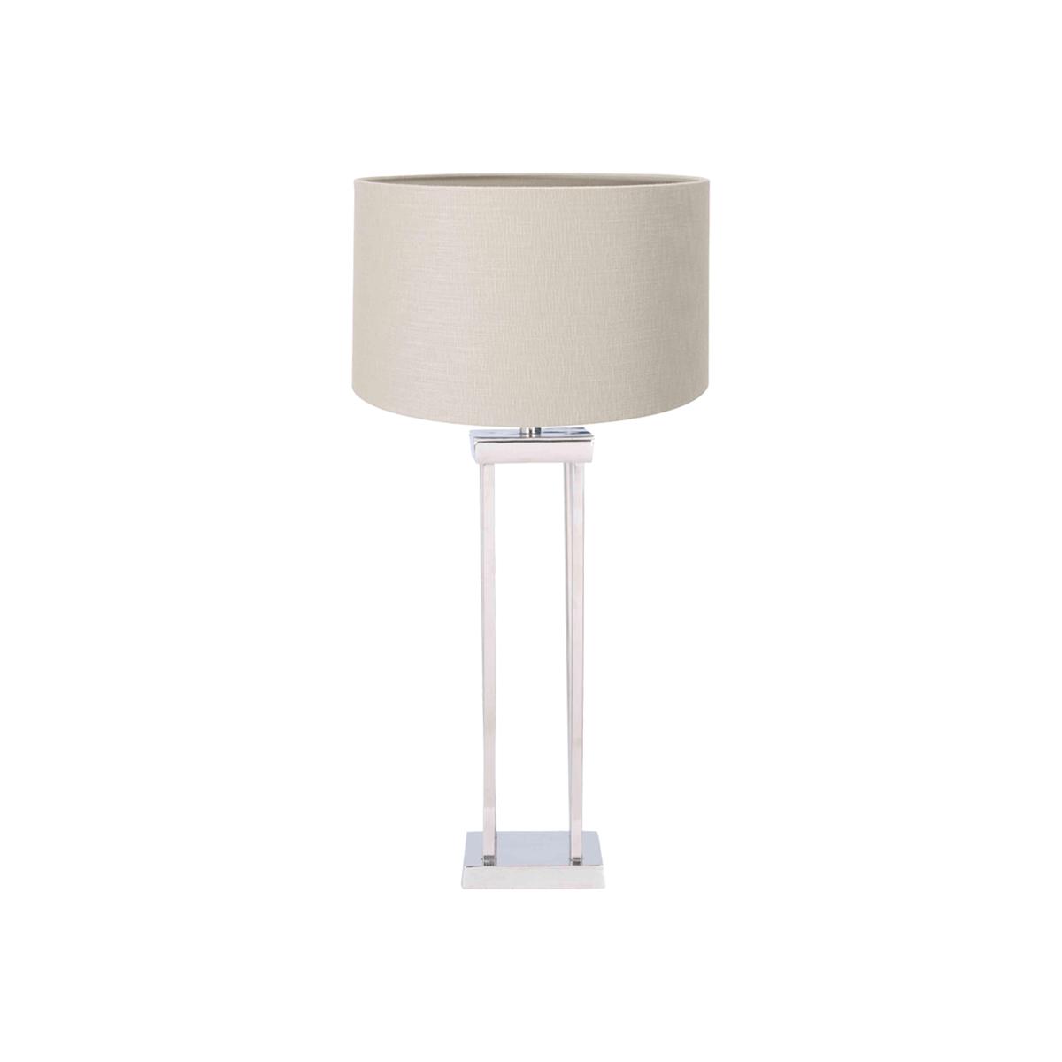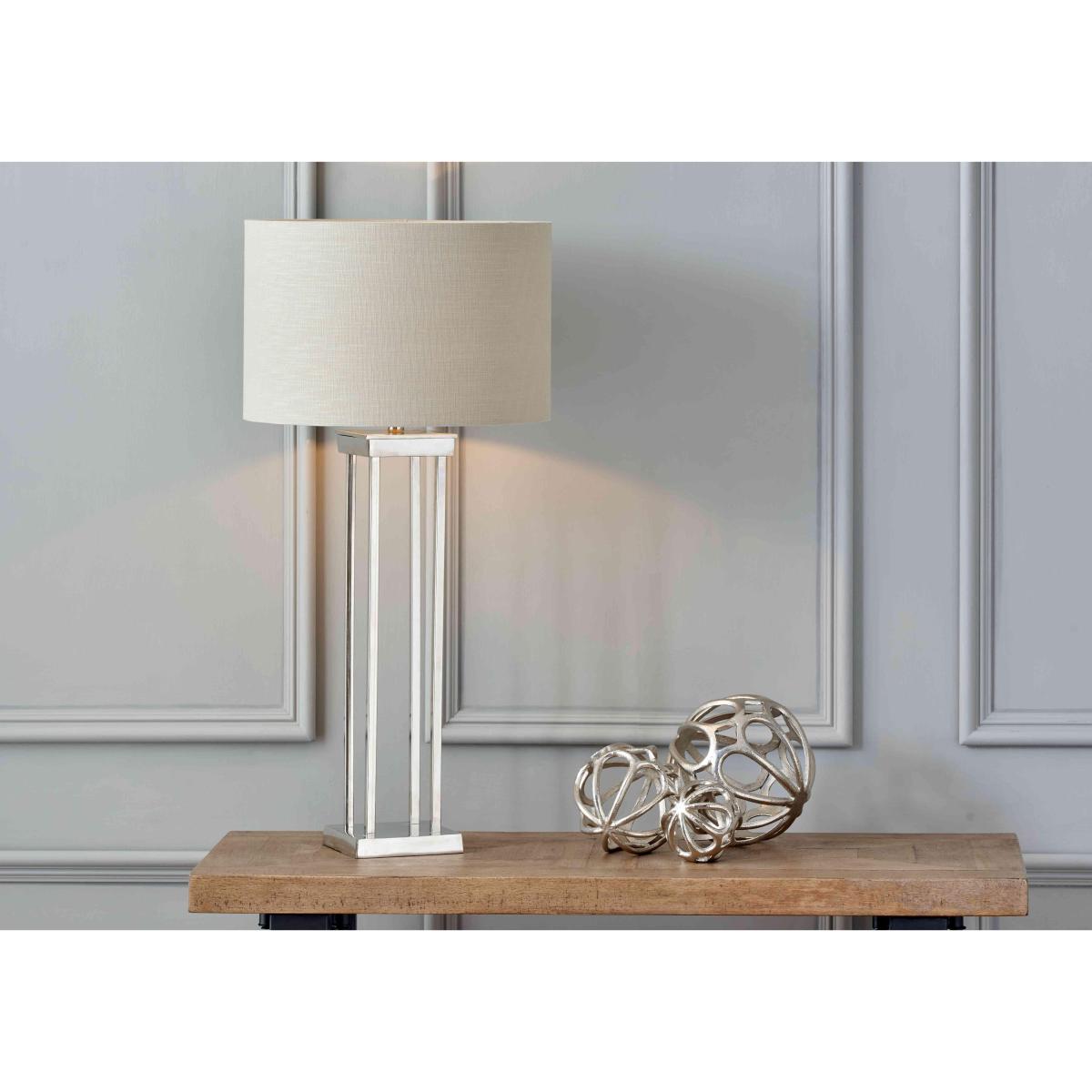 With its polished nickel finish and grey lamp shade, this understated table lamp conveys an air of quiet luxury. Why you'll love it Stylish table lamp for your contemporary home. Fashionable boutique-hotel style. Base comprises 4 posts on a square plinth. Polished nickel finish. Includes grey linen-effect lamp shade. Handmade in India. This table lamp is part of the Furniture Village lighting collection. What you need to know Iron base. Poly cotton lampshade. Supplied with 250 cm cable. Inline switch. Requires 1 x E27 60W bulb (not included). Dust with a soft, clean cloth. Unplug while cleaning. Dimensions Height: 84 cm (33 in). Diameter: 41 cm (16 in).