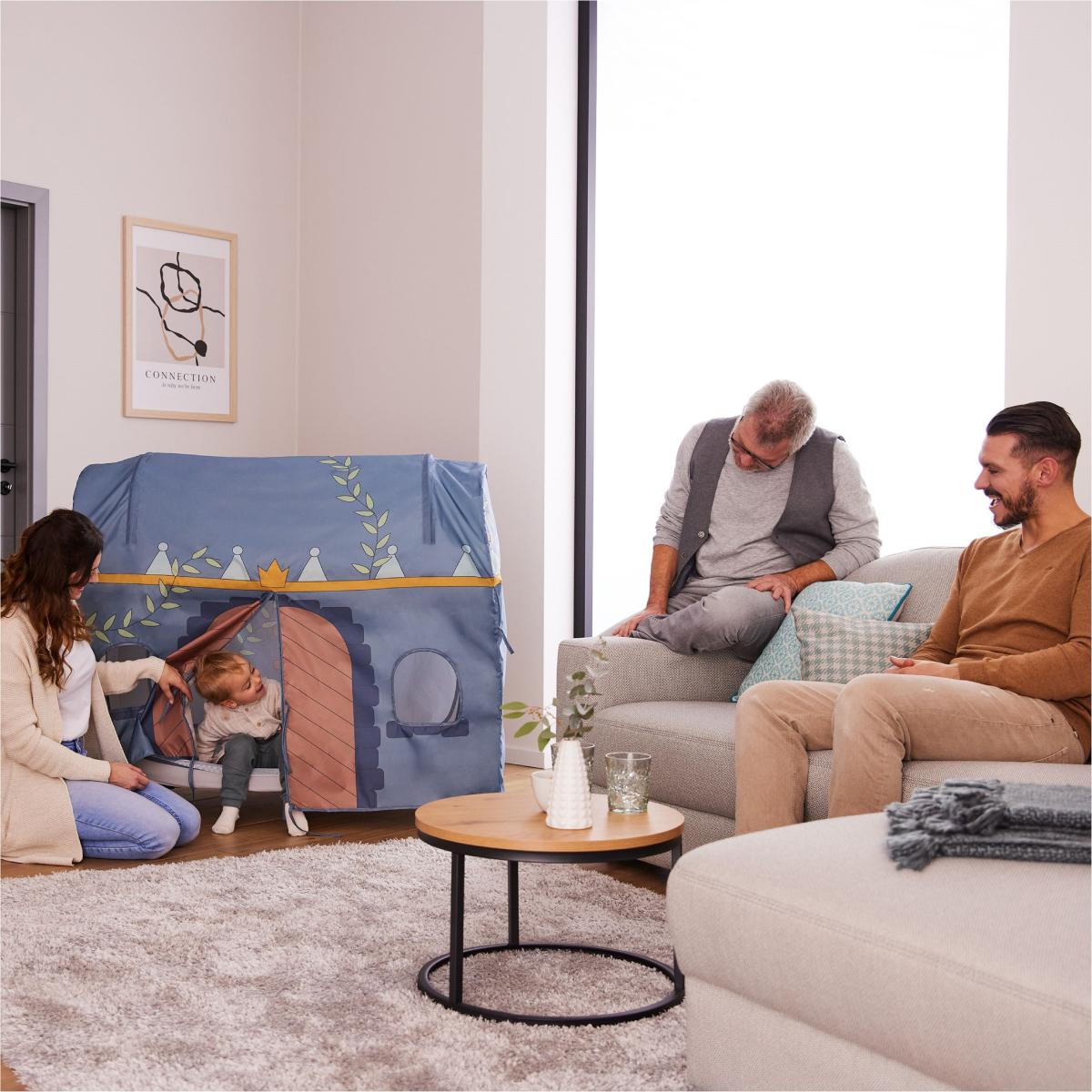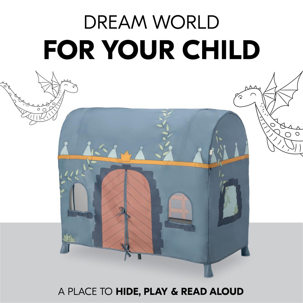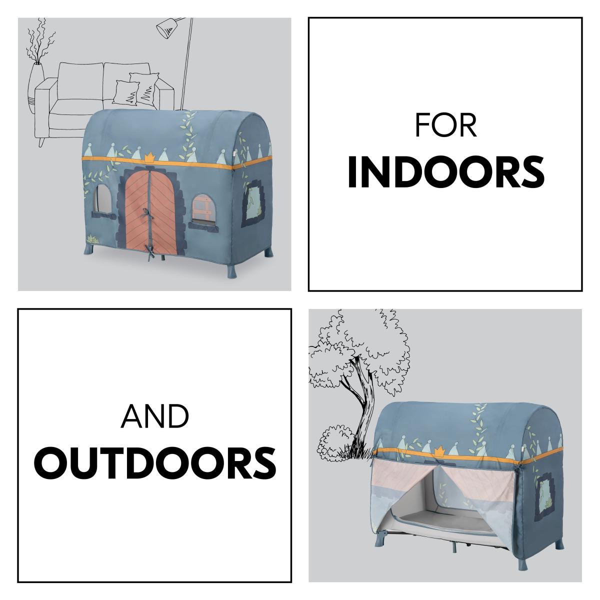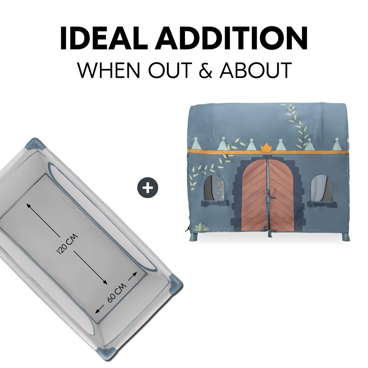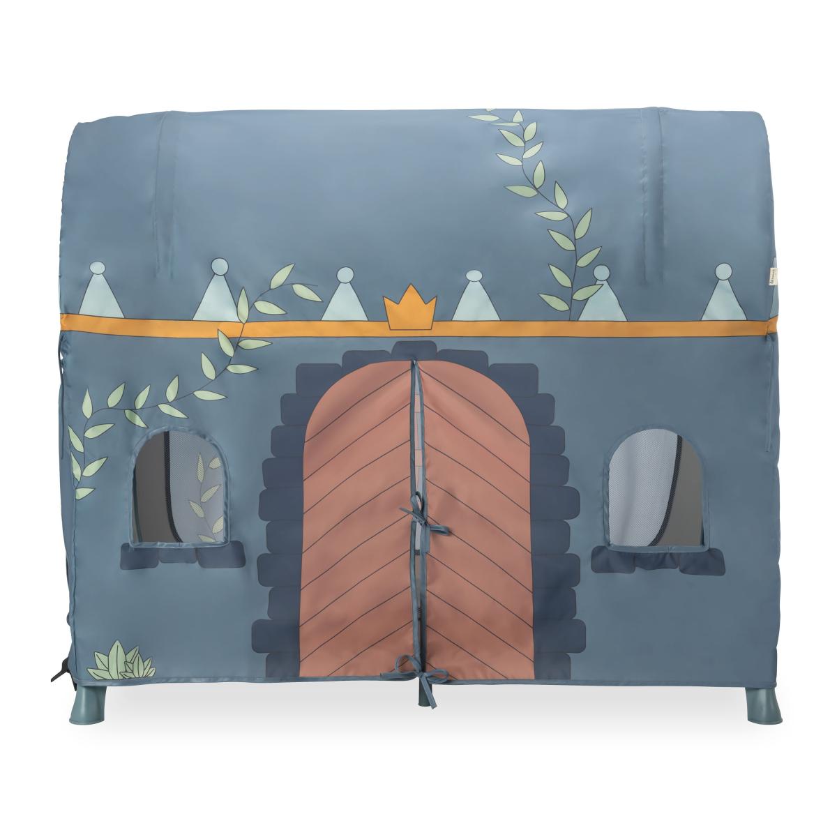 I love how the palace cover instantly turns a travel cot into a mini hideaway without clashing with existing décor. Its muted blue-grey hue and simple door motif work equally well in Scandi-inspired nurseries or more colourful, storybook-themed rooms, adding just the right amount of whimsy without overwhelming the space. For styling, layer a soft cream or charcoal throw across the “doorstep” to frame the entrance, then tuck in a few plush cushions inside for extra cosiness. Pop a small lamp or battery-operated fairy lights around the top edge and arrange a couple of themed toys or books nearby to complete the look.