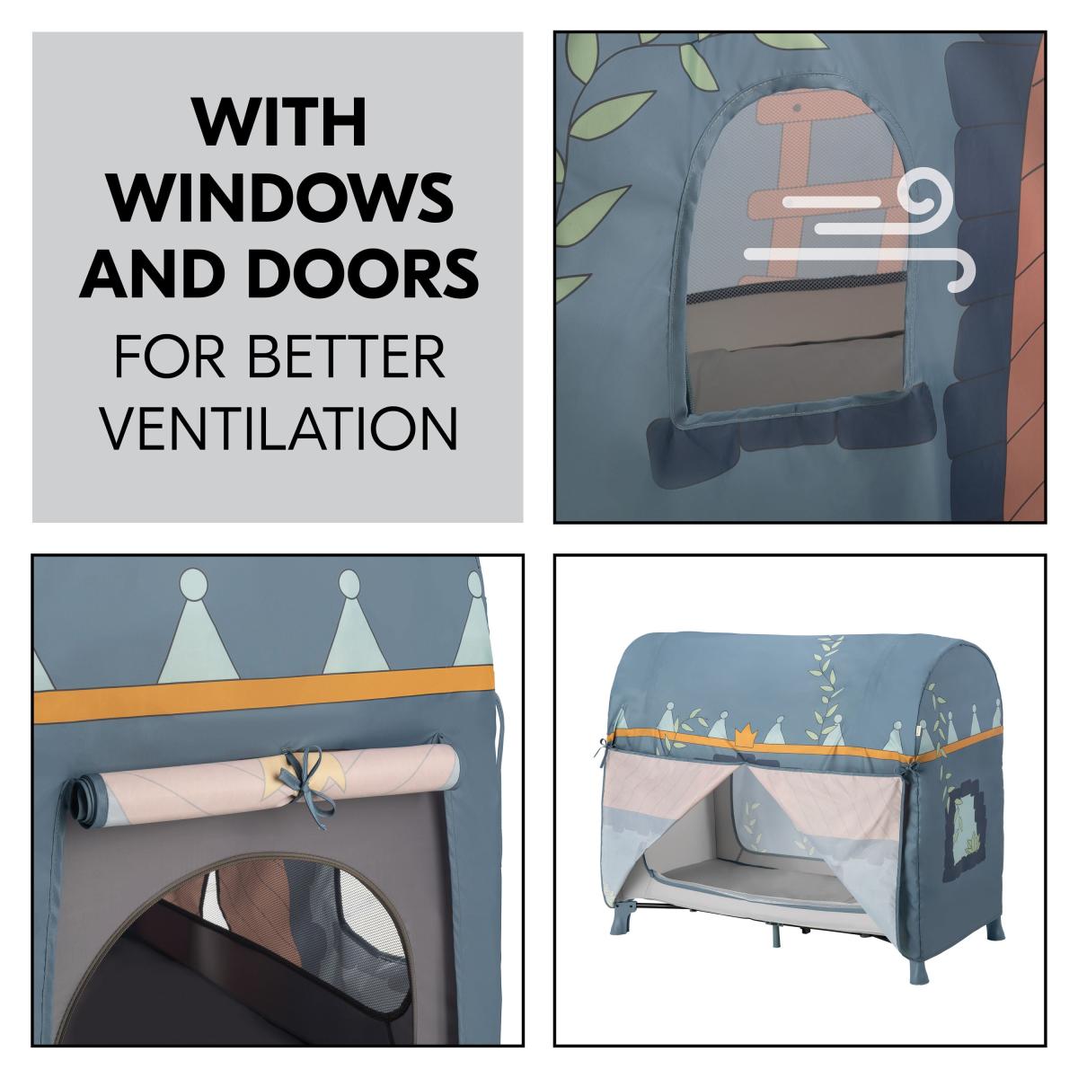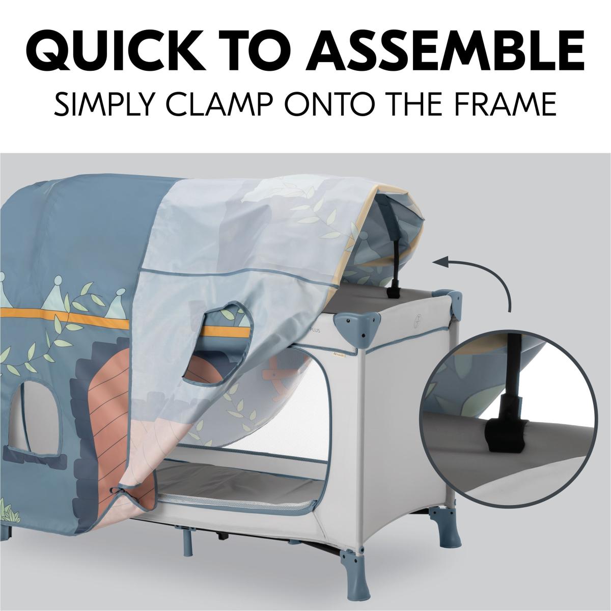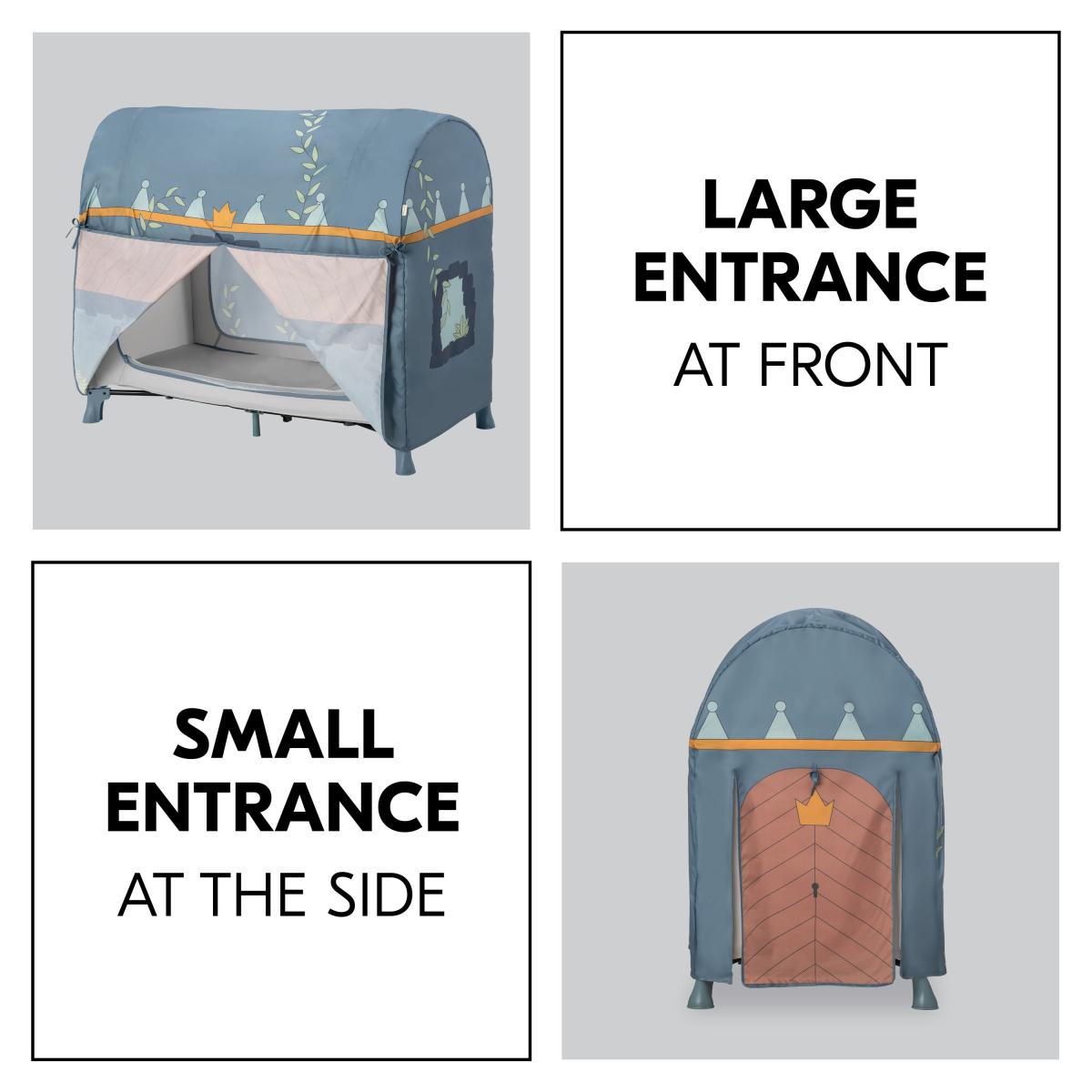 * Compatible with 60cm travel cots * Encourages imaginative play * Easy to wipe clean * Simple to set up Transform your child’s travel cot into a magical palace with this easy-to-attach play tent. Designed to fit perfectly onto travel cots with a lying surface of up to 60cm, it sets up in moments without the need for tools. With functional windows and doors, it encourages imaginative play while allowing air to circulate and keeping your little one in view. The large and small entrances make it easy for children to climb in and out independently, perfect for encouraging their sense of adventure. Durable and easy to clean, simply wipe it down to keep it fresh for endless playtime. A cosy, creative space for hiding, role-playing, or reading aloud wherever you go.