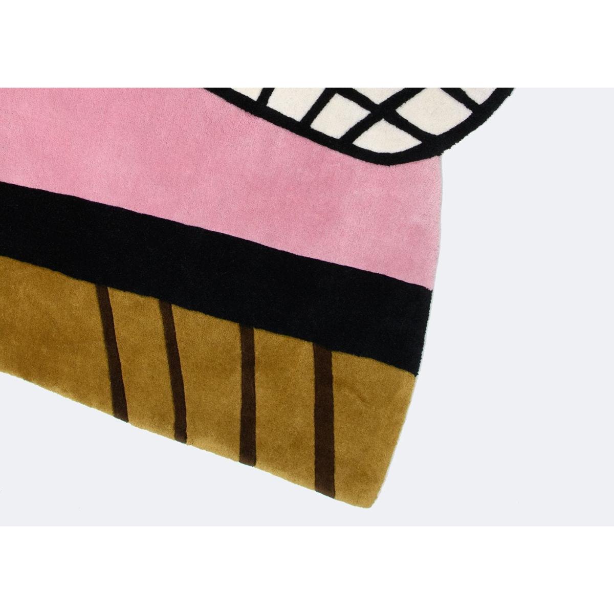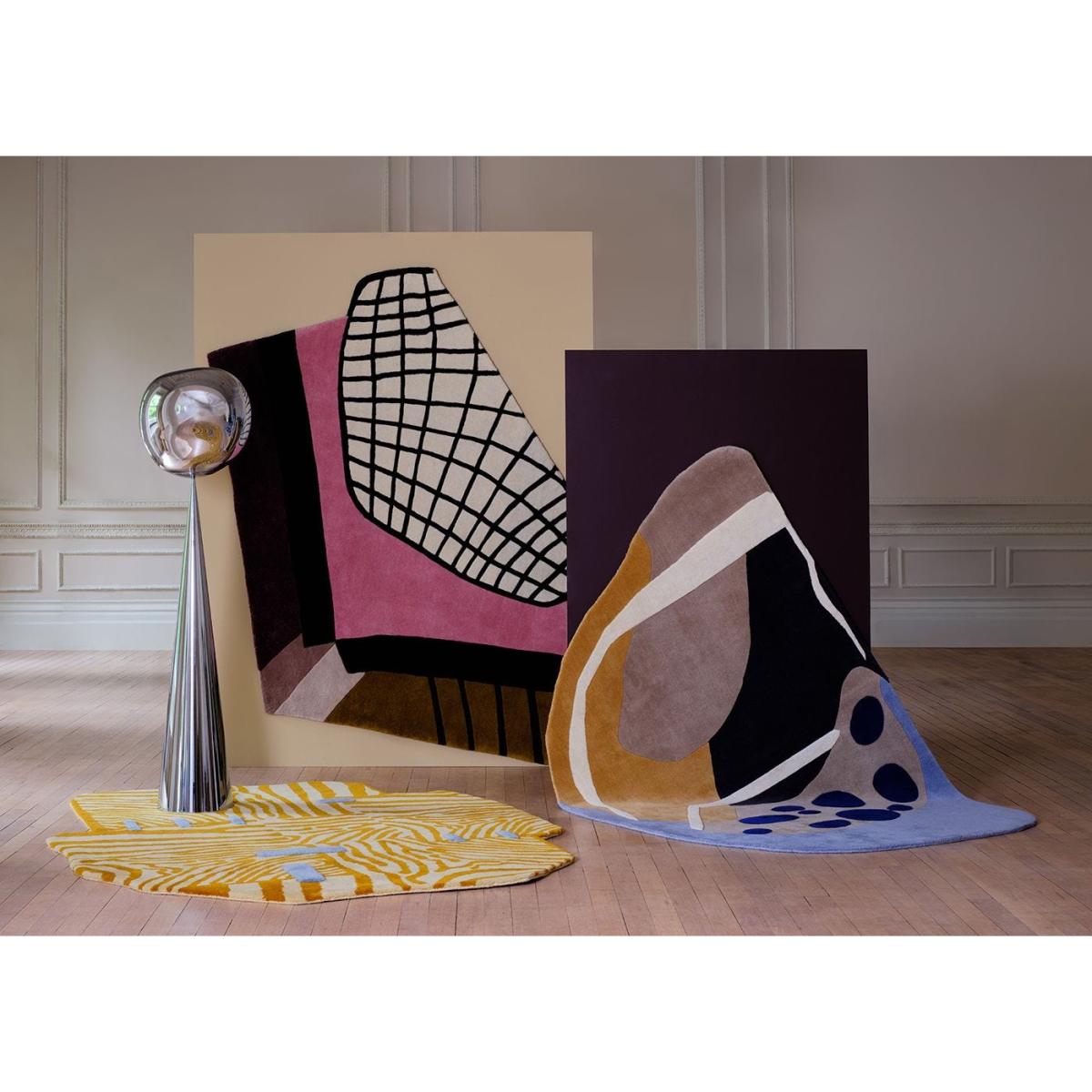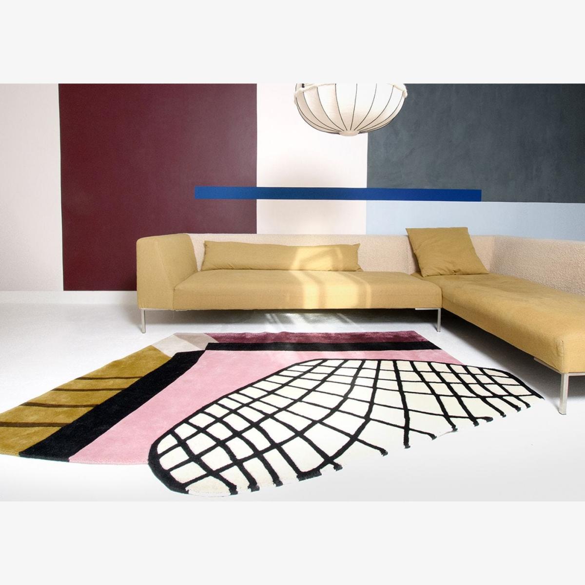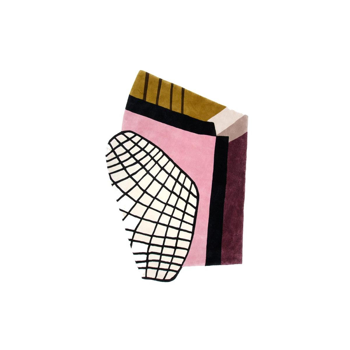 Perfect for creative and eclectic spaces, the Stairline Rug brings energy and personality to modern interiors. The rug's bold design makes it a true statement piece, with an asymmetrical shape and striking patterns that create a dynamic visual expression. Featuring a vibrant mix of pink, mustard, black, and deep burgundy, the rug blends geometric elements with organic flow, contrasting with a black grid pattern.