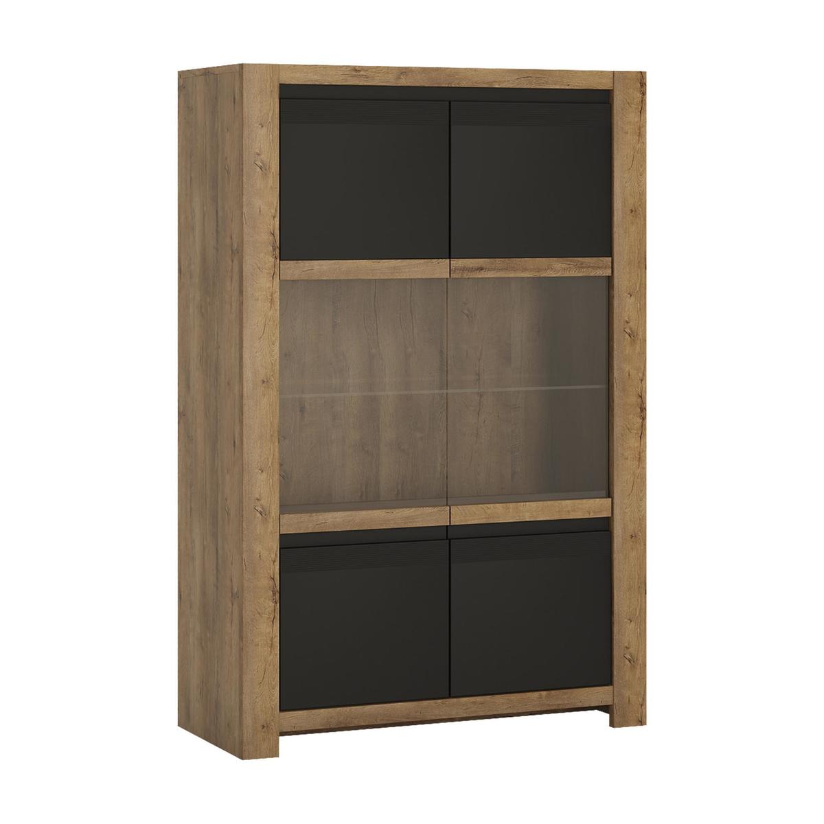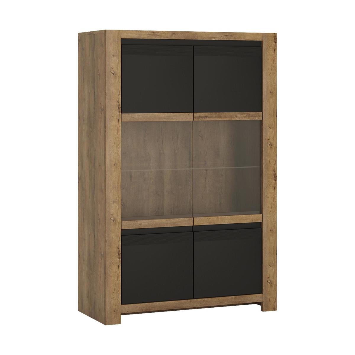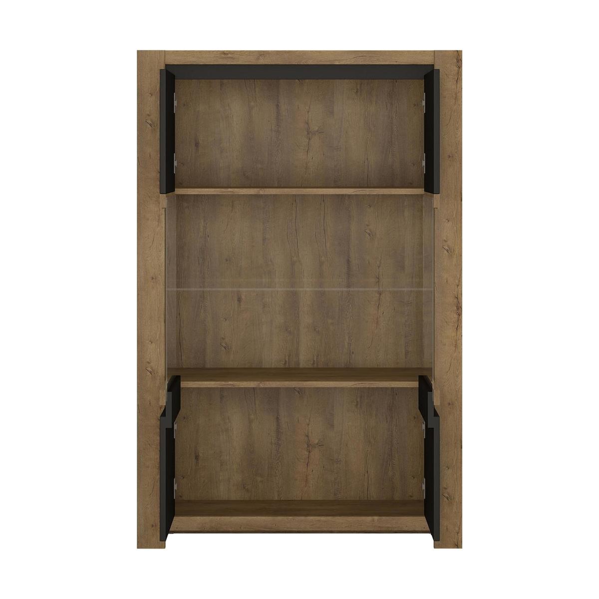 The Havana 2 Door Display Cabinet is sure to make a striking impact in your home and provide a stylish storage solution. This tall cabinet has internal adjustable shelving, plus a glazed display area to show your hidden treasures. The deep shade of Lefkas oak combined with the black matt fronts makes the Havana collection very unique and will provide you with a warm interior with a touch of harmony.\n\nPlease note, unfortunately we cannot deliver this item to the Channel Islands.