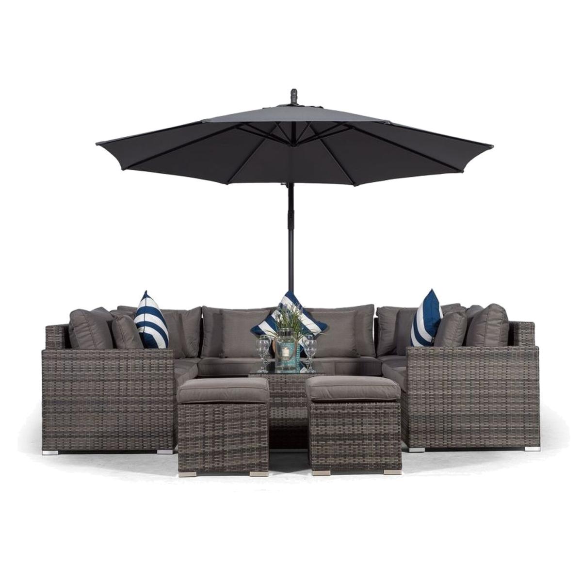 The Havana rattan corner sofa conversation set consists of 8 modular seats, coffee table, 2 stools, 3m parasol protective covers, this set can seat 10-12 people. Due to its modular design the Havana rattan sofa set can be configured in a variety of combinations from U to L shaped to suit your needs. Giardino rattan garden furniture is available in an ultra stylish mixed grey or the stunning mixed brown weave. The end seats of this rattan patio set feature adjustable bases which effortlessly convert the sofa into comfortable reclining sun loungers. The versatile Havana U shaped rattan sofa set has got everything you need to enjoy long warm summer days. Giardino rattan garden furniture features multi-density foam and fiber padded cushions making this outdoor rattan sofa set super comfortable. Featuring 10cm thick seat cushions and 20cm thick back cushions, the multi density fillings enhance the shape and structure providing comfort and support. Our special water-resistant fabrics protect your rattan garden sofa set cushions from showers and all cushions feature removable covers for easy maintenance. This rattan garden furniture is made using aluminium frames and polyethylene all weather rattan, making this outdoor rattan sofa strong, light-weight and corrosion resistant. Each modular section comes fully assembled and the impressive synthetic wicker furniture material is UV resistant, able to withstand temperatures from -15 degrees celsius to 60 degrees celsius. At Thats Furniture, we pride ourselves on meeting all our customers' individual needs. Along with our impeccably designed outdoor furniture, our dedication to customer satisfaction means our rattan garden furniture comes with a full 12-month manufacturers warranty and 5 year extended warranty on the internal frames, backed by our no quibble 30 day money back guarantee so you can buy your garden furniture with complete confidence.