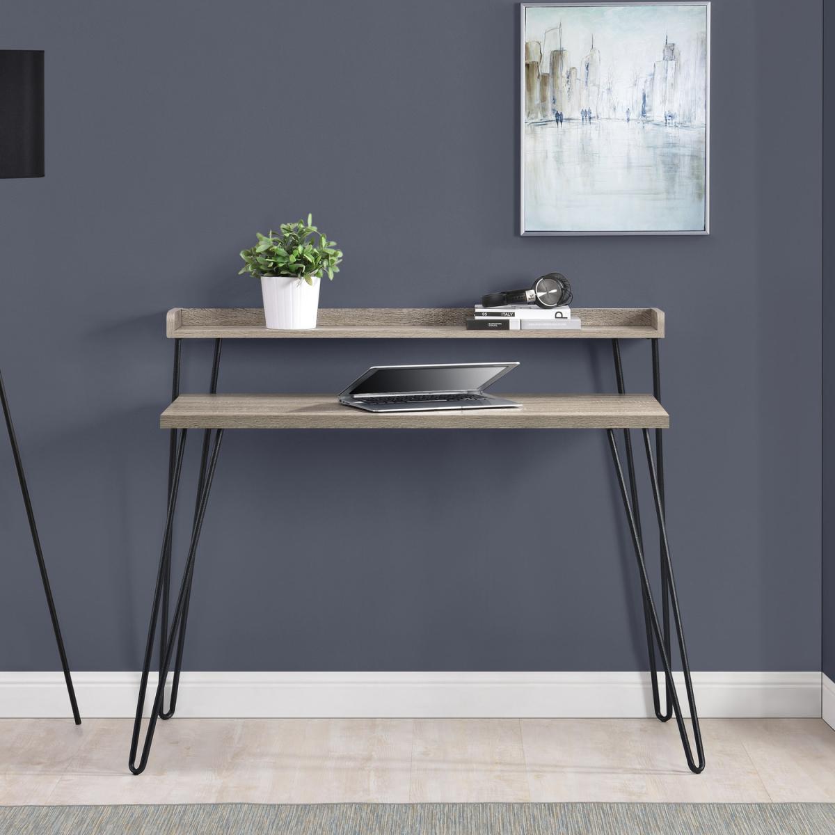 Mix industrial and modern styles together to get the Haven Retro Desk with Riser. This Desk is perfect for tight spaces with its small footprint and offers 2 levels of desk space with the added riser. Use the Haven Desk in a home office or create an office space that works for you anywhere in your home. The desktop is large enough to hold your laptop, notebooks, and office essentials while the riser can be used to keep items close by but out of your way. The metal hairpin legs are a fun throwback to popular mid-century design. The grain finish coordinates with almost any decor. The Haven Retro Desk with Riser requires minimal assembly upon delivery.